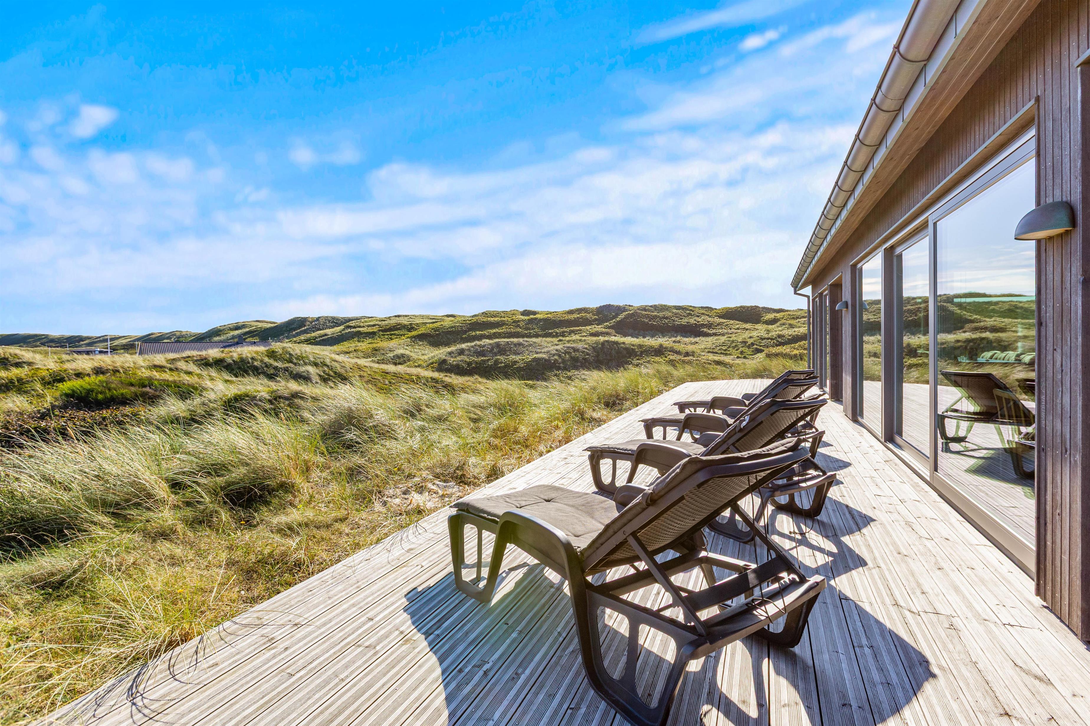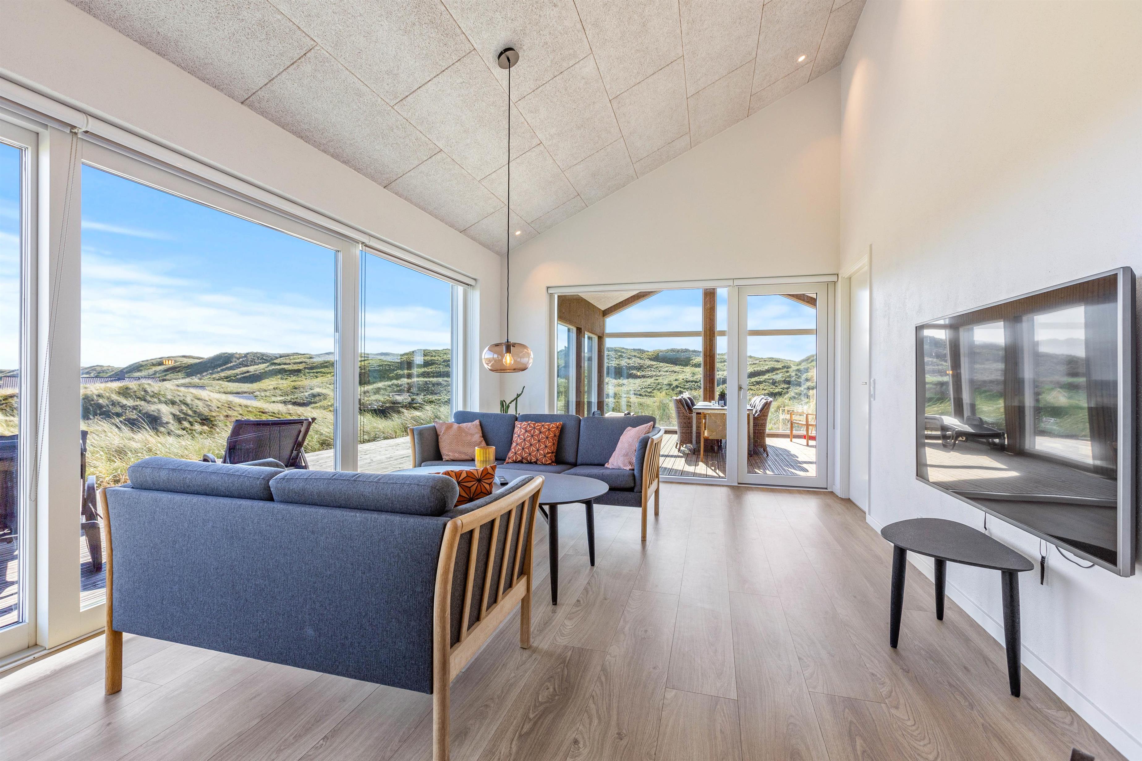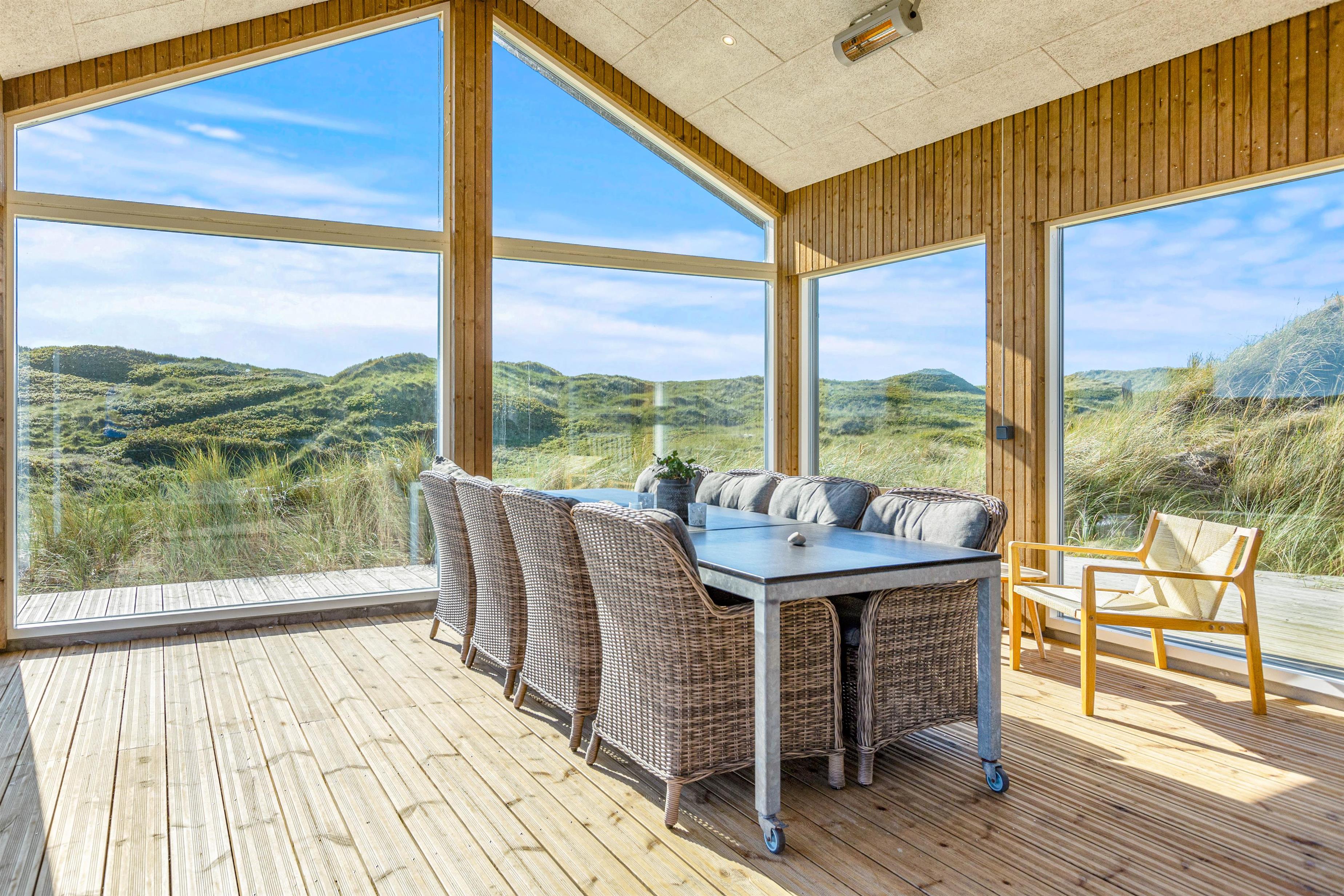 Med udgang fra stuen mod vest finder I sommerhusets udestue, der med sin unikke beliggenhed har panoramaudsigt over klitterne hele vejen til Ringkøbing Fjord.