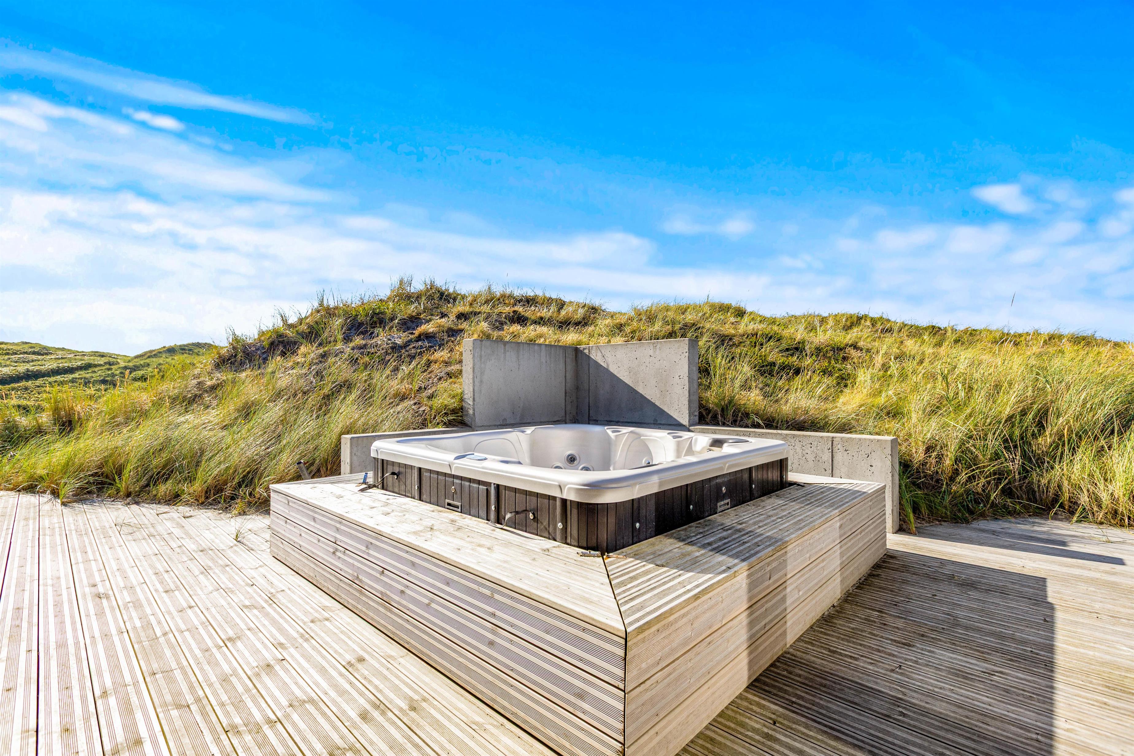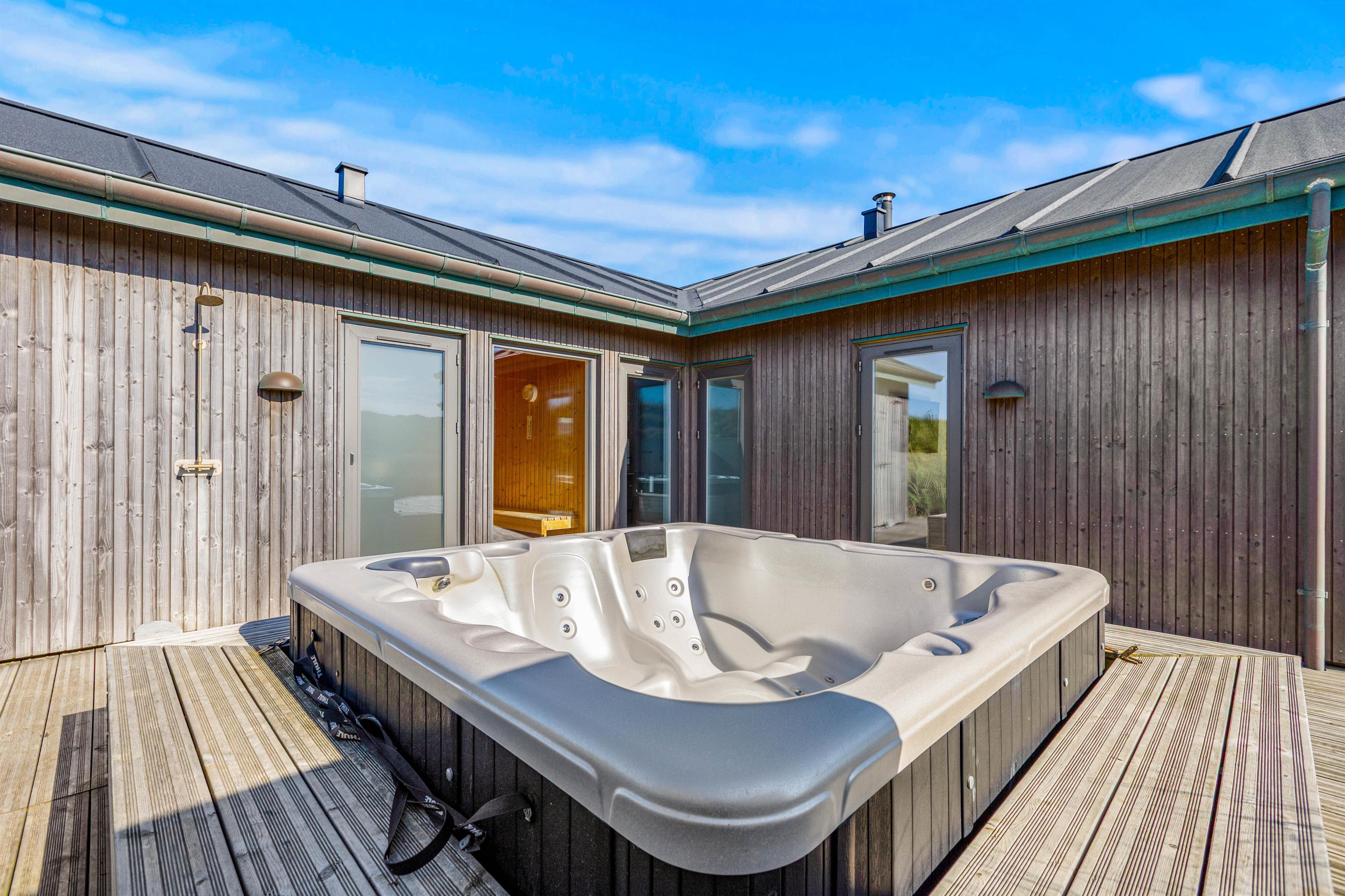 Mod vest ligger desuden den dejlige terrasse med udendørs spabad til 5 personer, og herfra er der indgang til det ene af feriehusets badeværelser med sauna – selvfølgelig også med gulvvarme.