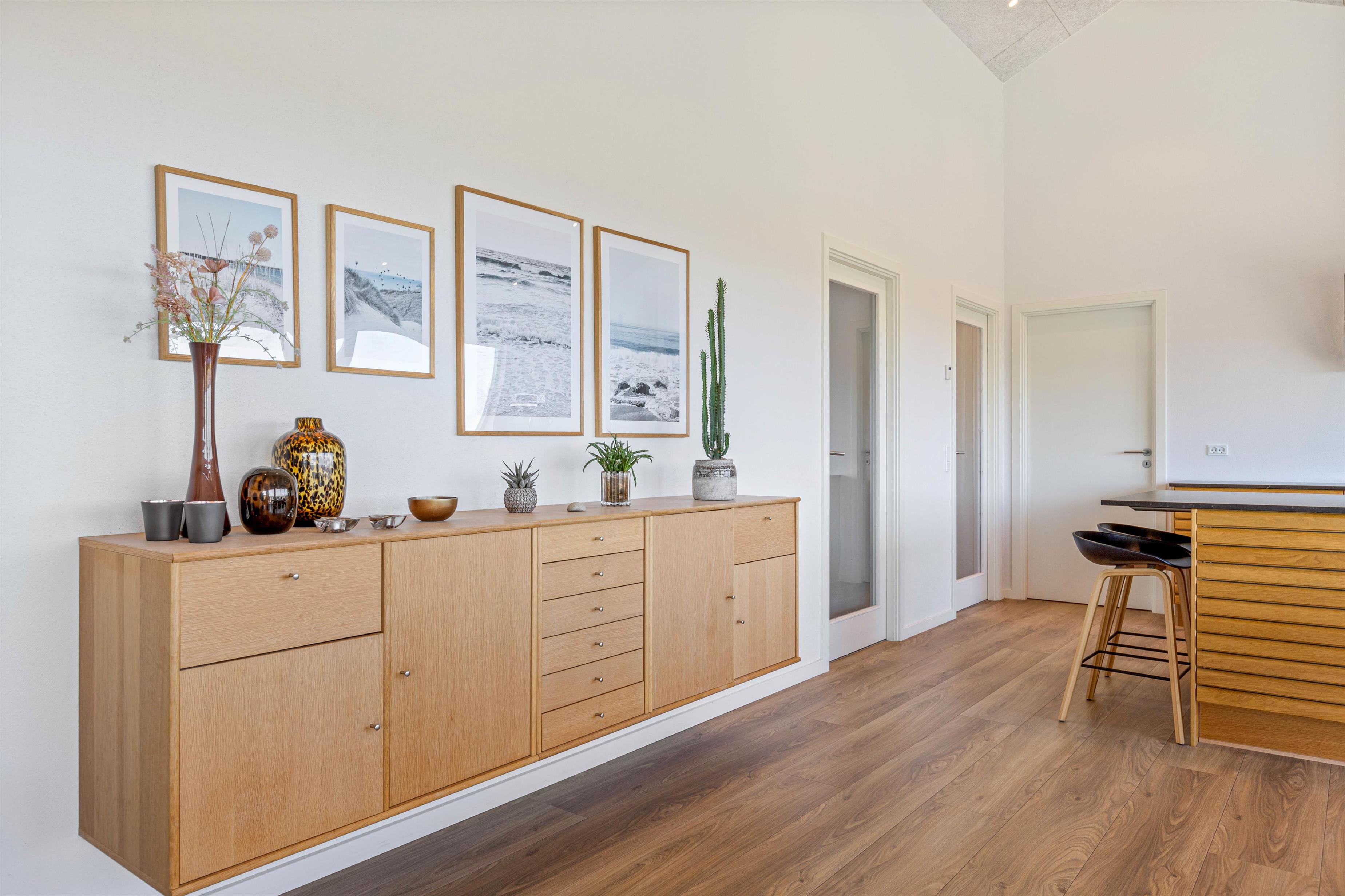 Sommerhuset byder på moderne indretning, og feriehusets faciliteter lader intet tilbage at ønske. Det moderne køkken ligger i åben forbindelse med den dejlige store stue, og der er selvfølgelig gulvvarme i hele køkkenalrummet og stuen. I køkkenet står blandt andet induktionskomfur og opvaskemaskine til jeres rådighed, så det bliver en leg at tilberede dagens måltider. Vasketøjet klares også i et ruf, da der selvfølgelig er både vaskemaskine og tørretumbler i feriehuset.
