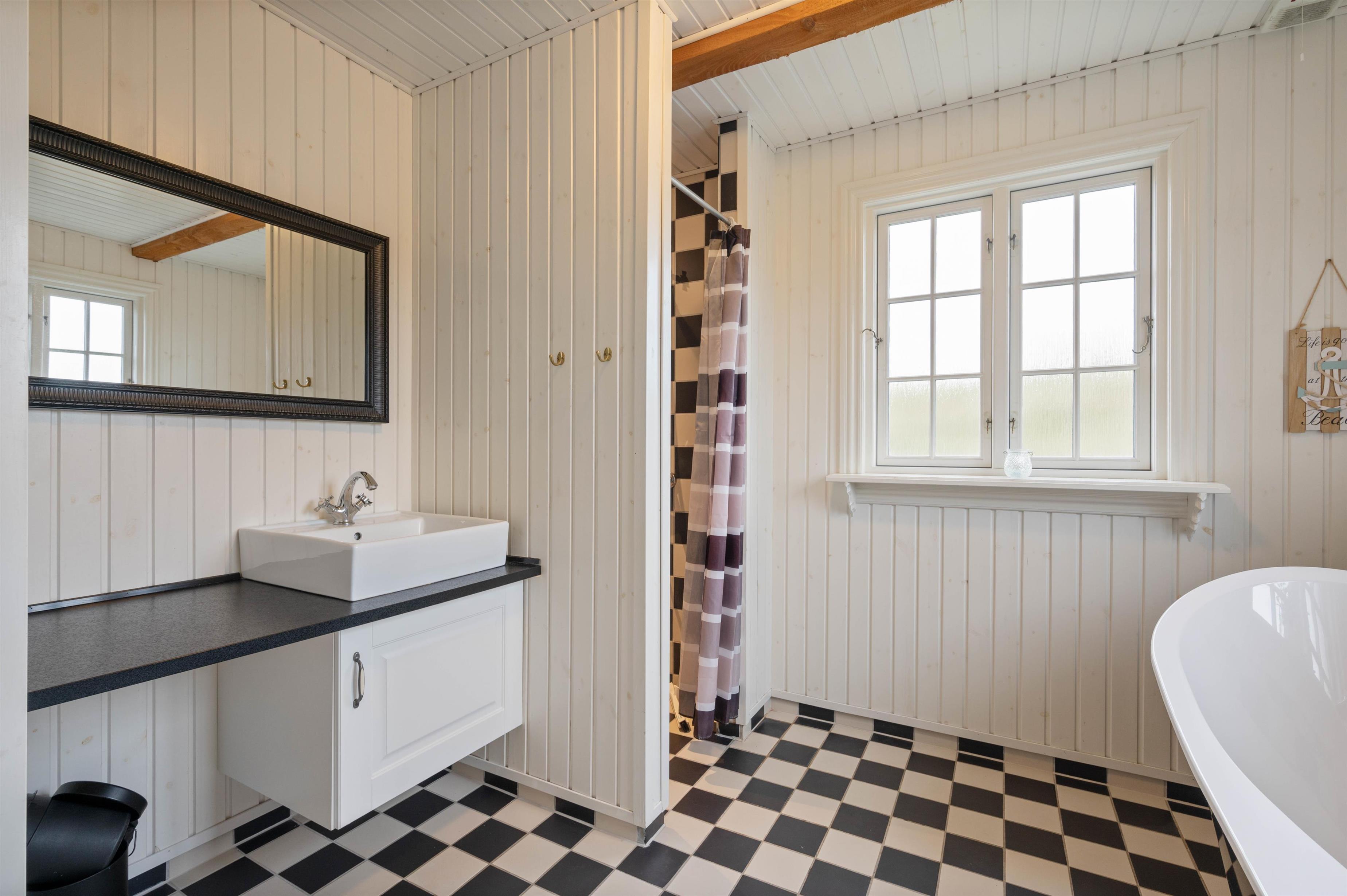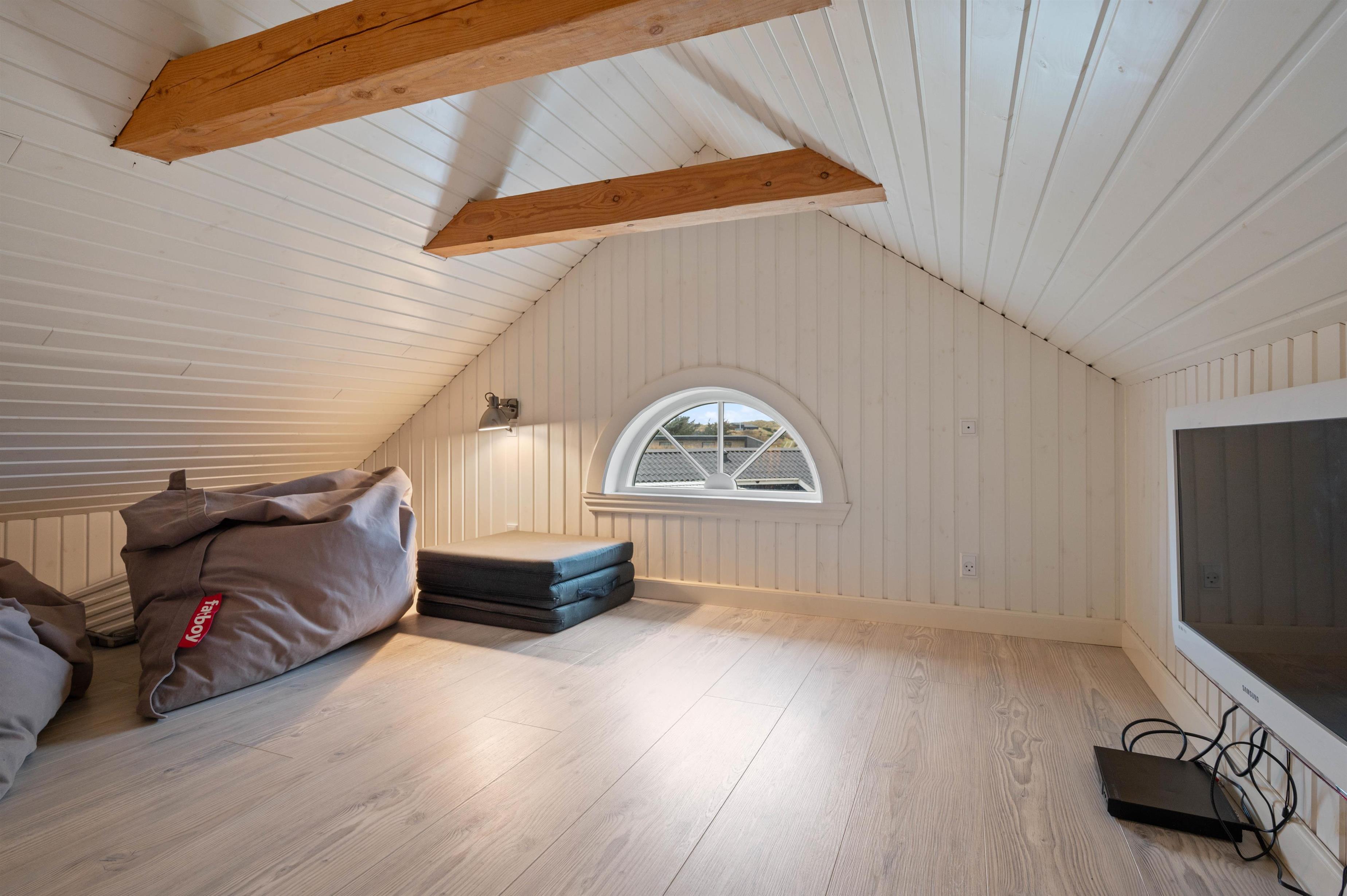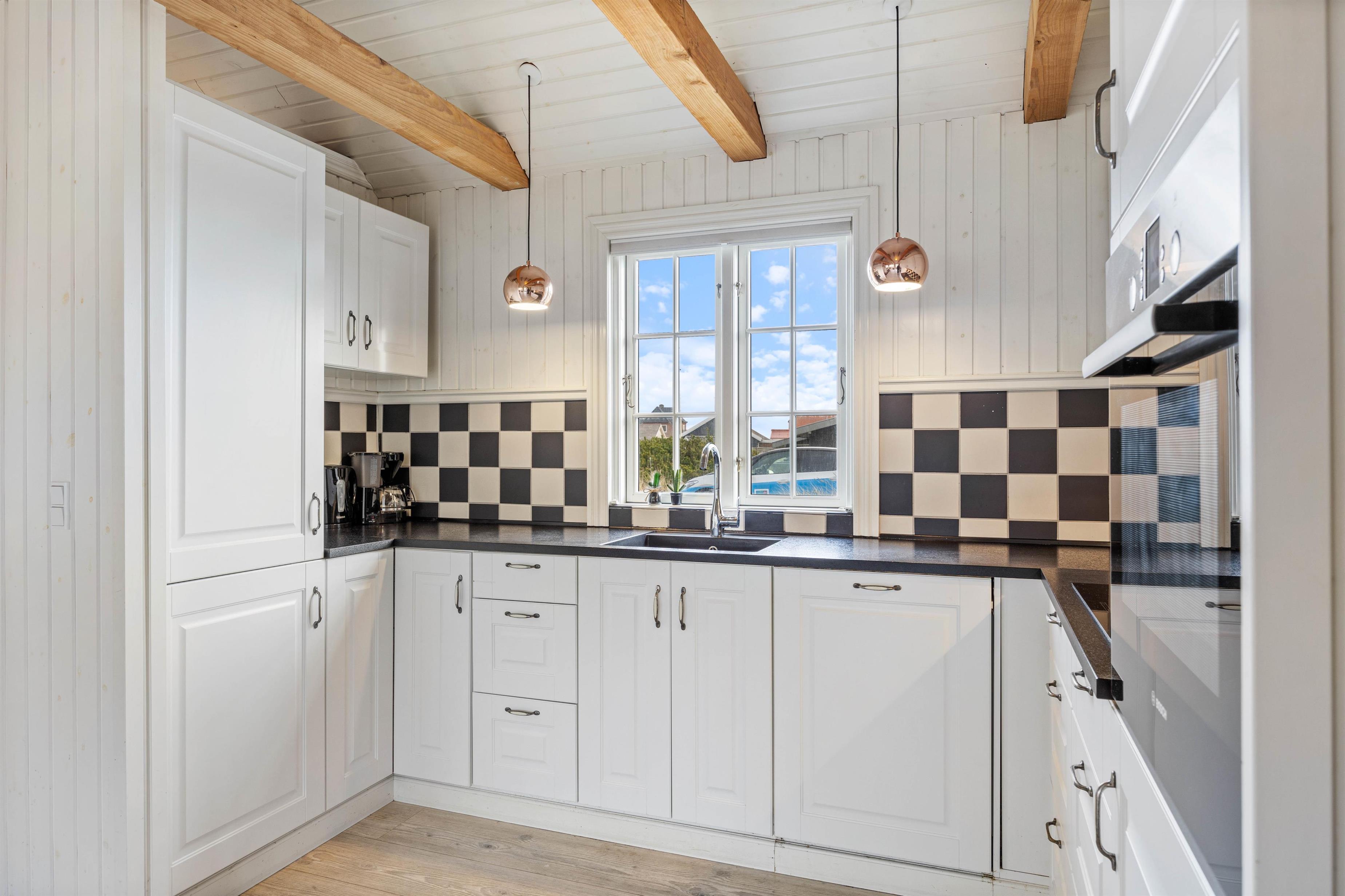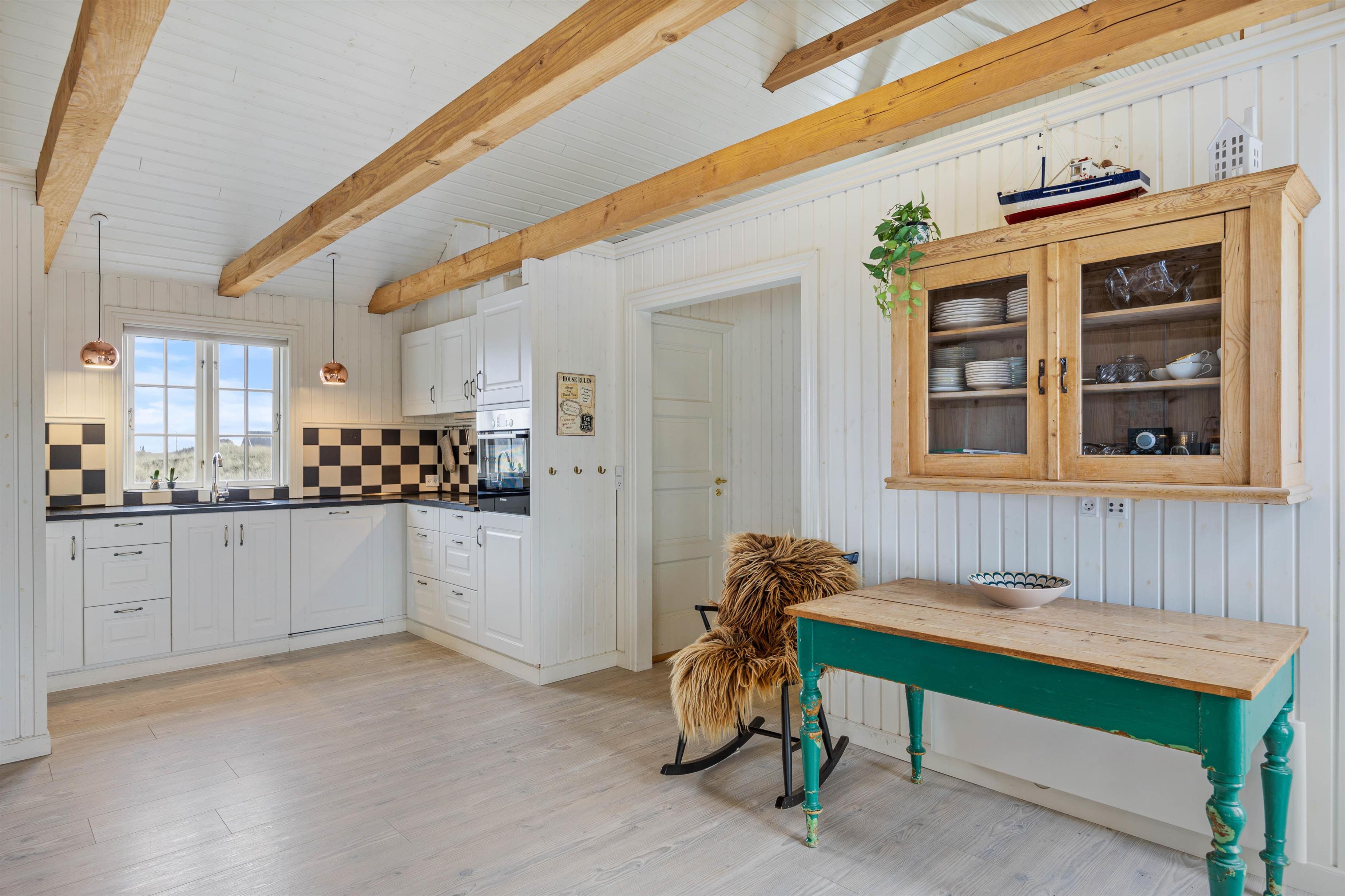 Der er et skønt køkken, hvor du kan tilberede lækre måltider eller tilbehør til til grillkødet. Hyg dig med en god bog på den brede bænk i karnappen, og nyd flammerne i den store pejs som er centralt placeret i den smukke rum. Den store pejs, de fritlagte bjælker og det fantastiske lysindfald i husets centrale rum, gør det til en skøn oase, som du bare ikke har lyst til at tage hjem fra. Karnappen med den brede bænk er perfekt til skønne måltider, lange spilleaftner og hygge med venner og familien.