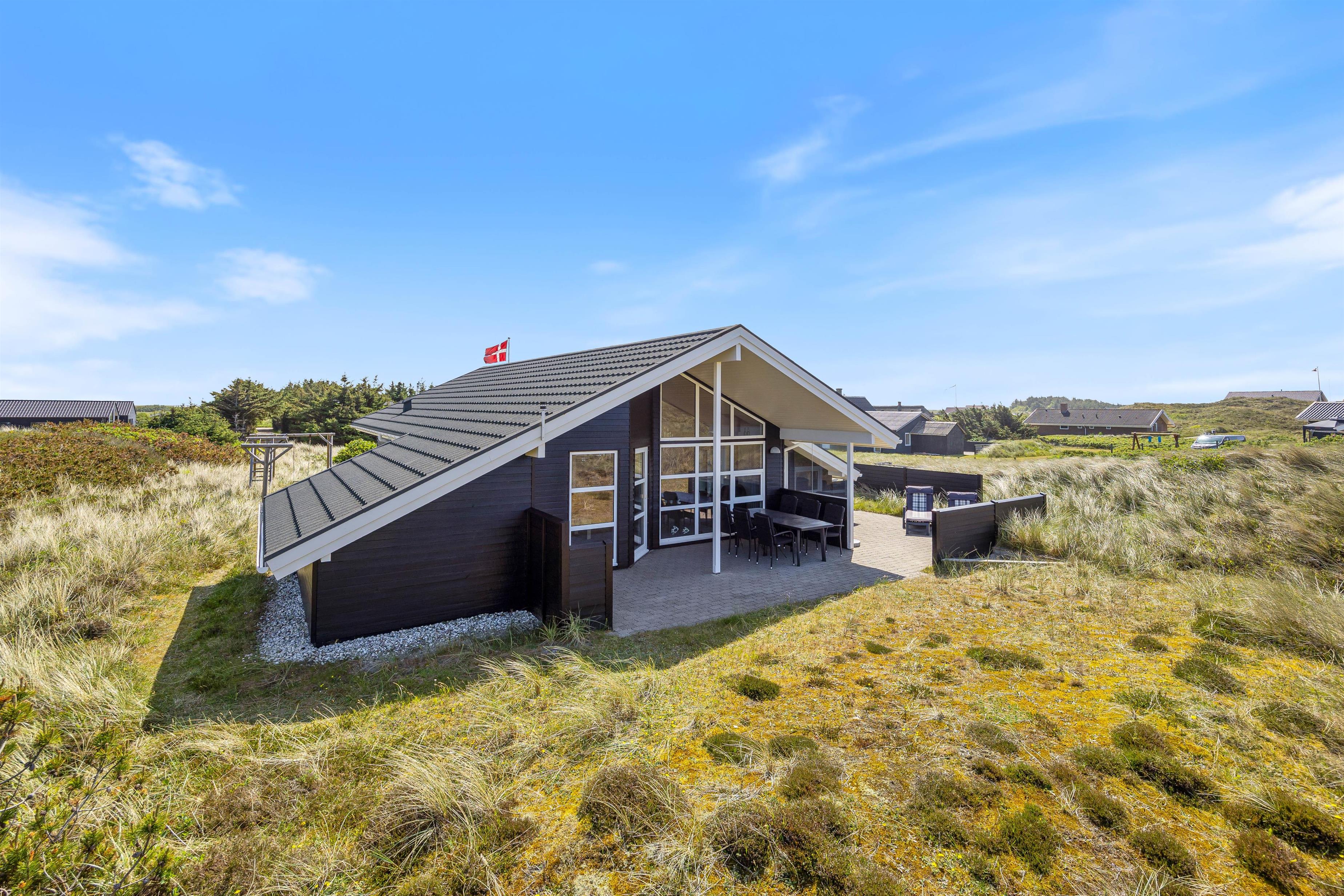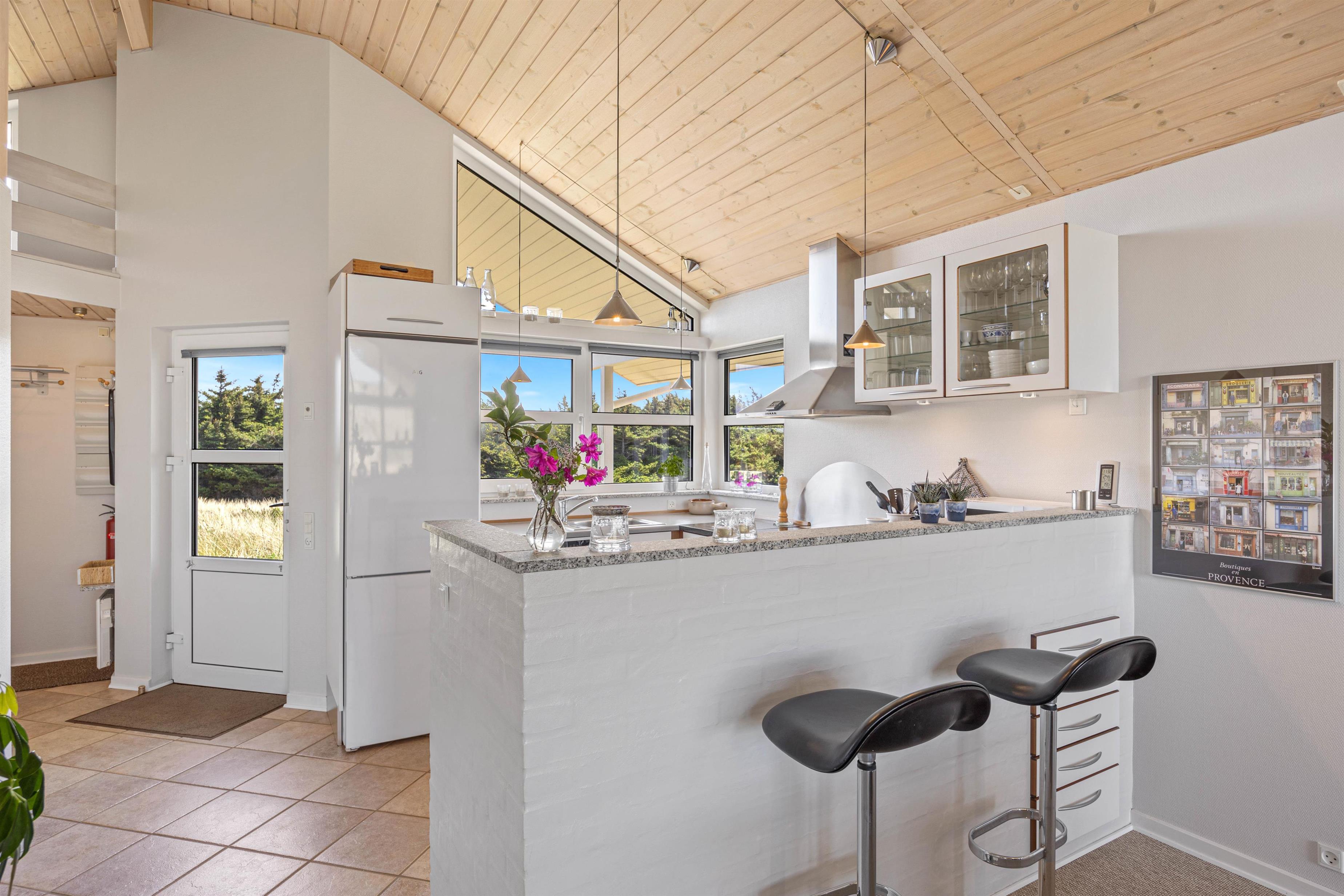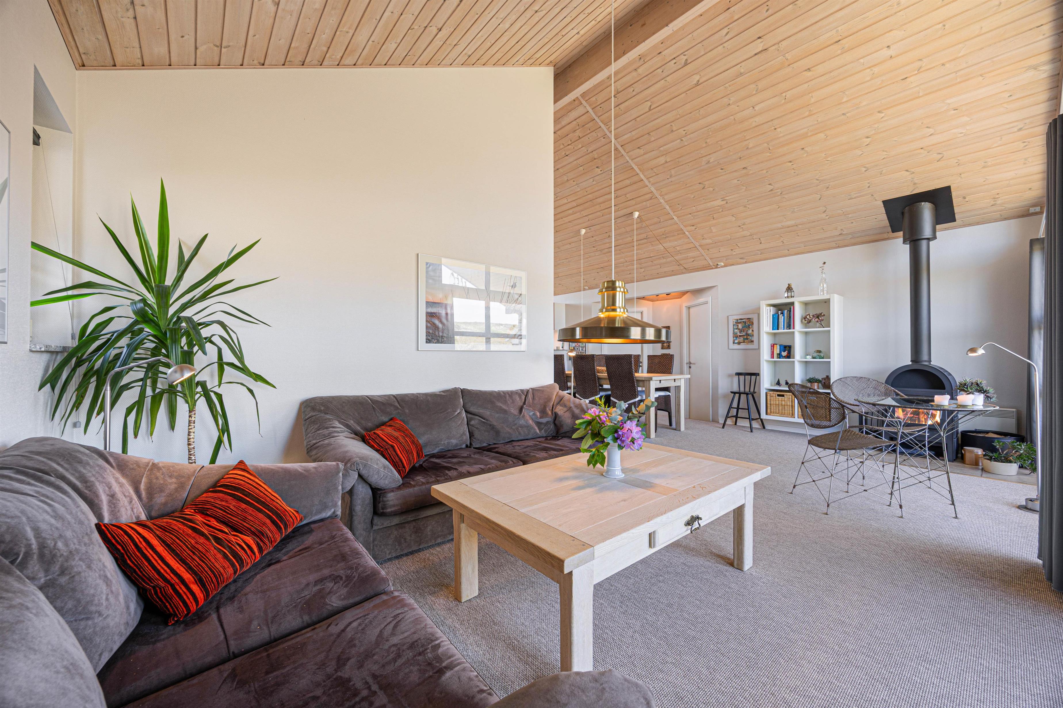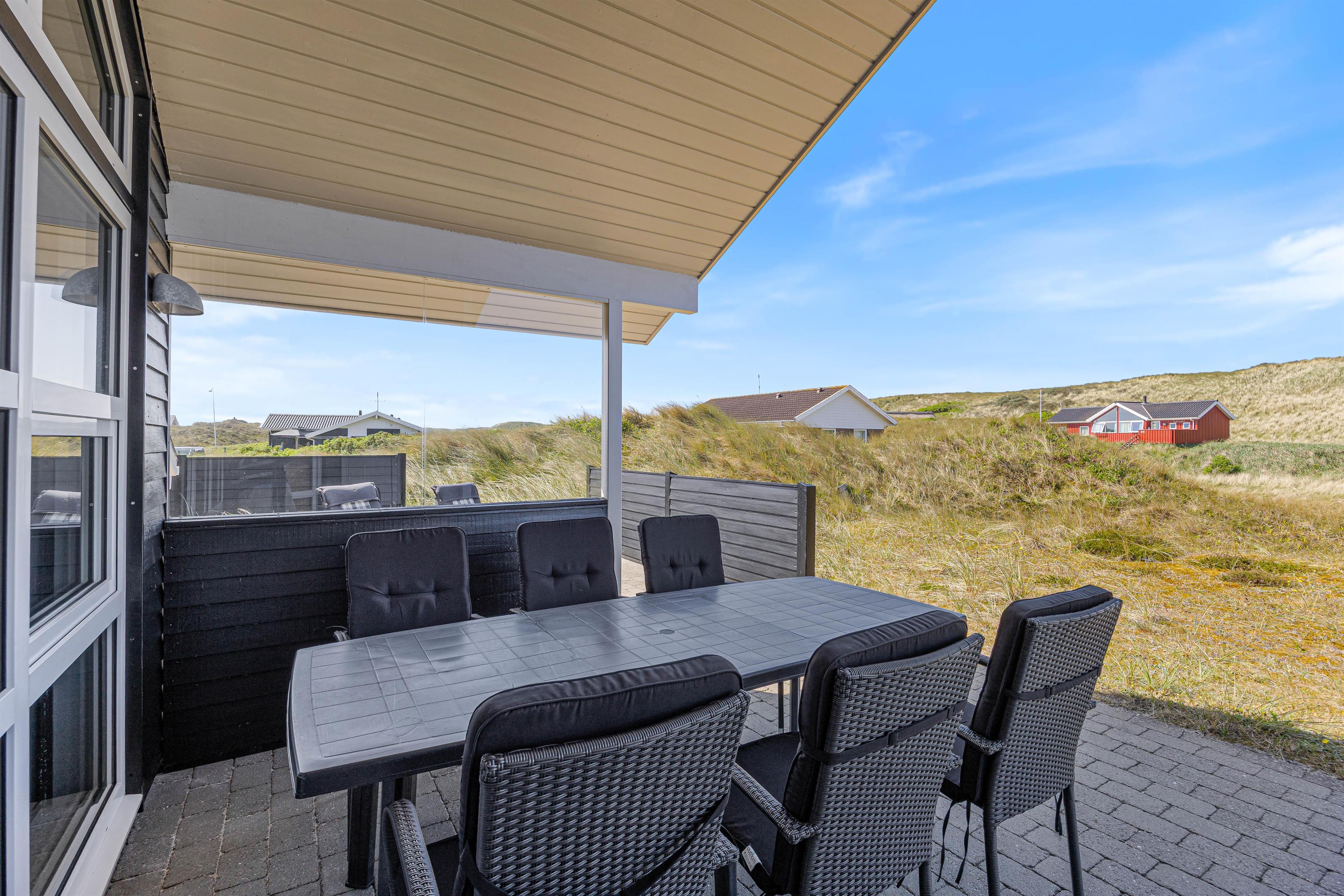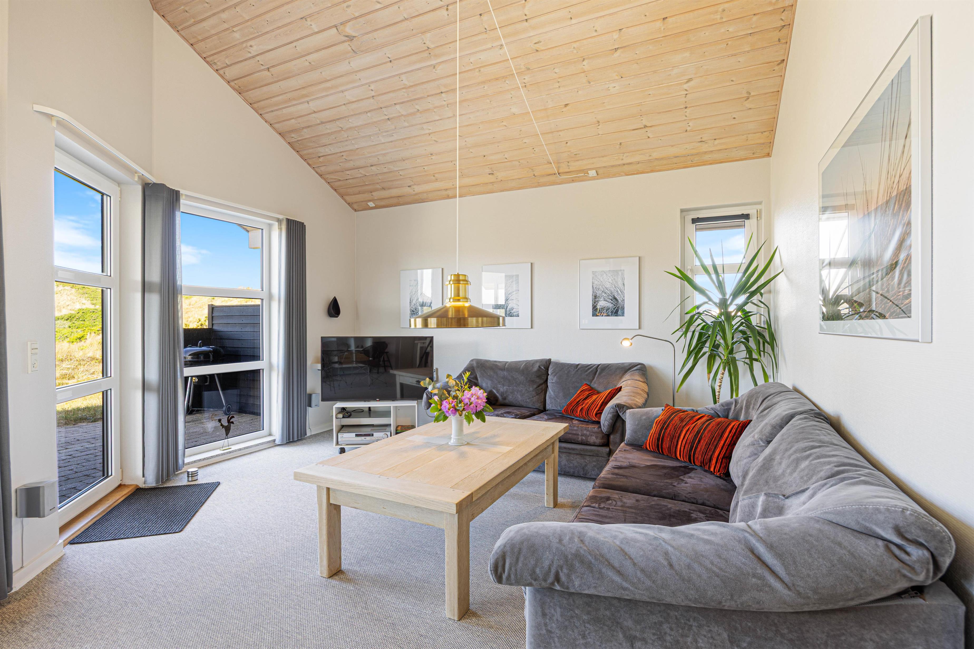 Ferie er lig med afslapning, gode middage og ro. I dette feriehus er der rig mulighed for dette, og her er plads til at I kan være sammen som familie. Indretningen i sommerhuset er hyggelig, og de mange personlige elementer formår at skabe en hjemlig og indbydende stemning. I det åbne køkken med stue kan I samles hele familien og nyde en lækker middag med udsigt til de grønne klitter.