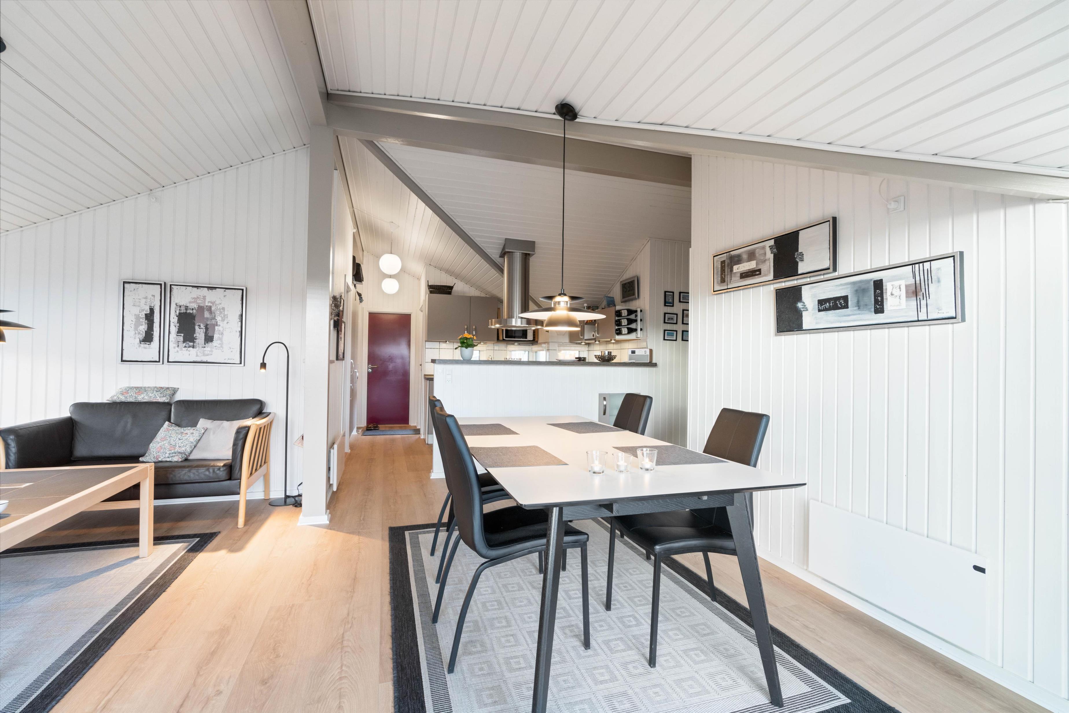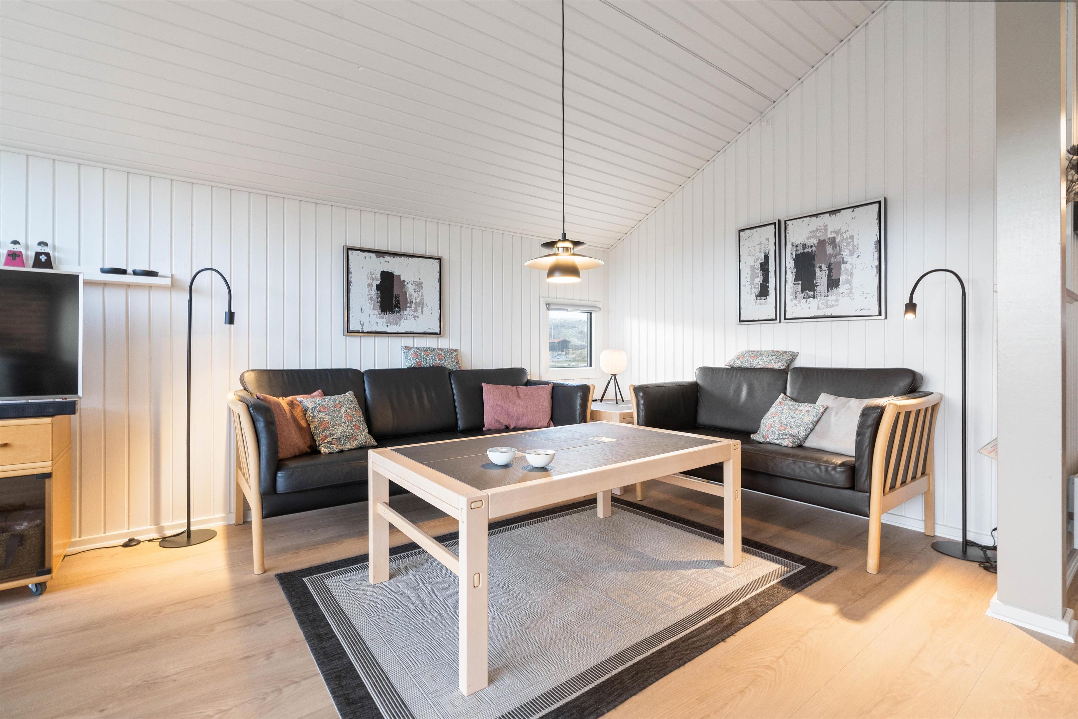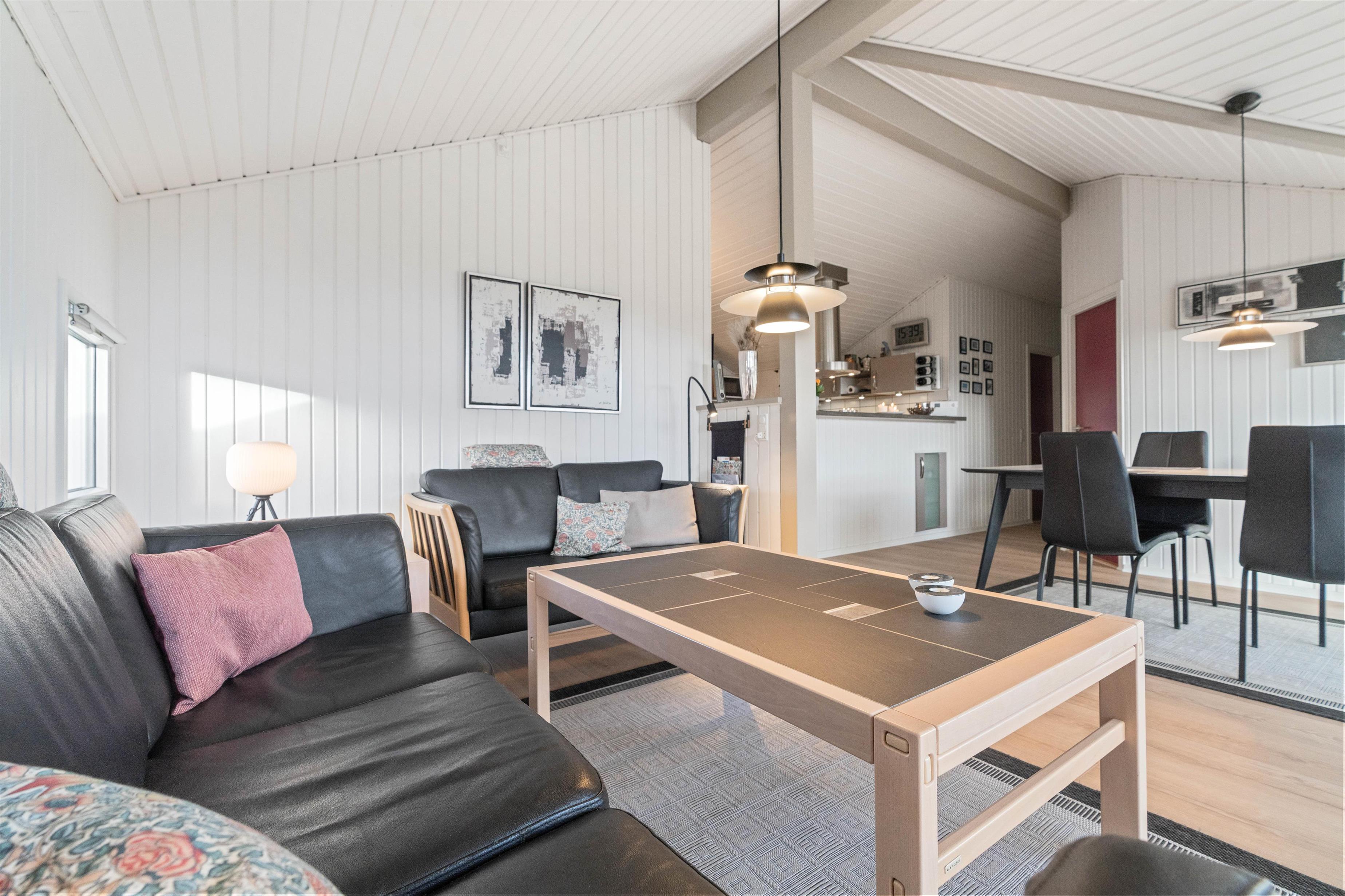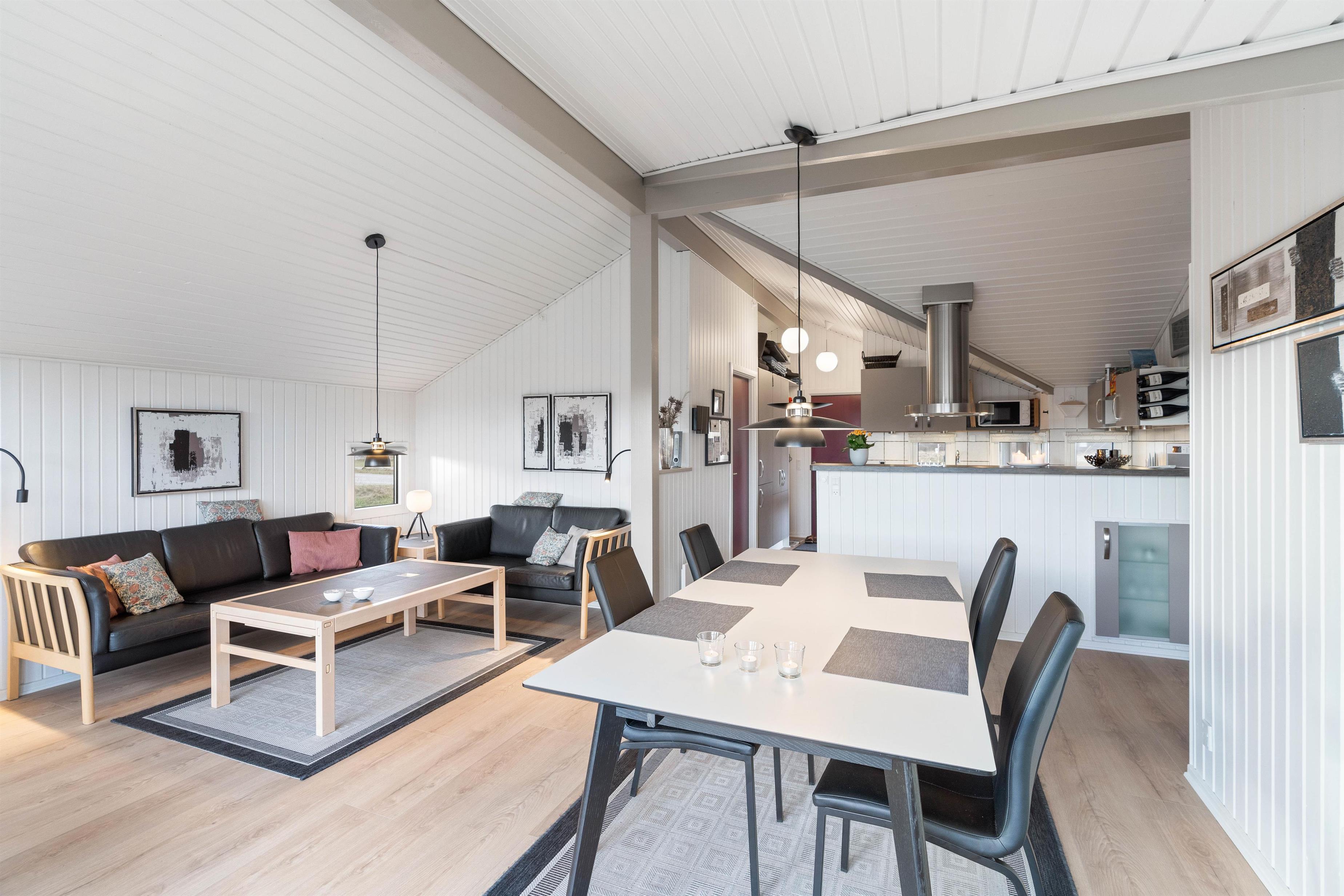 Husets spise- og opholdsstue er lyst og venligt indrettet med gode, komfortable møbler. Huset er på alle måder et dejligt fristed, hvor familien kan hygge sig og skabe gode ferieminder – både inde og ude. De lyse træbeklædte vægge og lofter løfter taget og giver en skøn fornemmelse af mere plads. I sofaen kan I samles med popcorn og lave en hyggelig filmaften, idet I kan streame alverdens film via husets Chromecast. Samtidig kan I nyde varmen fra de knitrende flammer i husets brændeobn.