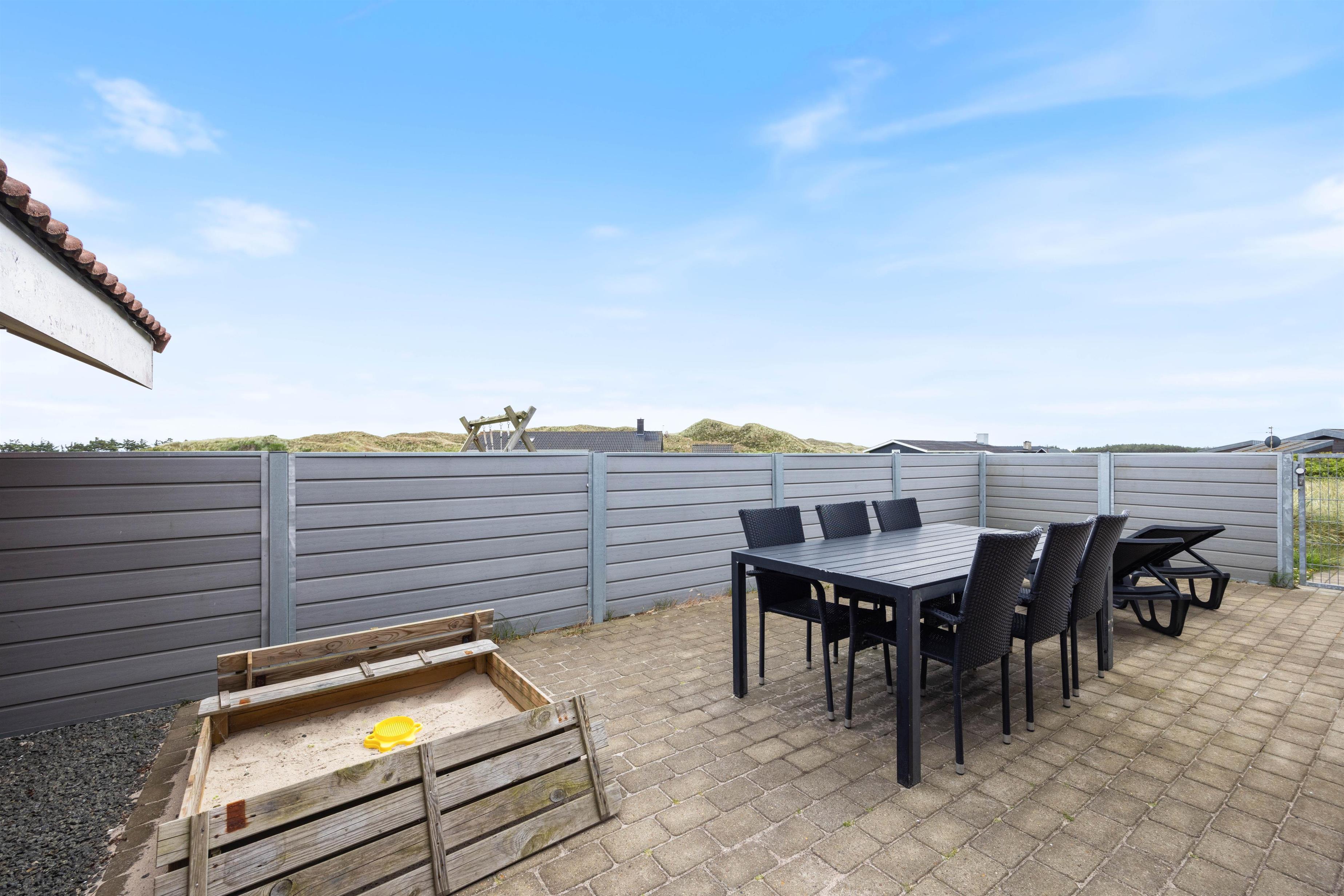Huset har en virkelig dejlig beliggenhed på en naturgrund i Årgab, kun et par hundrede meter fra den flotte sandstrand. Rundt om huset er der flere terrasser, både afskærmede og lukket, så her kan du altid finde et læfyldt hjørne, hvor du kan slappe af med en god bog eller blot nyde lyden af havet og den salte duft. Terrassen har havemøbler, liggestole og grill. Når ungerne bliver trætte af swimmingpoolen, kan de muntre sig i sandkassen eller på gyngen.