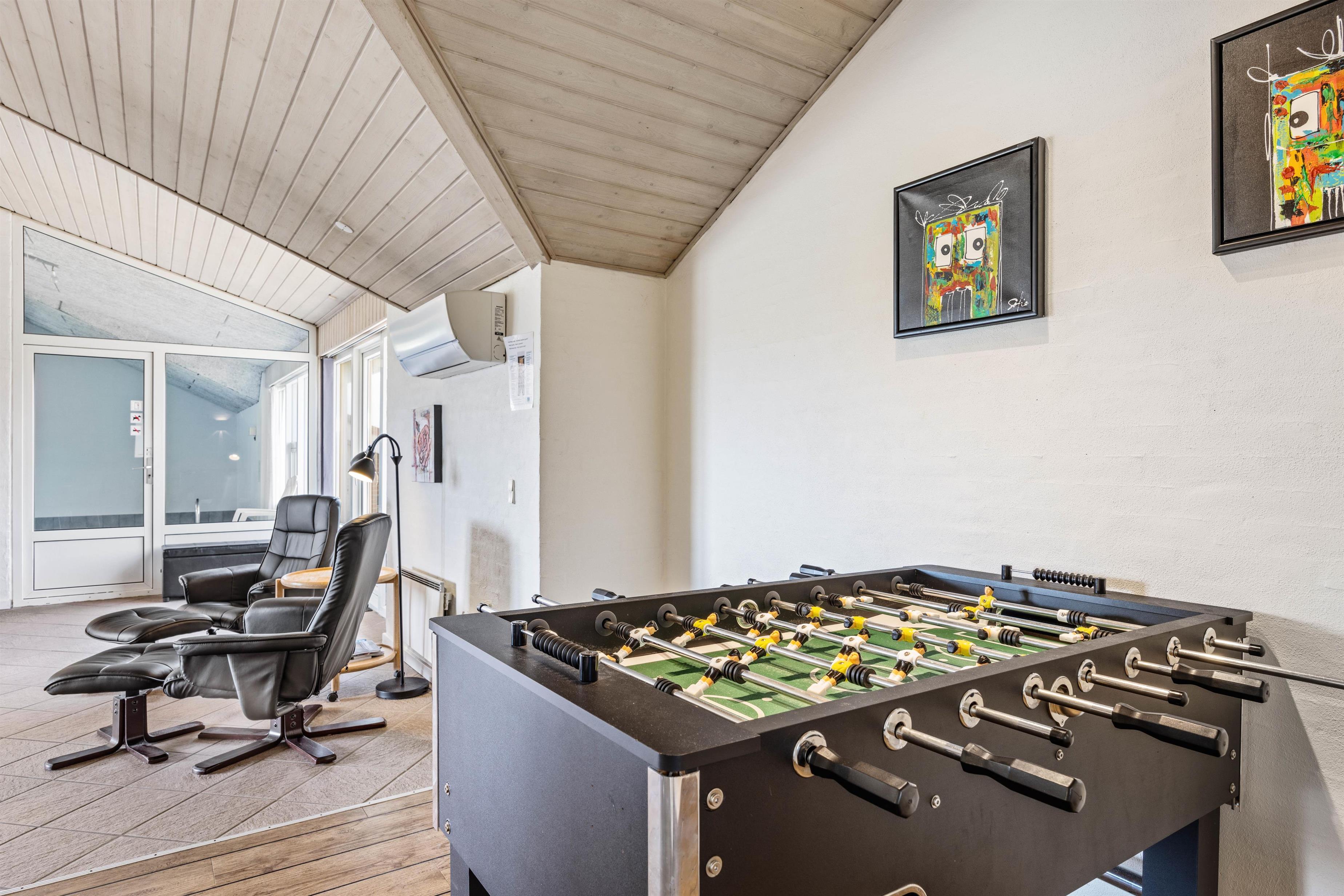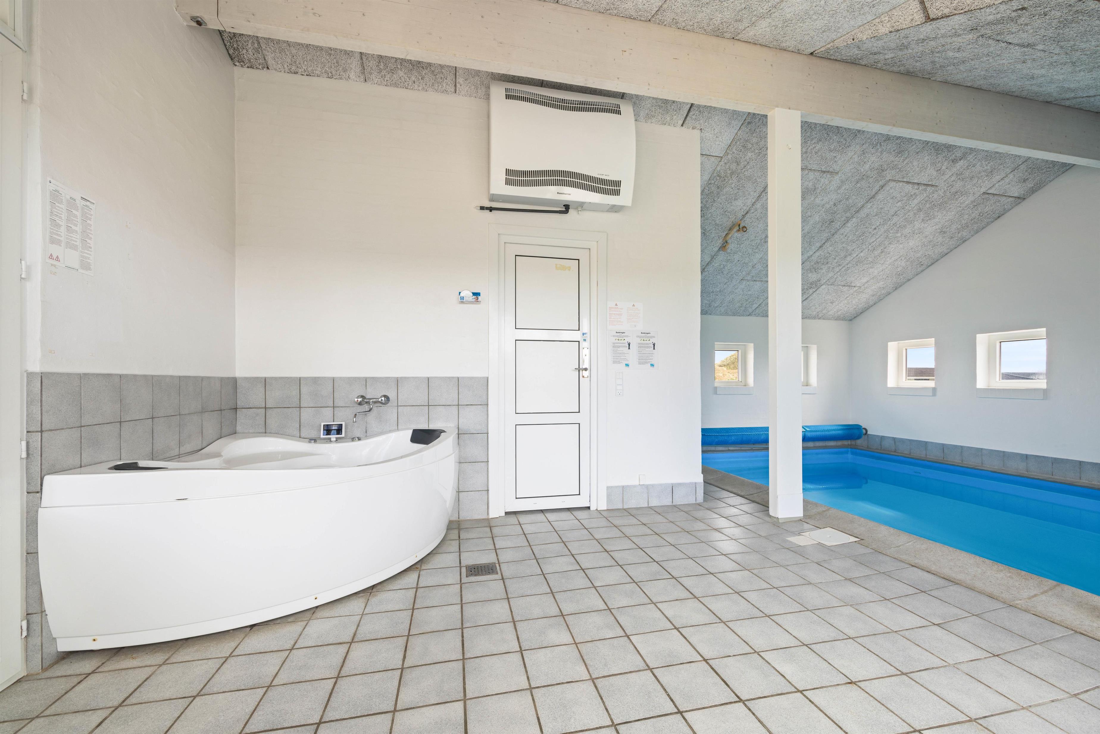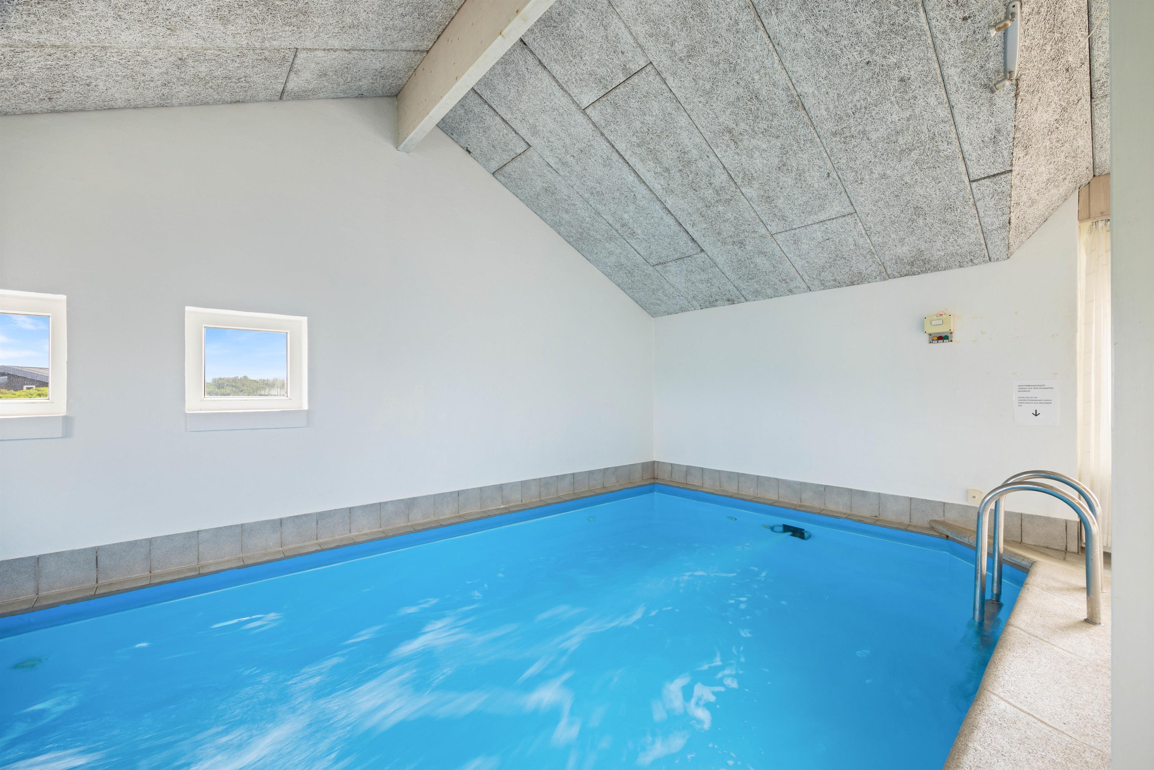 Et virkeligt dejligt og rummeligt luksus sommerhus med swimmingpool til hele 12 personer. Husets hjerte er den store opholdsstue, som står i åben forbindelse med det rummelige køkken, der er indrettet med alt i hårde hvidevarer, Stuen er flot møbleret med bla. bordfodbold og herfra er der adgang til husets aktivitetsafdeling, hvor der er 18 m2 swimmingpool med modstrømsanlæg, boblebad og adgang til sauna. Der er to soveafdelinger i huset, begge med eget badeværelse. Soveværelserne er alle indrettet med boksmadrasser. Her er endvidere gratis trådløst internet i huset.