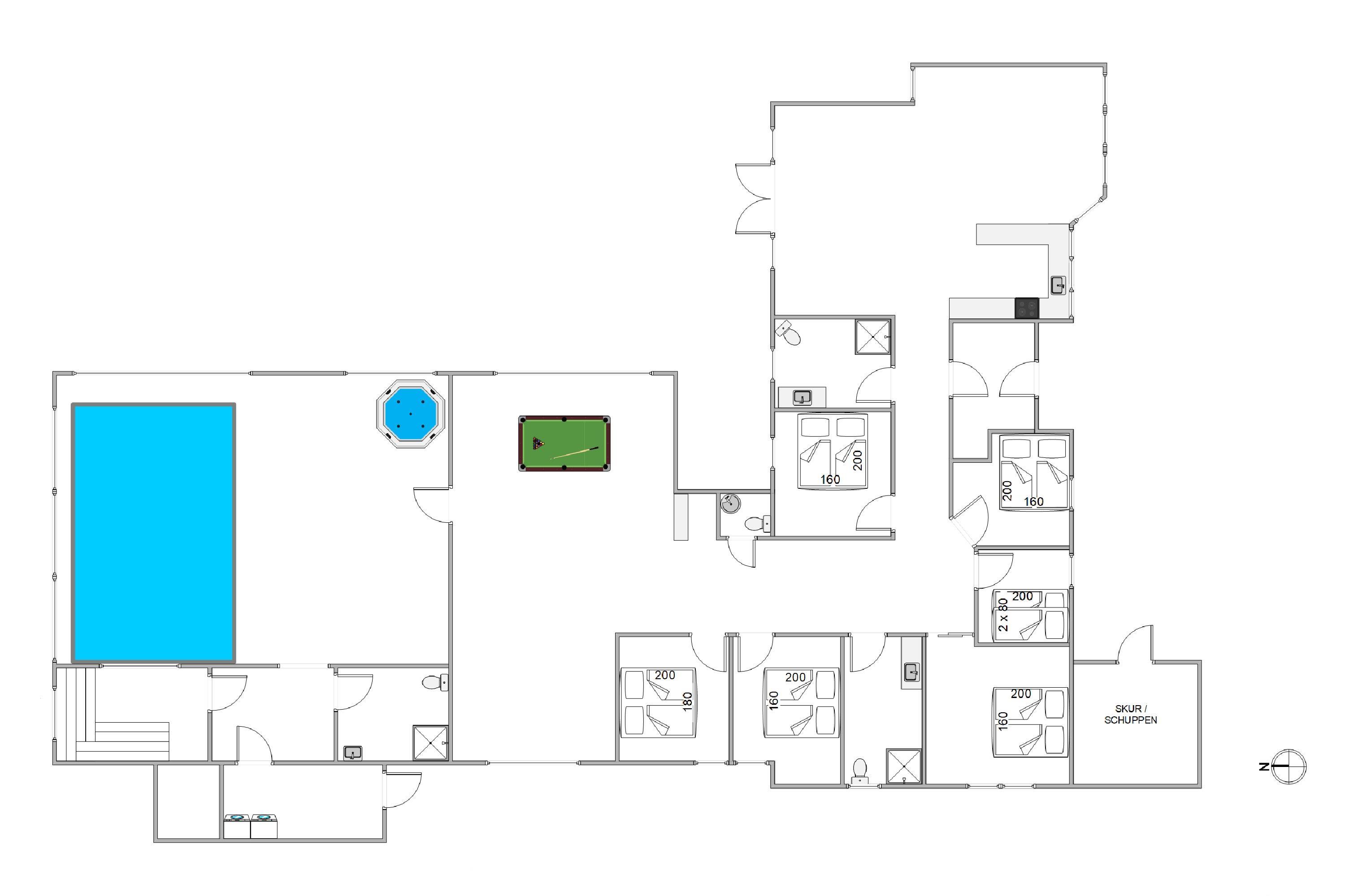 Poolafdelingen er stor og praktisk indrettet med omklædningsrum, toilet og gang med vaskemaskine og tørretumbler, samt stor håndklædetørrer.