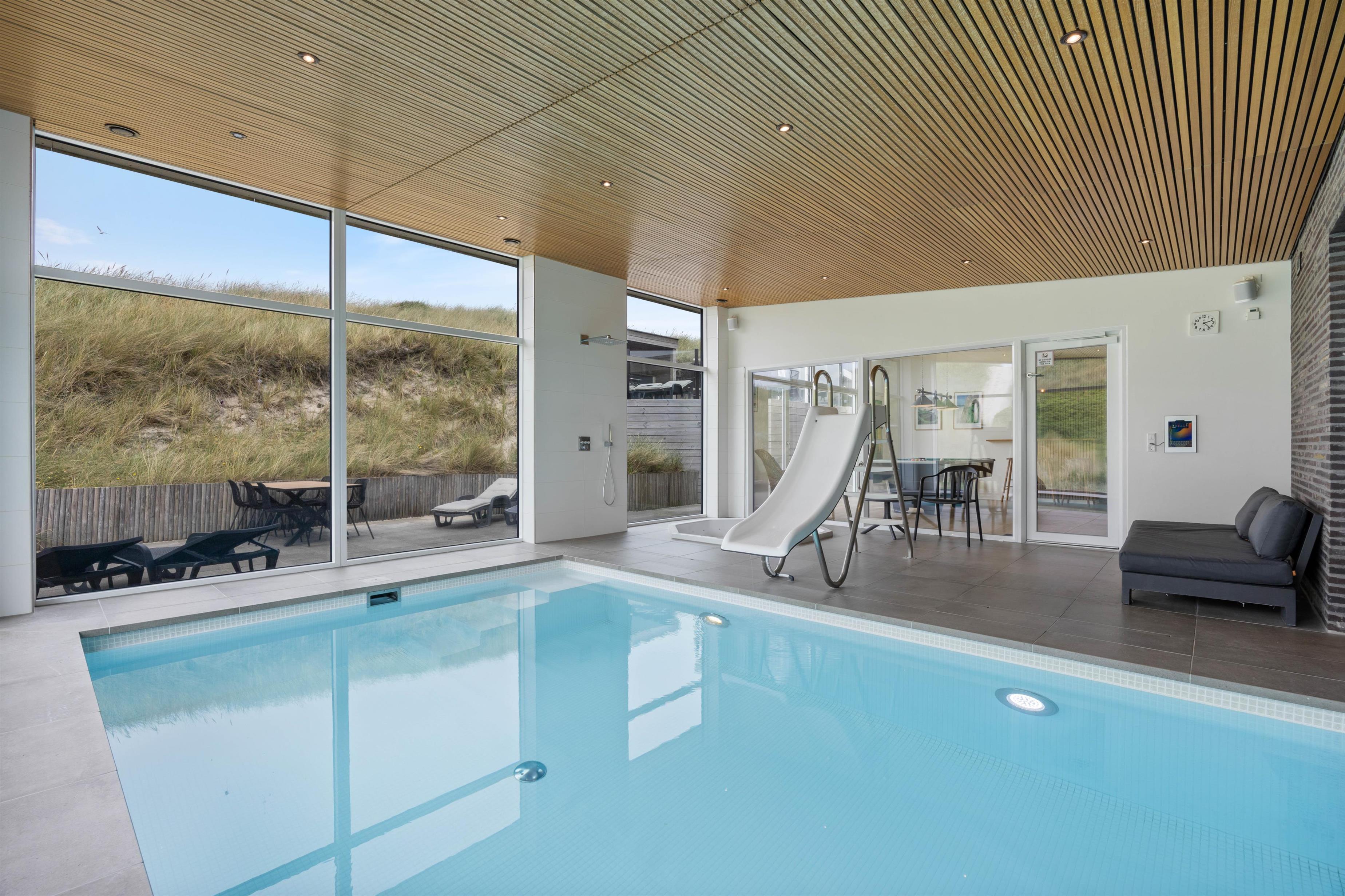 Swimmingpool med rutsjebane og minimalt varmeforbrug, stort spabad og sauna