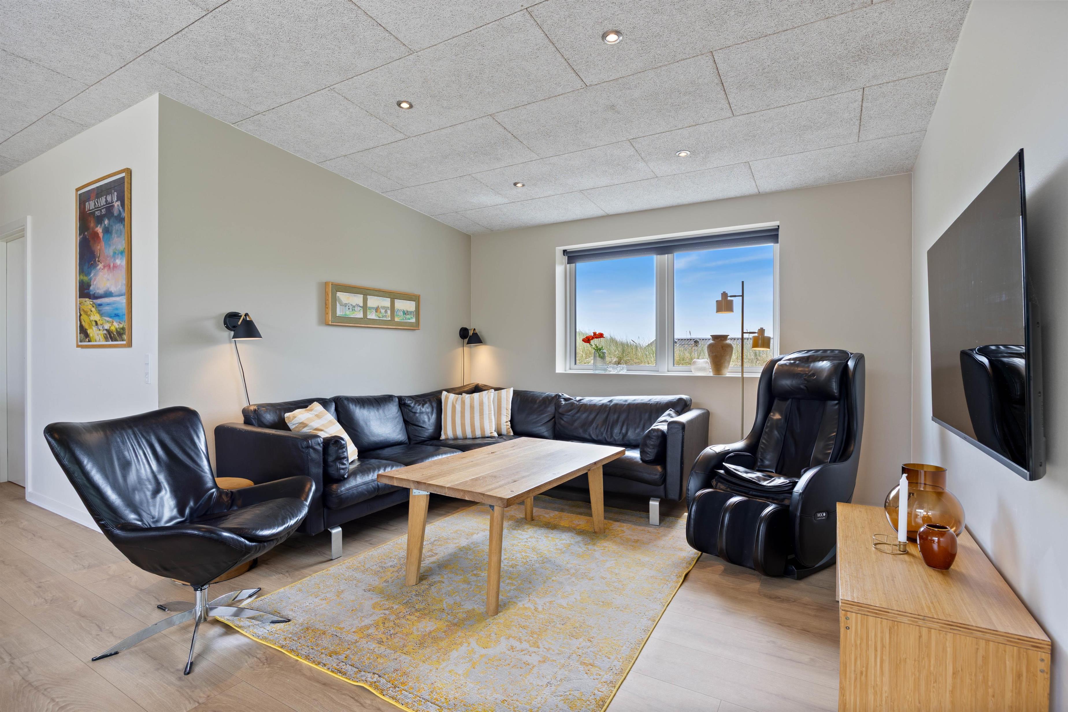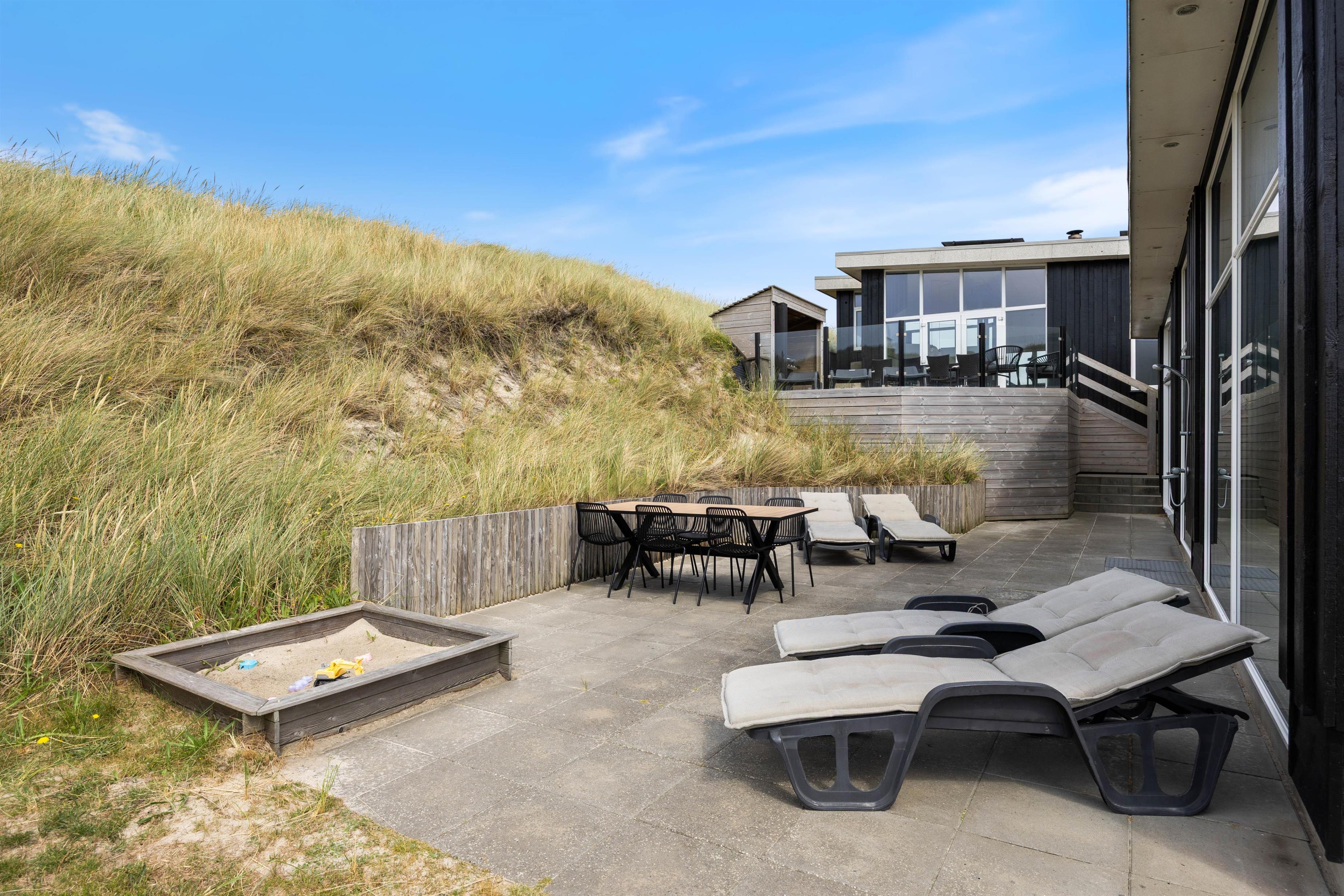 Den varierende natur og feriehusets forskudte plan skaber masser af ”hyggerum” og gode terrasser rundt om huset. Der er plads til alle – til morgenkaffe på den østvendte terrasse, hvor I kan nyde solopgangen over Ringkøbing Fjord, og til en hyggelig grillaften på den store og ugenerede terrasse med den flotte panoramaudsigt over klitterne mod vest. I det varme vejr kan I holde drikkevarerne kolde ved hjælp af den indebyggede isterningemaskine, som I finder i køleskabet.