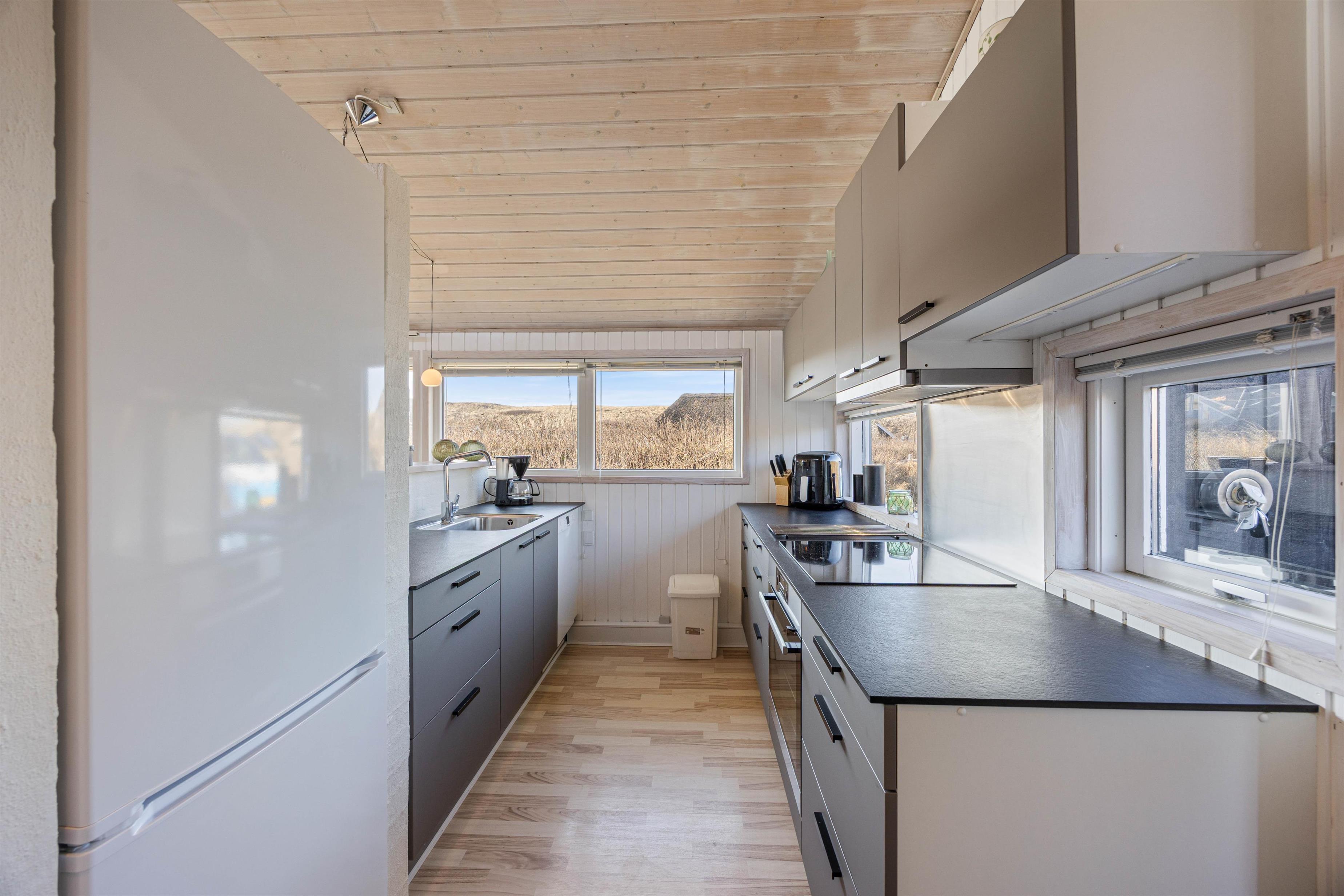 I sommerhusets køkkenalrum finder i den afslappende stue med de smukke brune lædermøbler. Her har I mulighed for at nyde den skønne brændeovn, tage en lille lur eller se en god film. I den anden ende af køkkenalrummet finder i det moderne køkken. Her kan I se ind til stuen, så i stadig kan hyggesnakke med jeres familiemedlemmer.