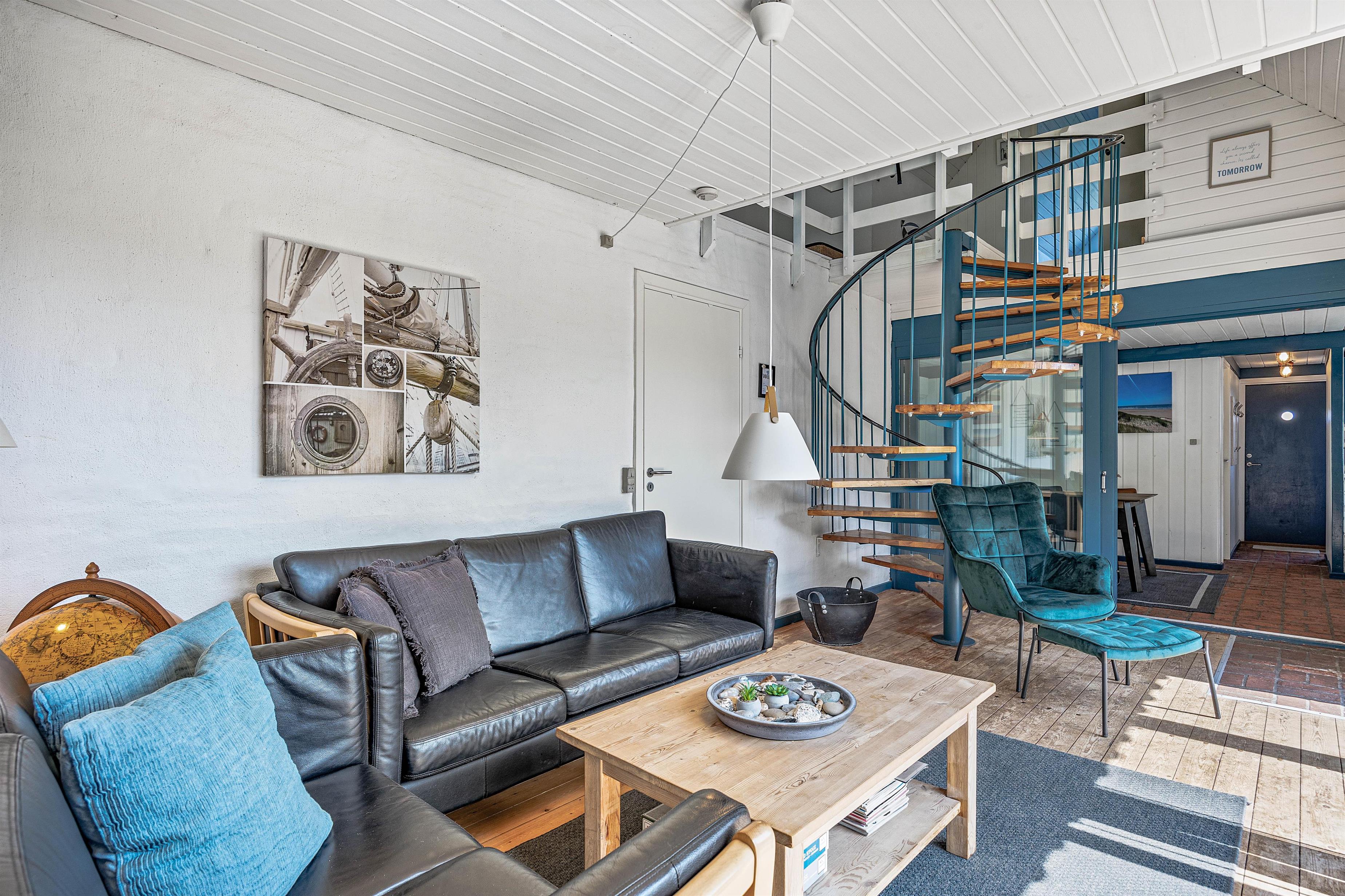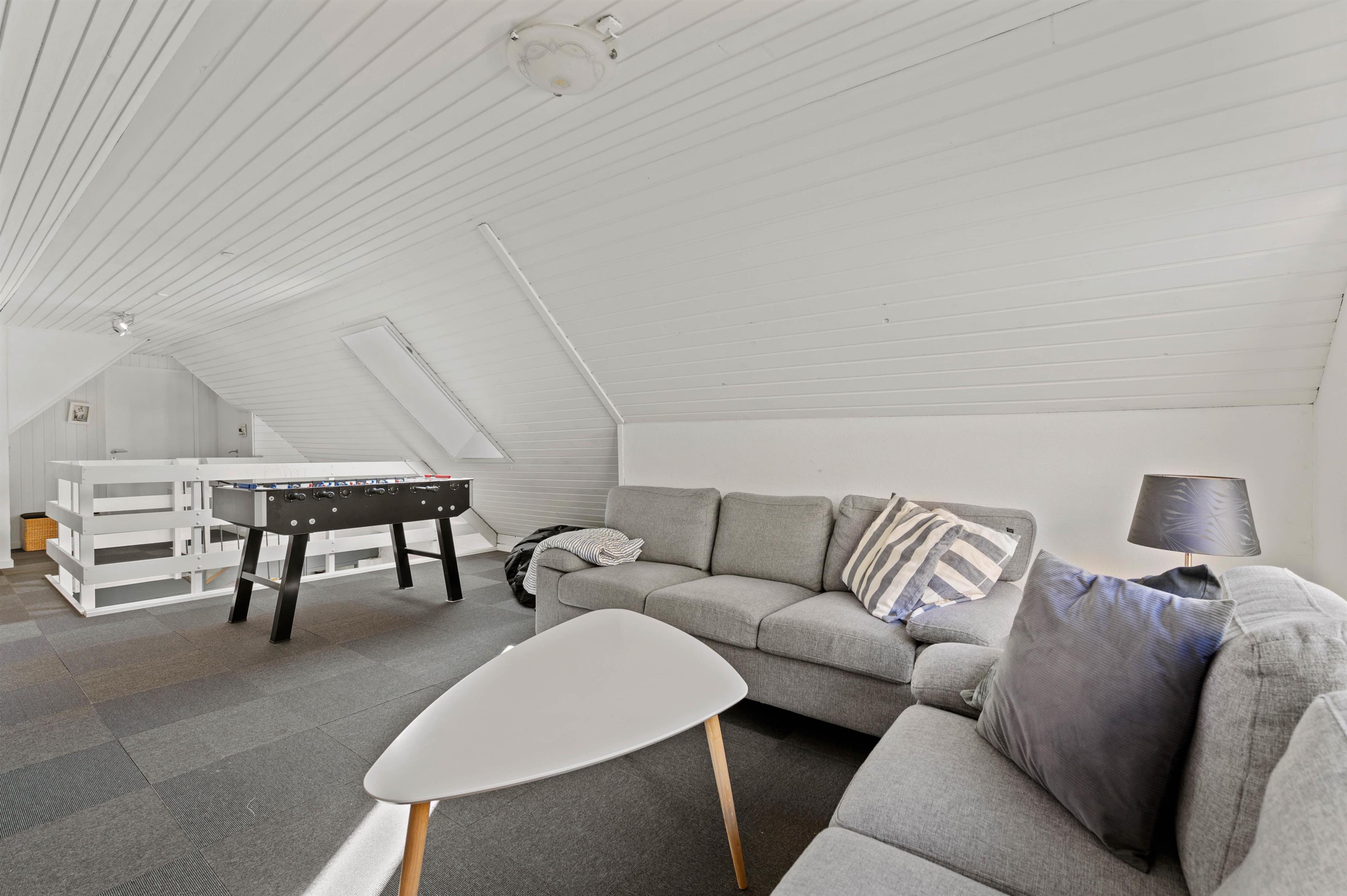 Takket være den integrede opvaskemaskine har du tid til en spilleaften med hele familien, hvor I kan nyde hinandens selskab. Ovenpå finder du endnu en stue med fladskærms-tv og som et særligt højdepunkt et bordfodboldbord. Varmepumpen giver dig mulighed for at opvarme feriehuset på en energibesparende måde.