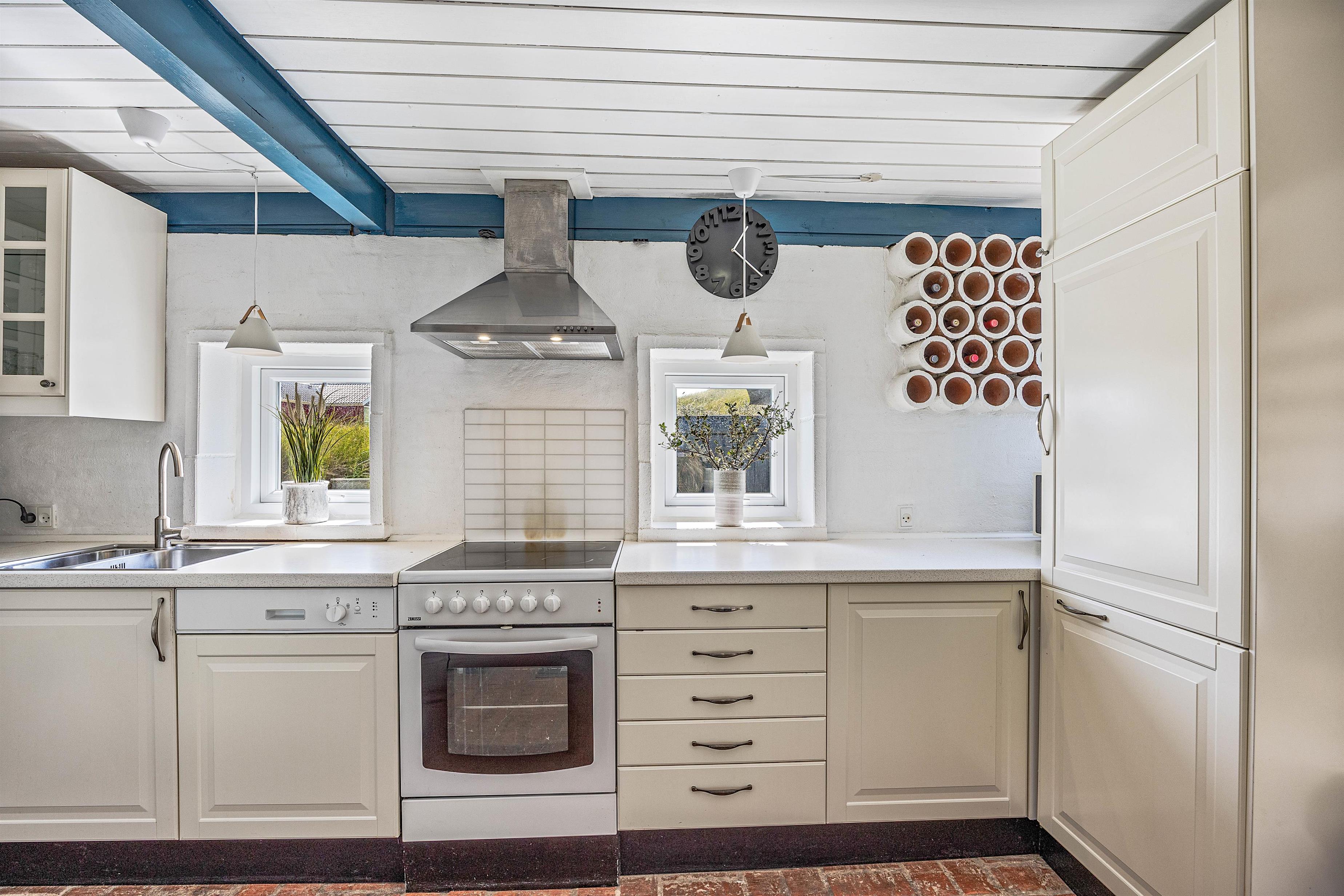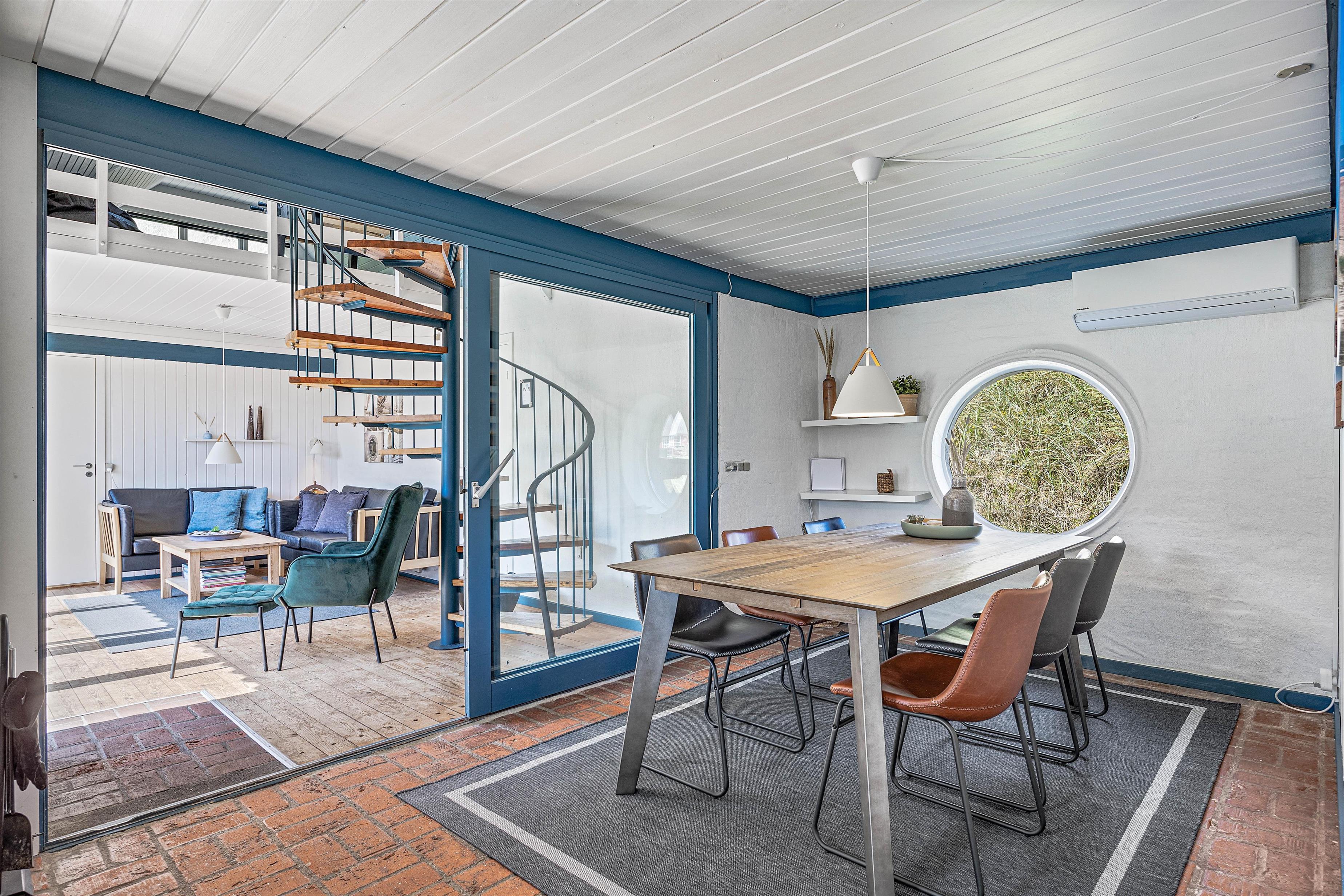 I dette sommerhus er der lagt stor vægt på at skabe en hyggelig og venlig atmosfære. Fra opholdsrummet i stueetagen har du en smuk udsigt over klitterne genne de store panoramavinduer, som du kan nyde med den knitrende pejs i baggrunden. Derudover er der en rummelig spiseplads og det åbne køkken, hvor I kan tilberede en lækker frokost sammen.