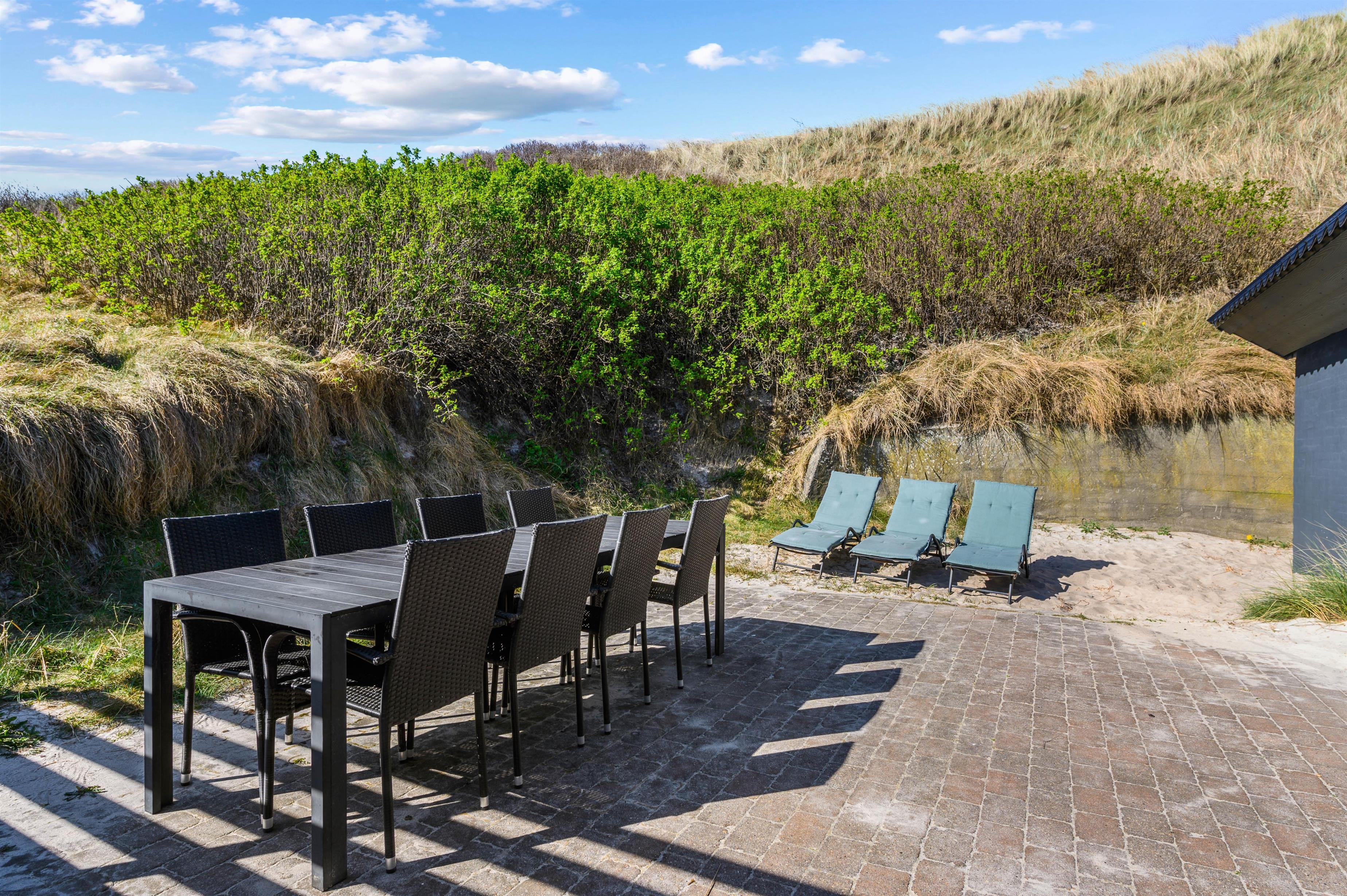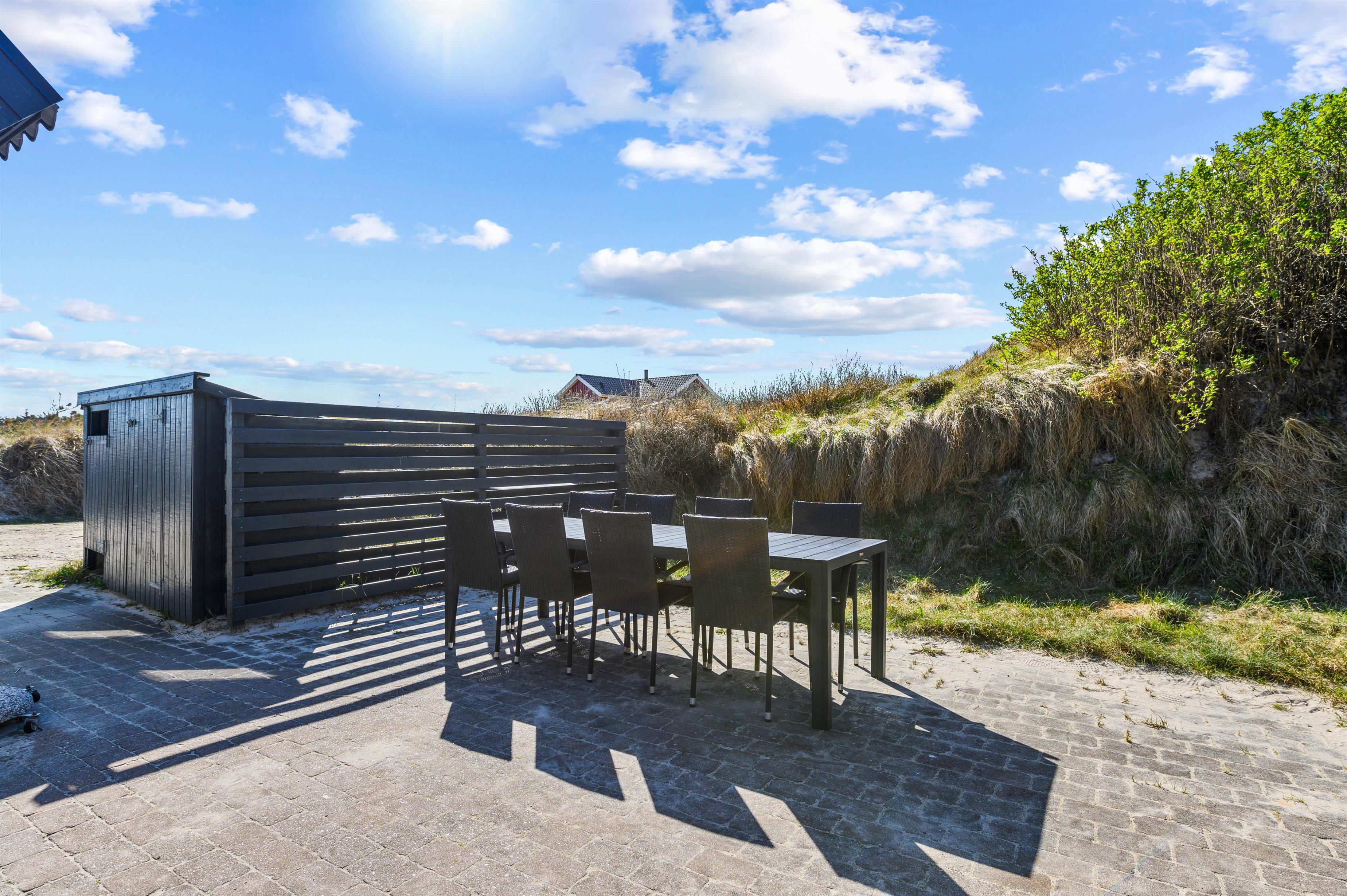 På grunden finden du en terrasse i ly af klitterne, hvor du kan slappe af, nyde solen med en friskbrygget kaffe og en god bog. Her kan I også grille og nyde udsigten med et koldt glas vin i hånden, mens solen farver himlen i vidunderlige farver under solnedgangen.