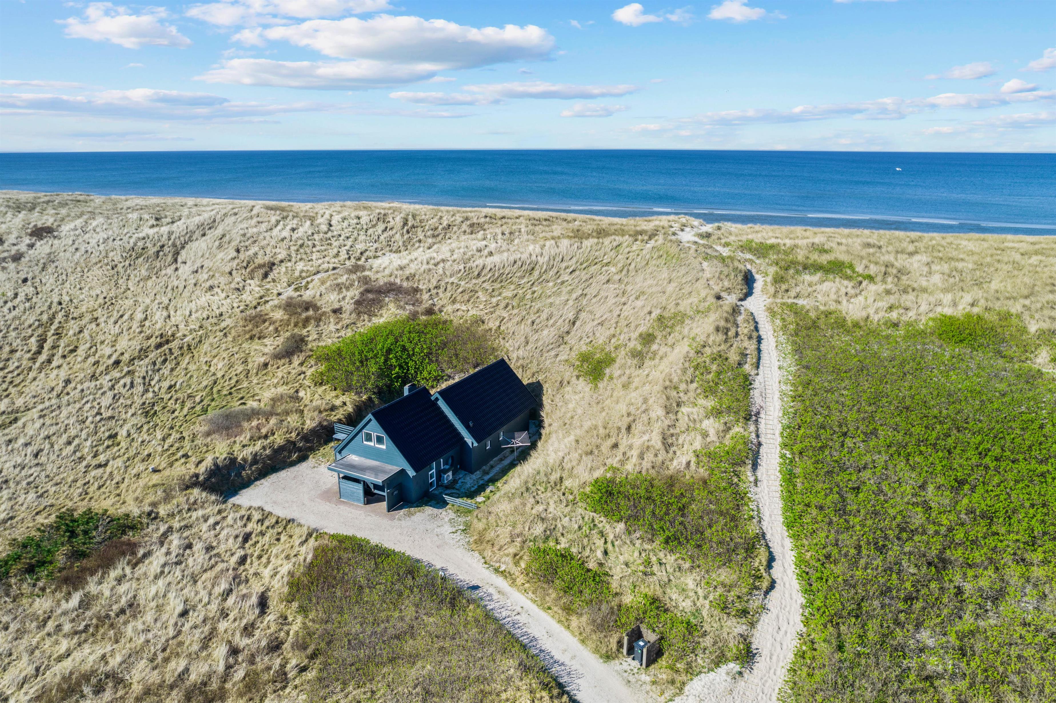 Dette skønne sommerhus ligger direkte i klitterne og kun 50 meter fra Vesterhavet - en helt enestående beliggenhed. Fra den smukke naturgrund er der ikke langt til den vidunderlige sandstrand, hvor I kan gå lange ture med hundene eller bygge store sandslotte med børnene.
