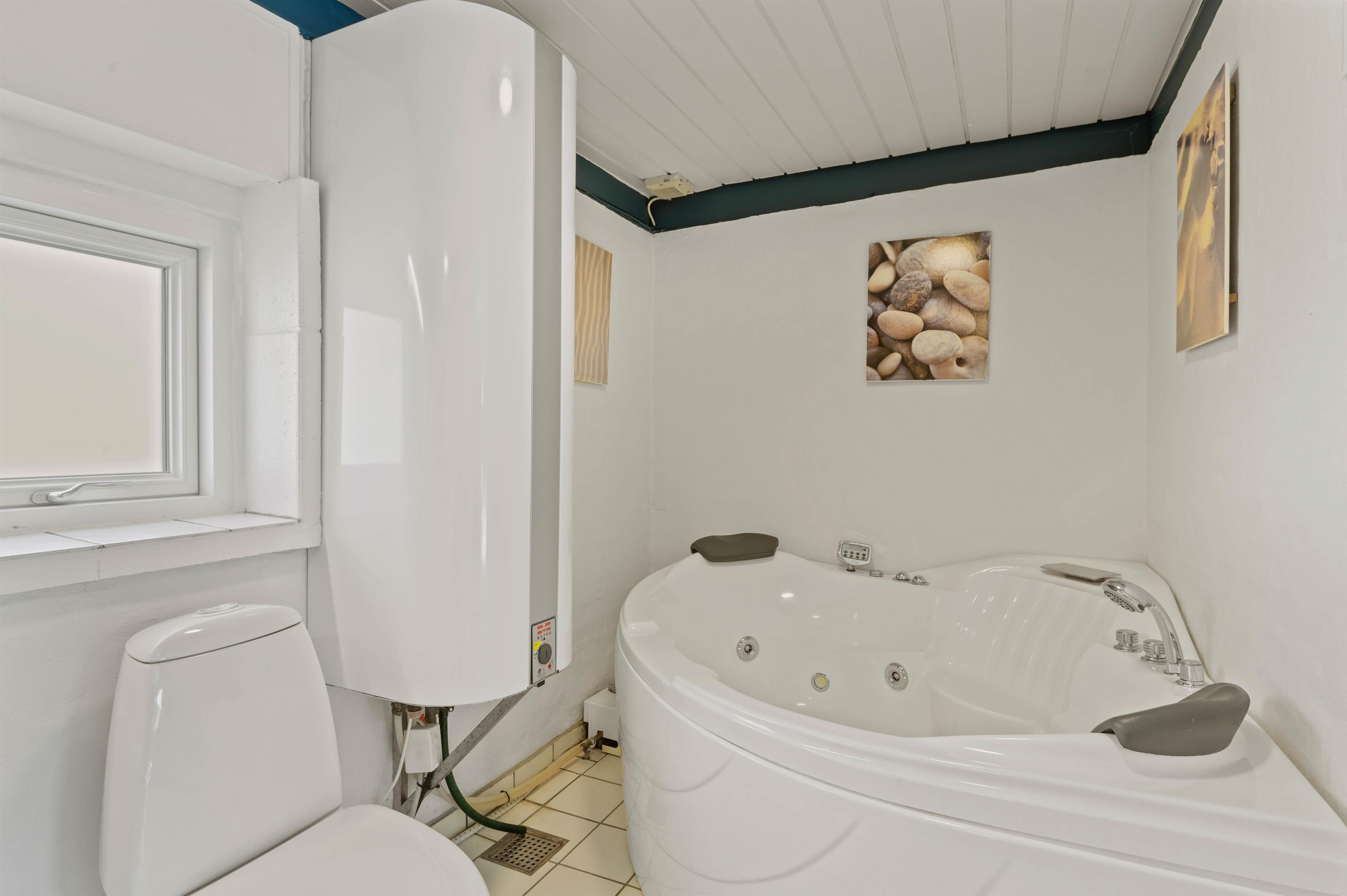 På badeværelset finder du en afslappende spa samt en bruser. Her kan du slappe af eller bruge saunaen til at koble helt af. Takket være gulvvarmen får du ikke kolde fødder på badeværelset.