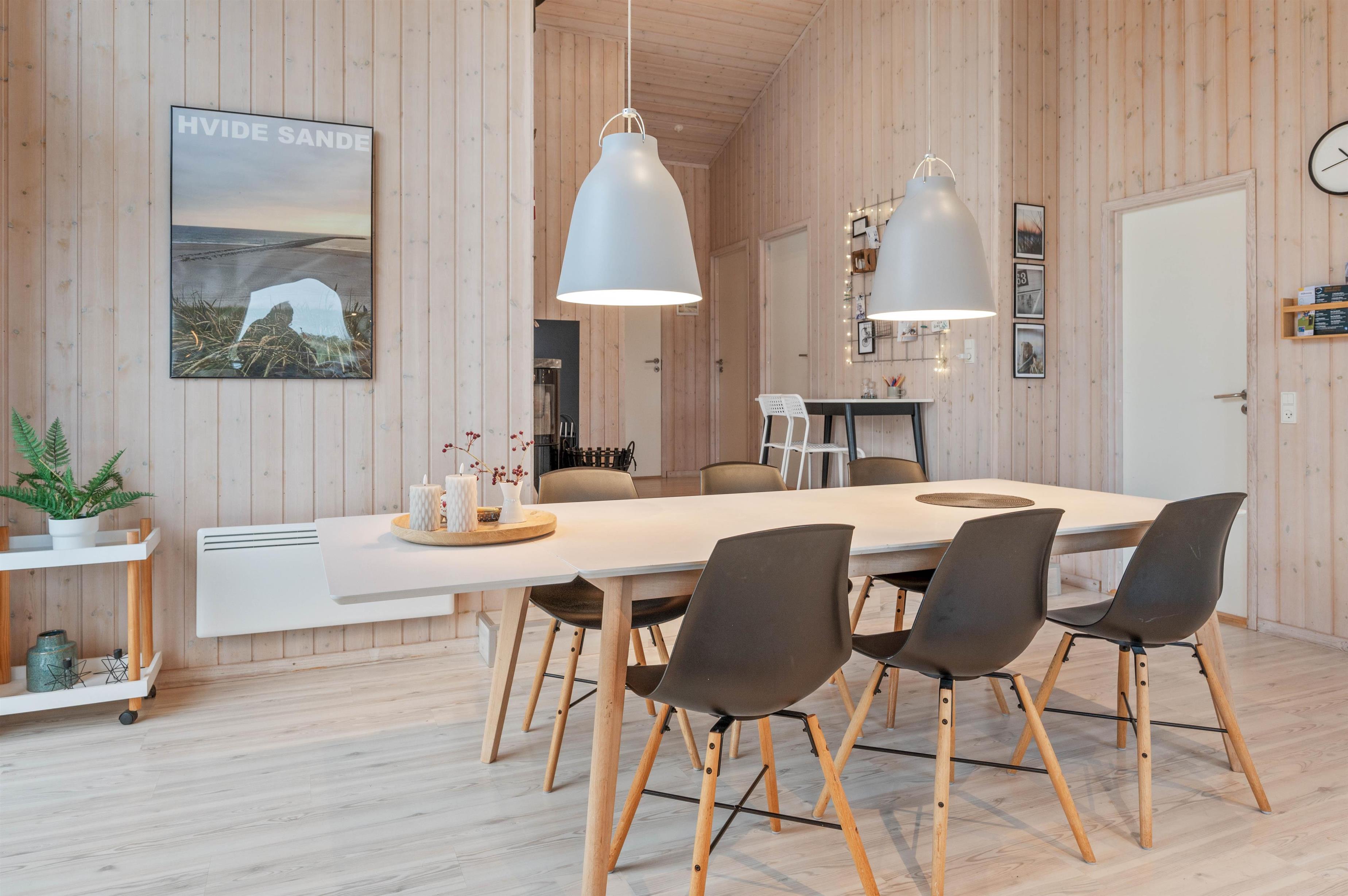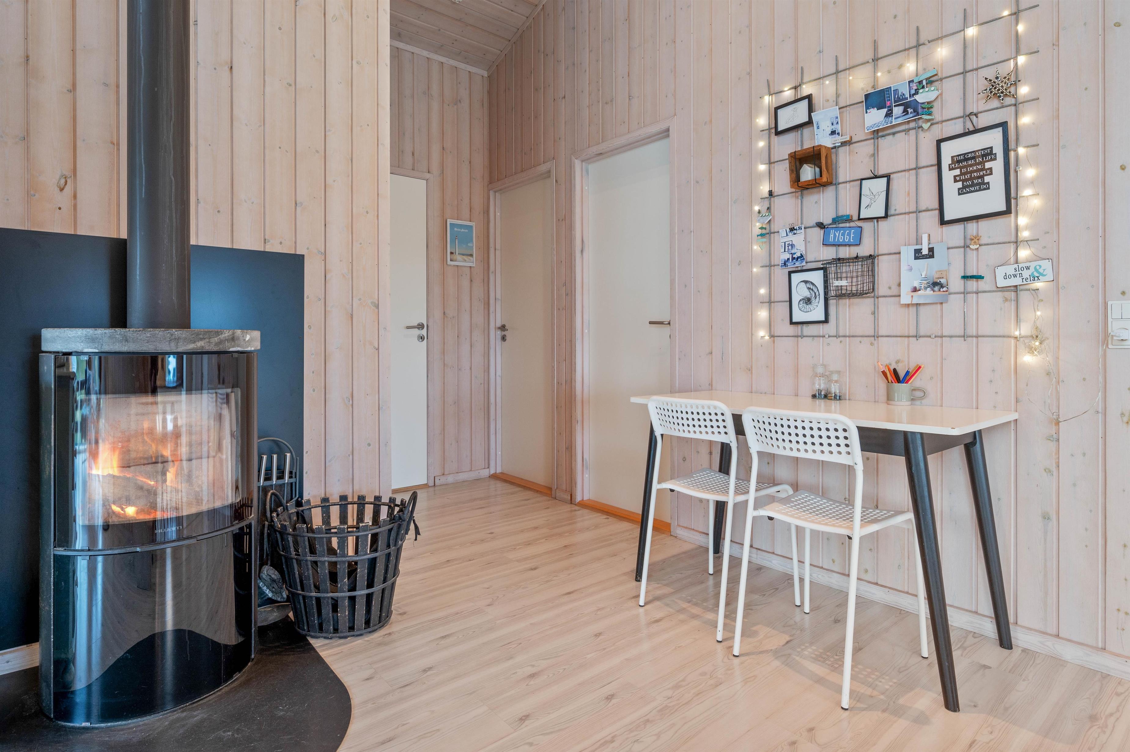 Køkkenet er flot og praktisk indrettet med bl.a. stor fryser (80l), opvaskemaskine og mikroovn. Spiseafdelingen ligger i umiddelbar forlængelse af køkkenet, hvorfra der også er adgang til den store stue. Her kan man, især på de lidt køligere dage, nyde en god bog foran den knitrende ild i brændeovnen.