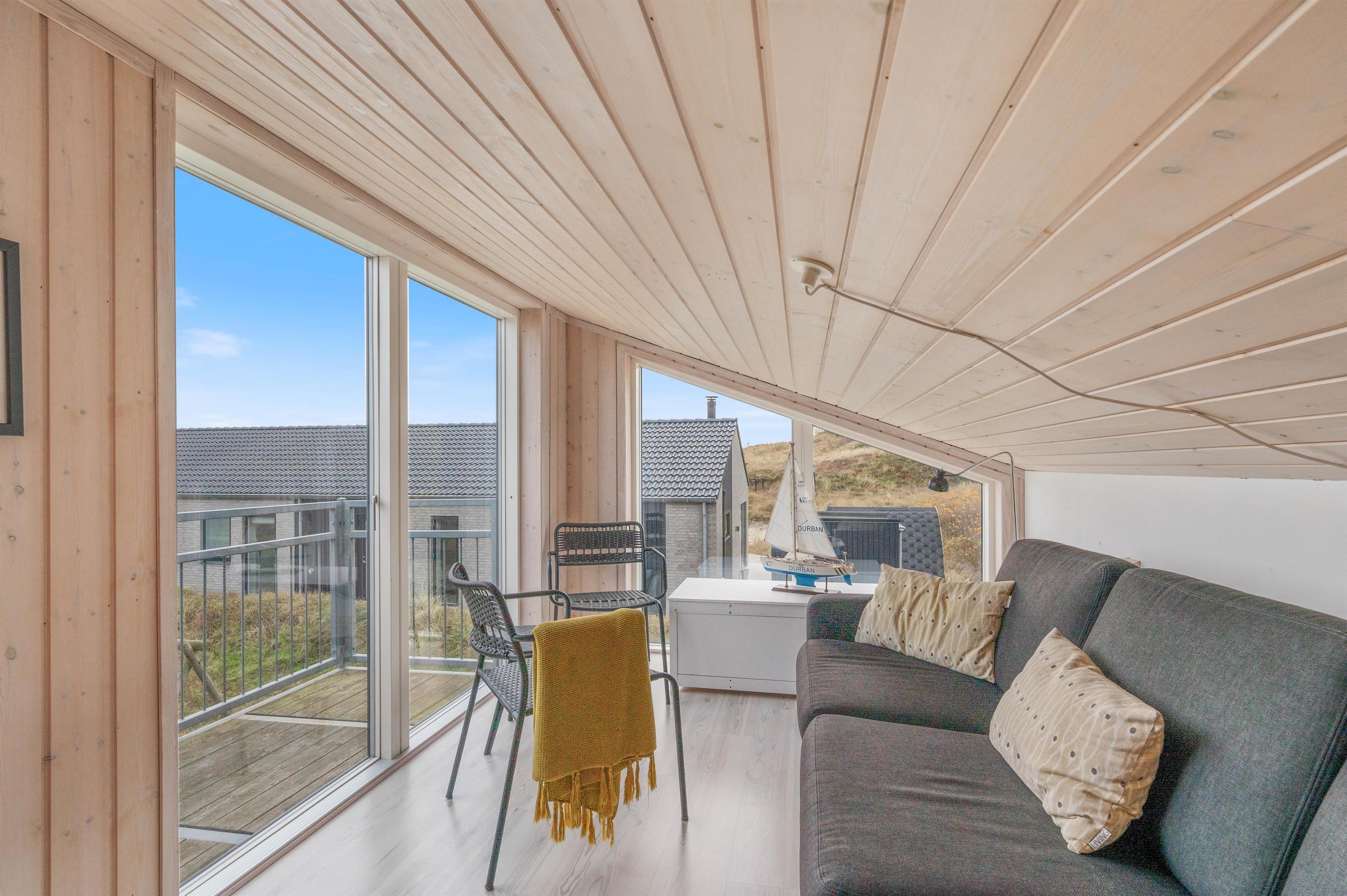 Fra opholdsrummet går der en trappe op til en lille stue på 1. salen, hvorfra man rigtig kan nyde udsigten over fjorden og det fantastiske og afvekslende landskab.