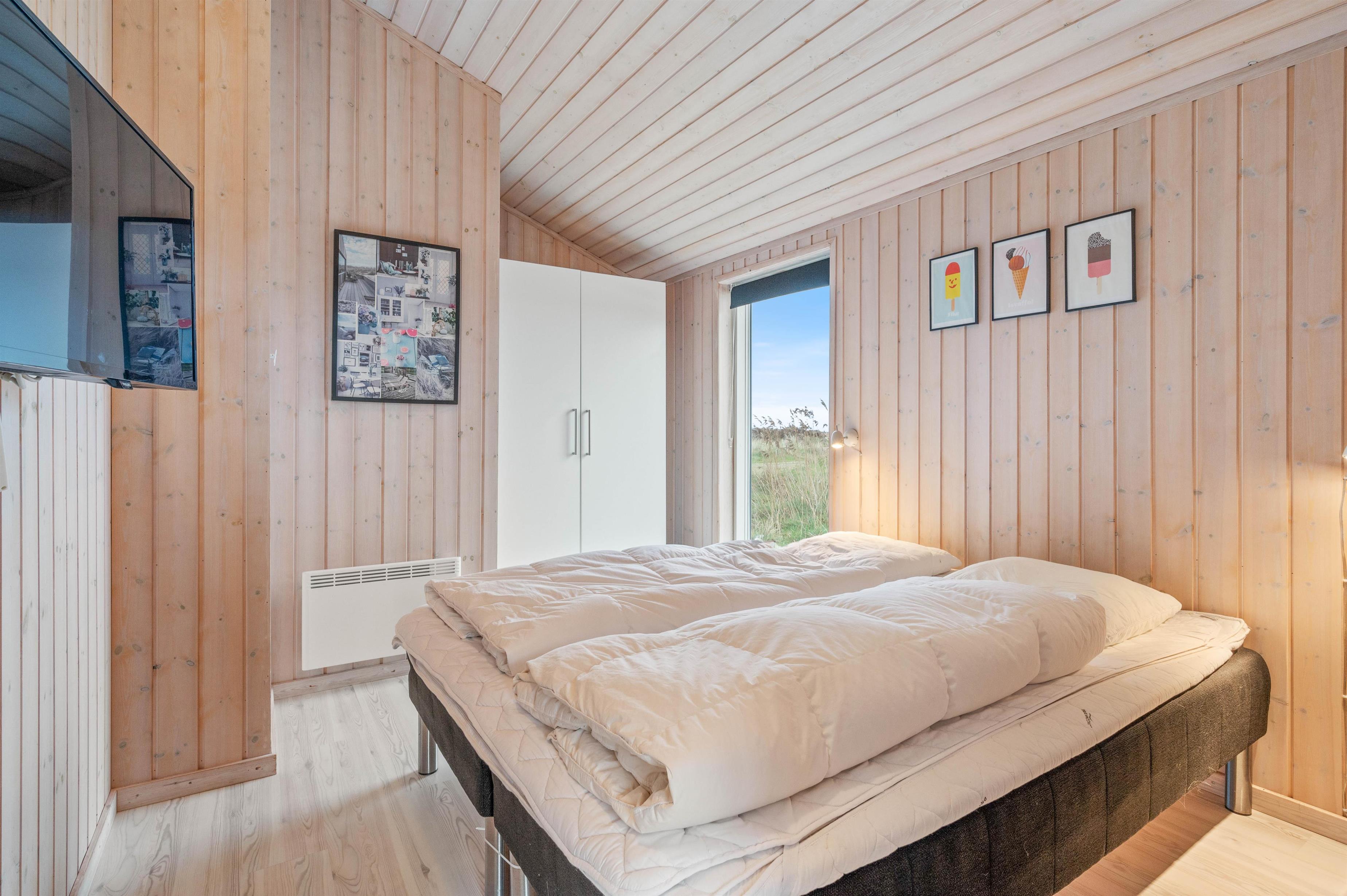 Der er 3 soveværelser i huset, hvor de 2 har hver en dobbeltseng, og det sidste værelse har 2 enkelte senge. Der er 2 badeværelser, begge med gulvvarme og bruseniche. Fra det store badeværelse er der adgang til en dejlig stor sauna, hvor man rigtig kan slappe af og lade sig gennemvarme. I entreen bag et par skydedøre, finder I vaskemaskine og tørretumbler, så man kan pakke let og vaske undervejs.