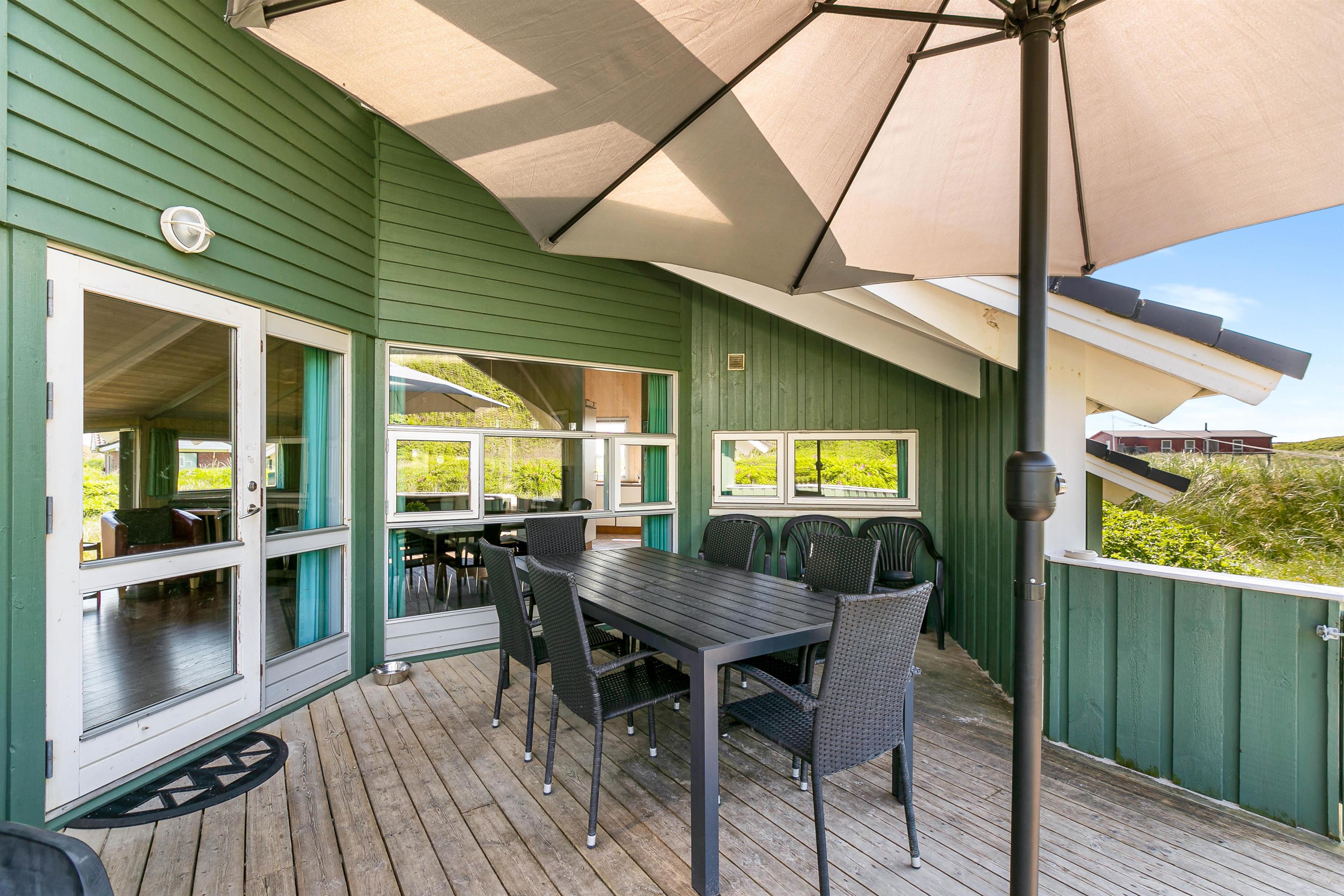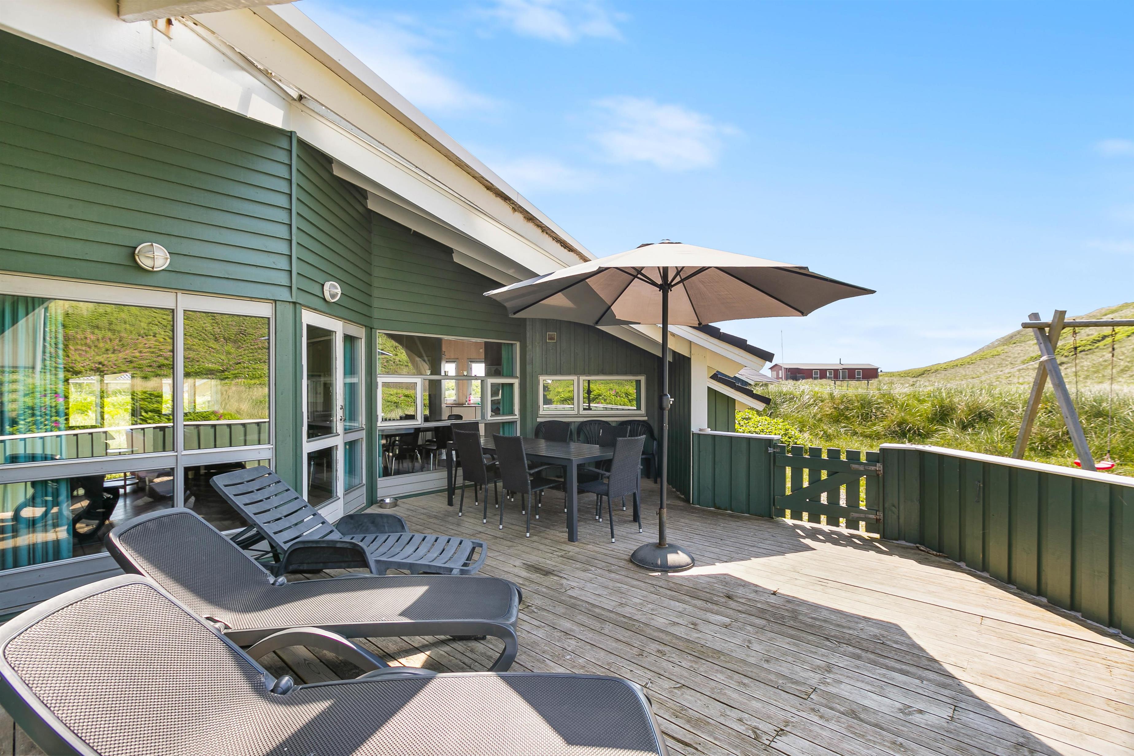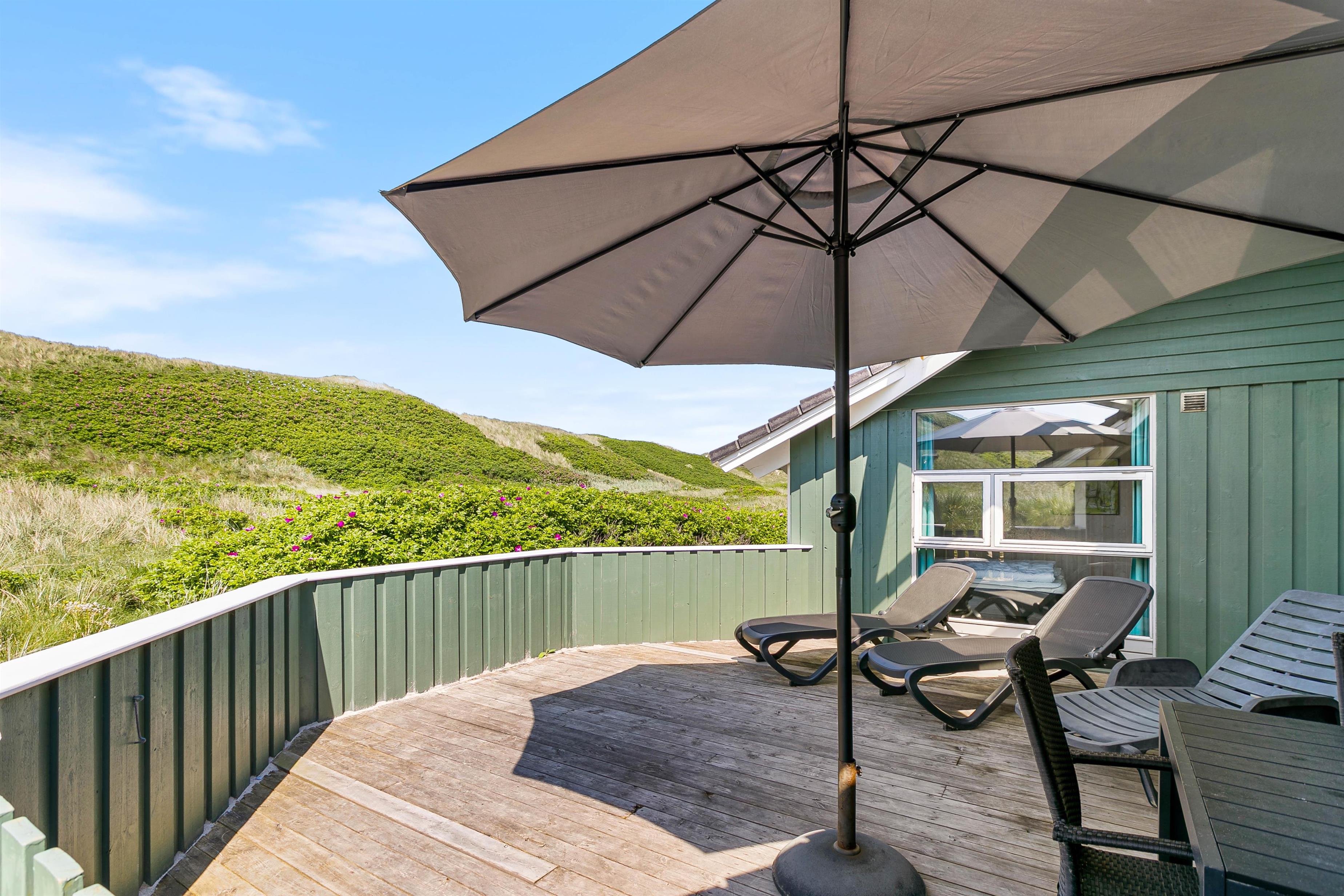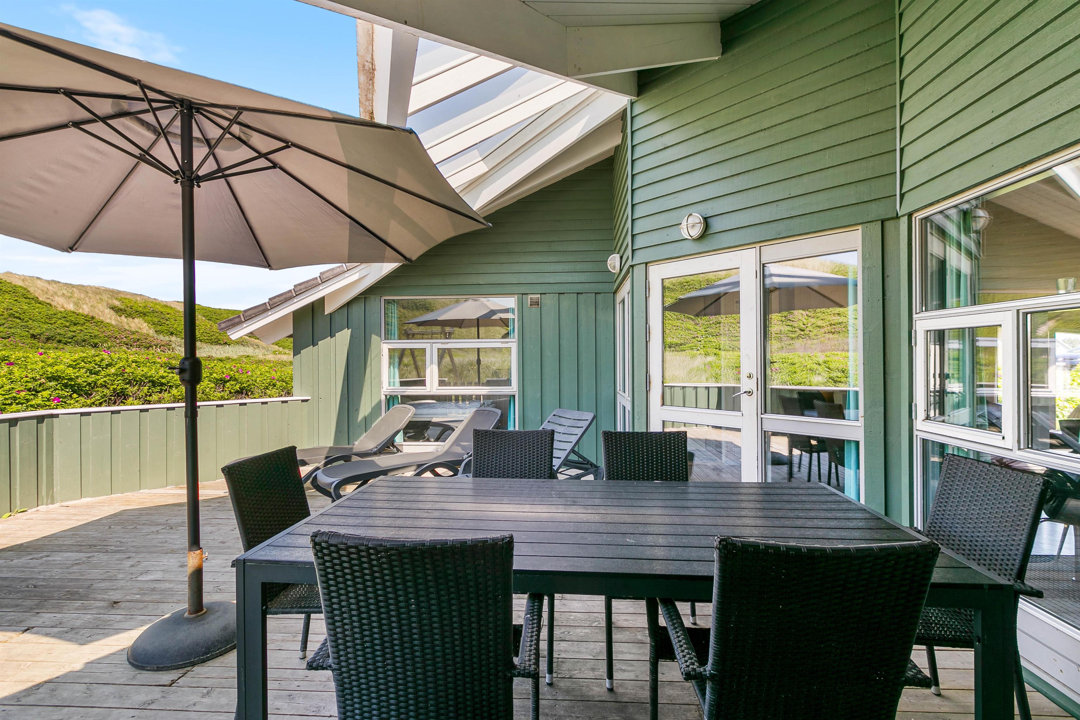 Den store terrasse mod sydvest er både delvist overdækket, delvis afskærmet, og delvist lukket, og kan således bruges meget af dagen. Den lidt mindre terrasse mod sydøst, ved husets indgang, er delvist afskærmet og derfor anvendelig til morgenkaffe på dage med godt vejr. Det smukke klitlandskab er en del af naturgrunden, så man får følelsen af at være et med naturen, når man bor i dette hus. Vesterhavet høres tydeligt fra terrasserne, og der er markerede stier til, når man ønsker at gå til havet.