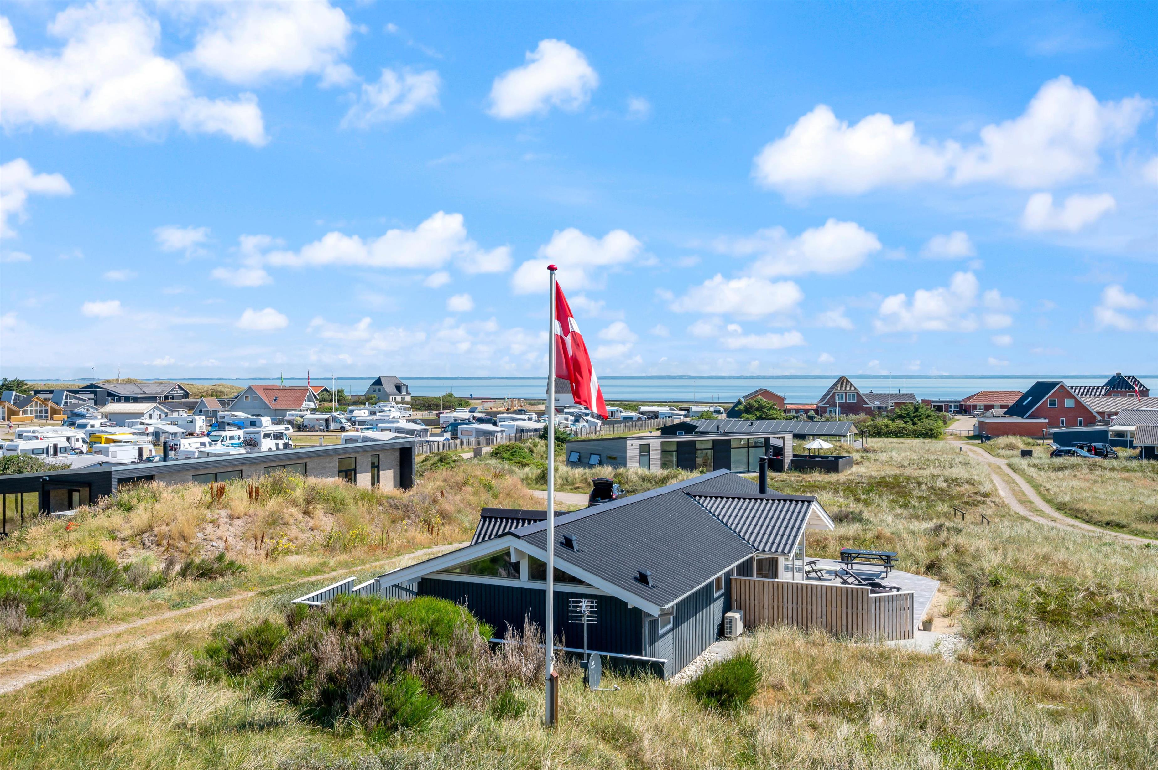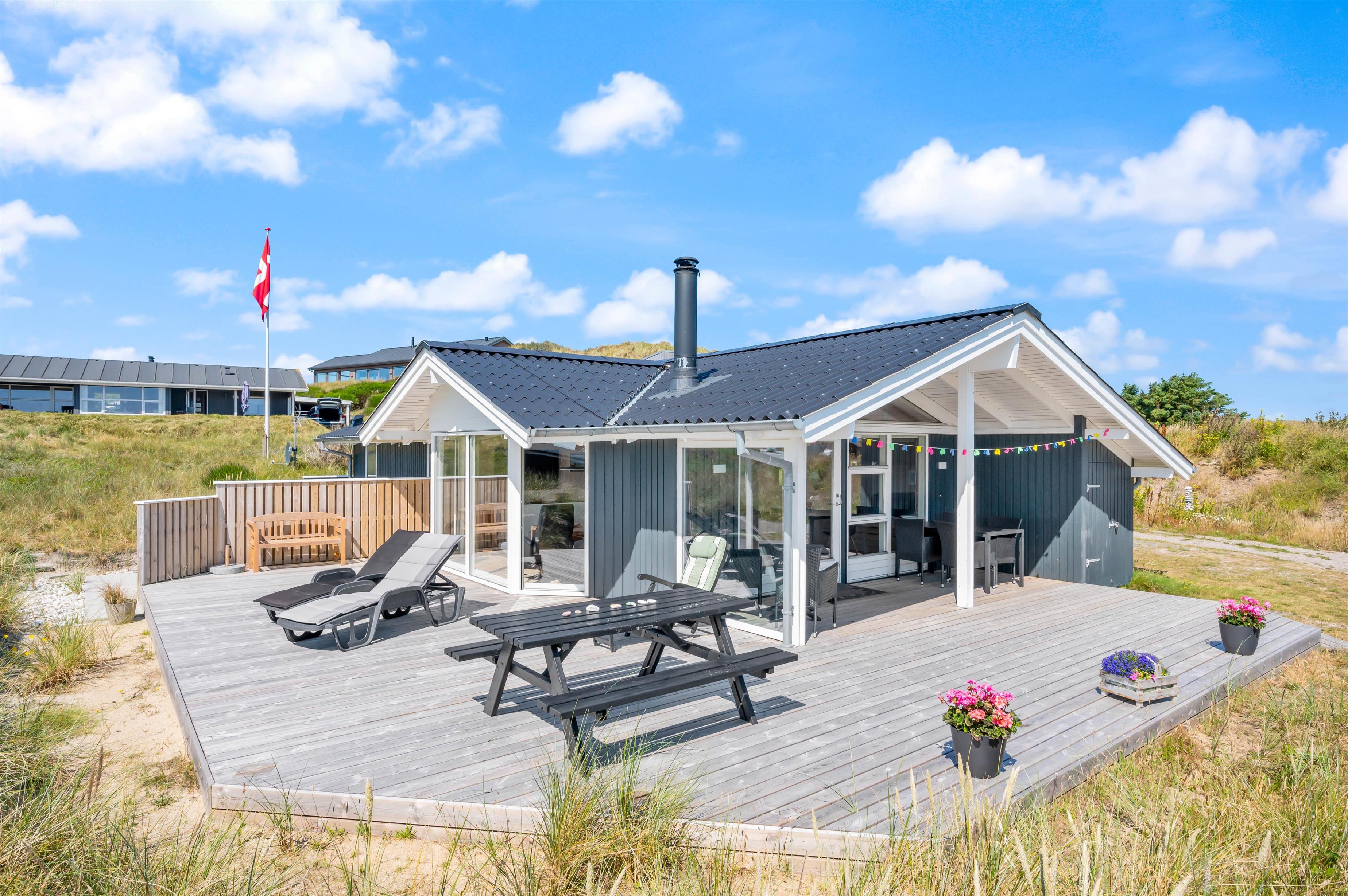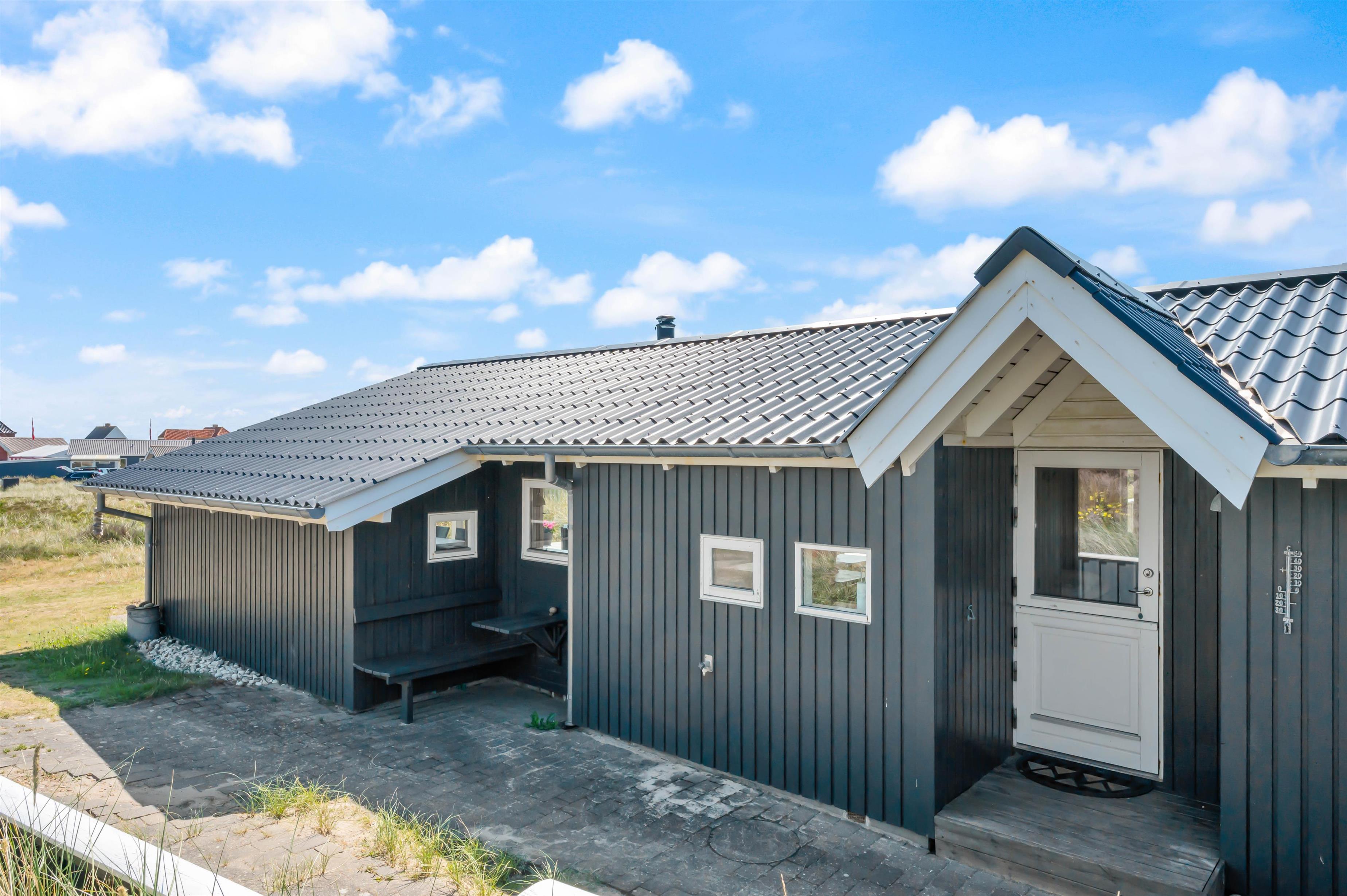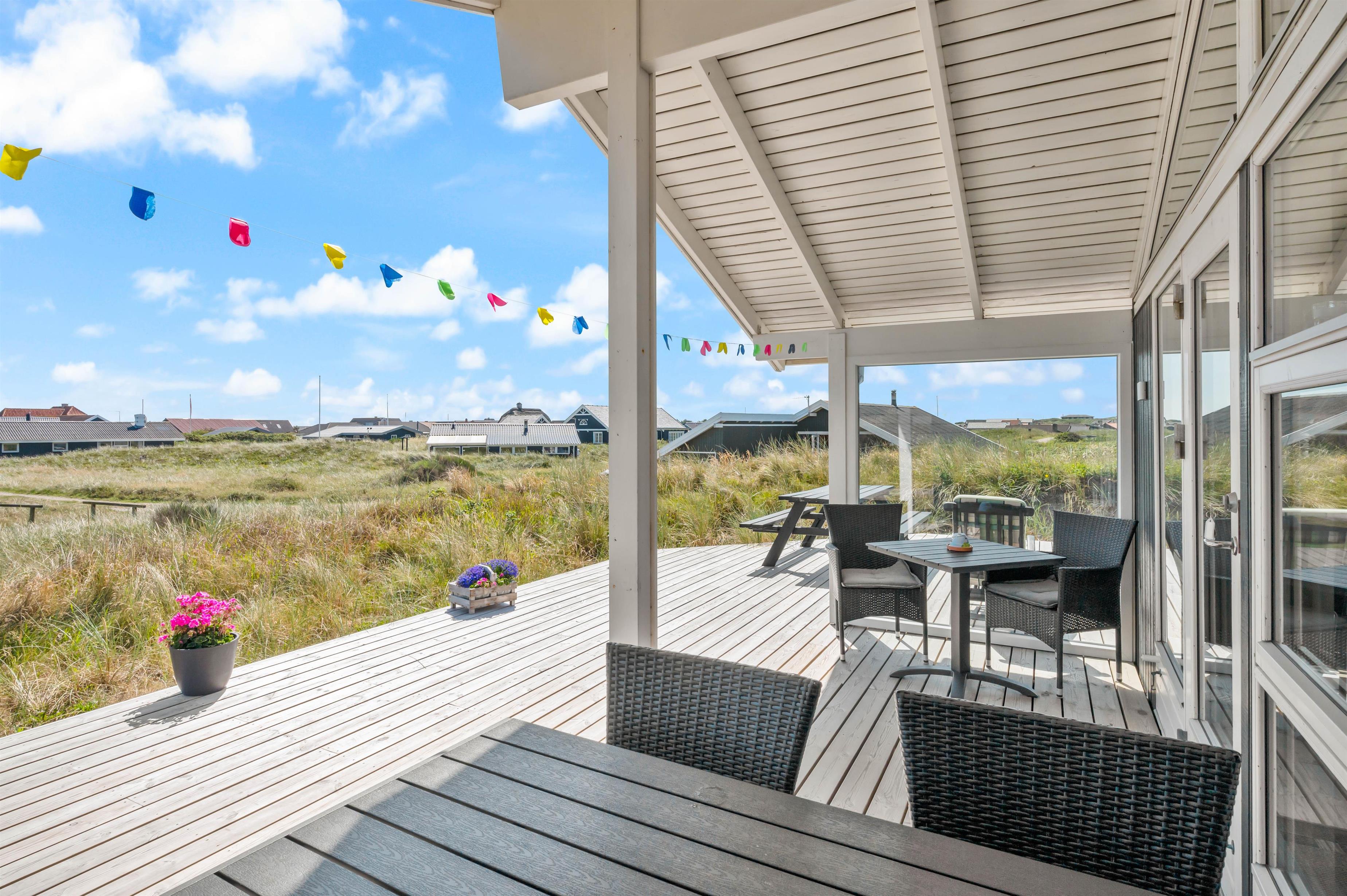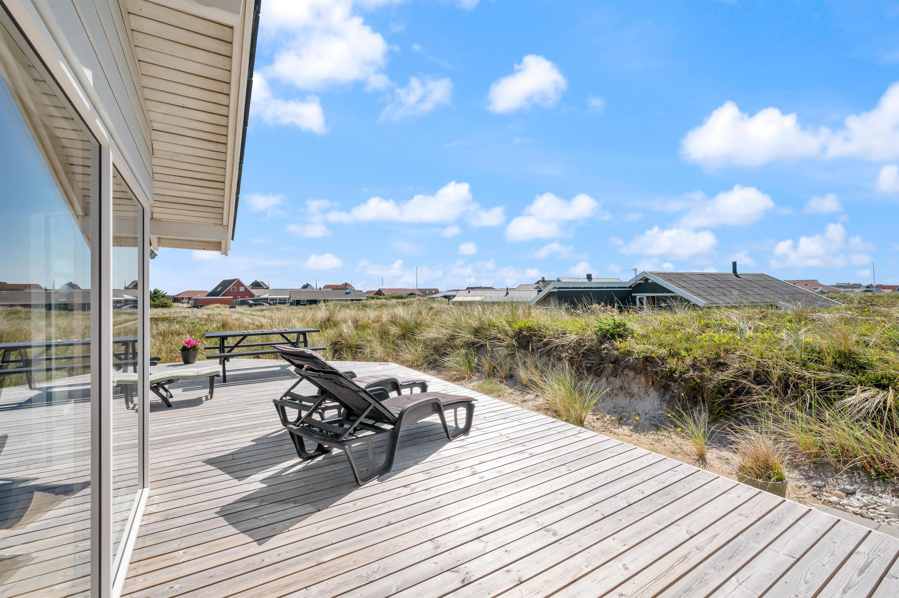 Sommerhuset ligger på en af de karakteristiske klitgrunde i feriehusområdet Årgab. Fra husets delvist overdækkede terrasse kan I nyde udsigten over det dejlige område, mens I nyder morgenmaden i det fri på terrassen i sommerhusets fine havemøbler.