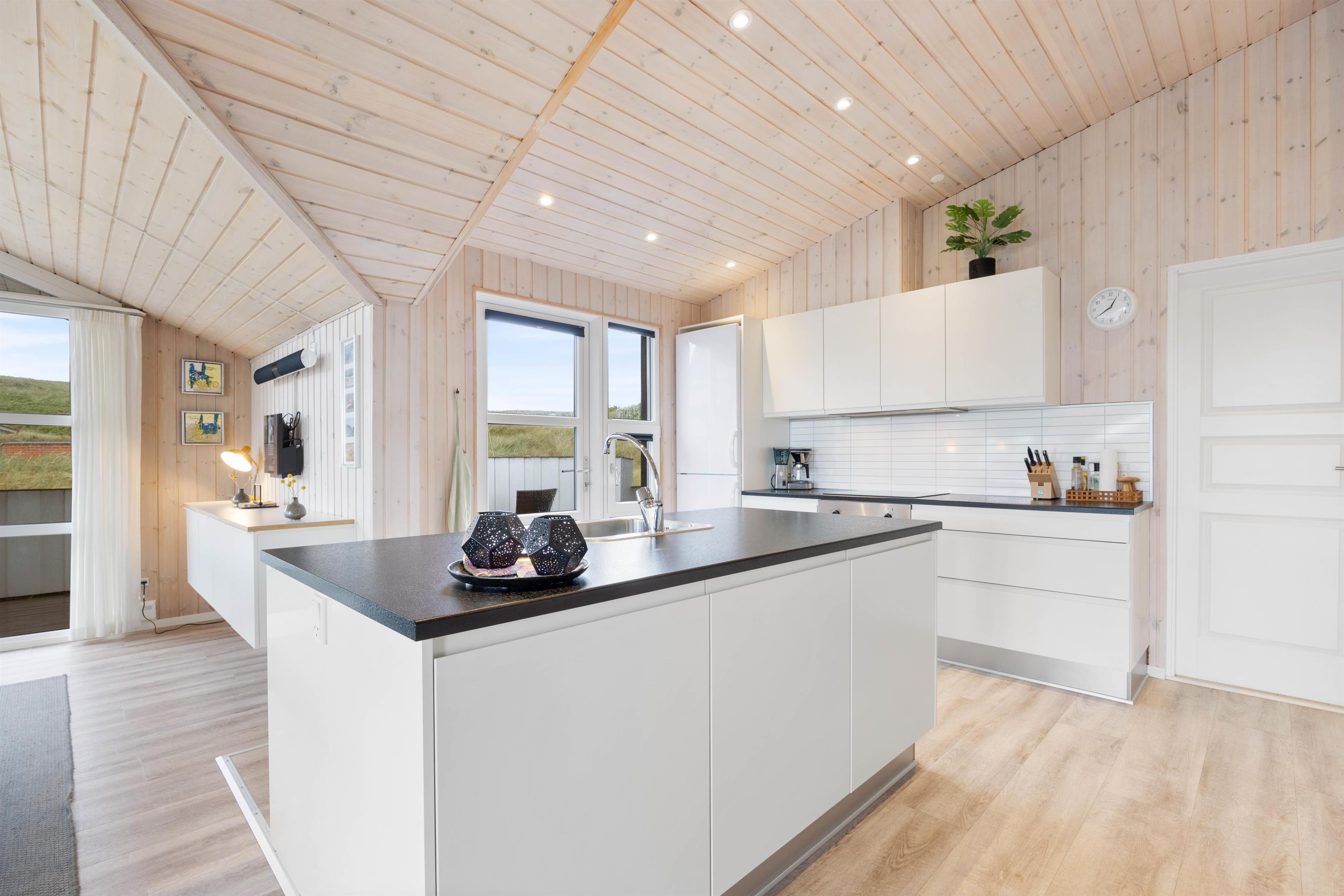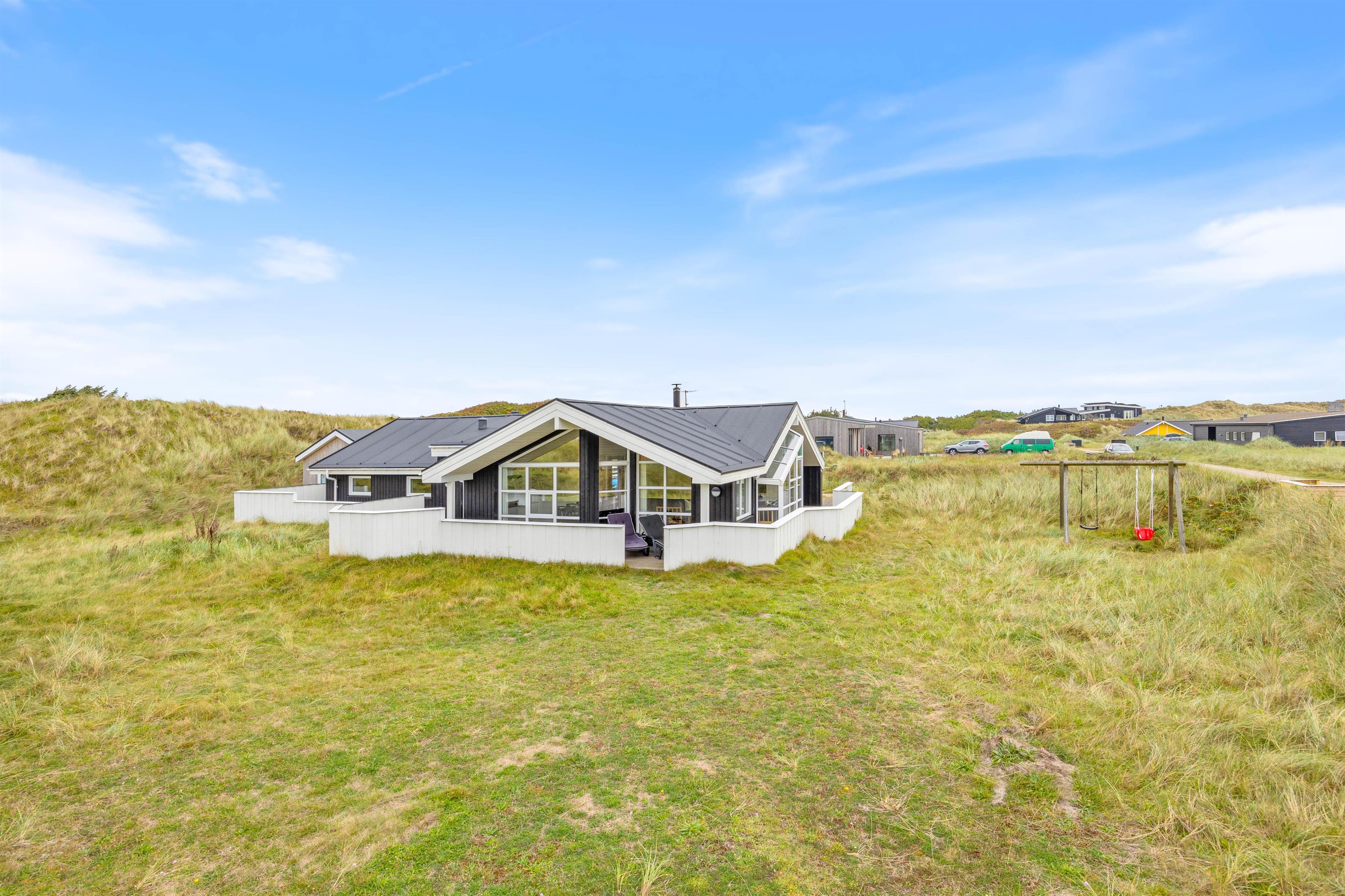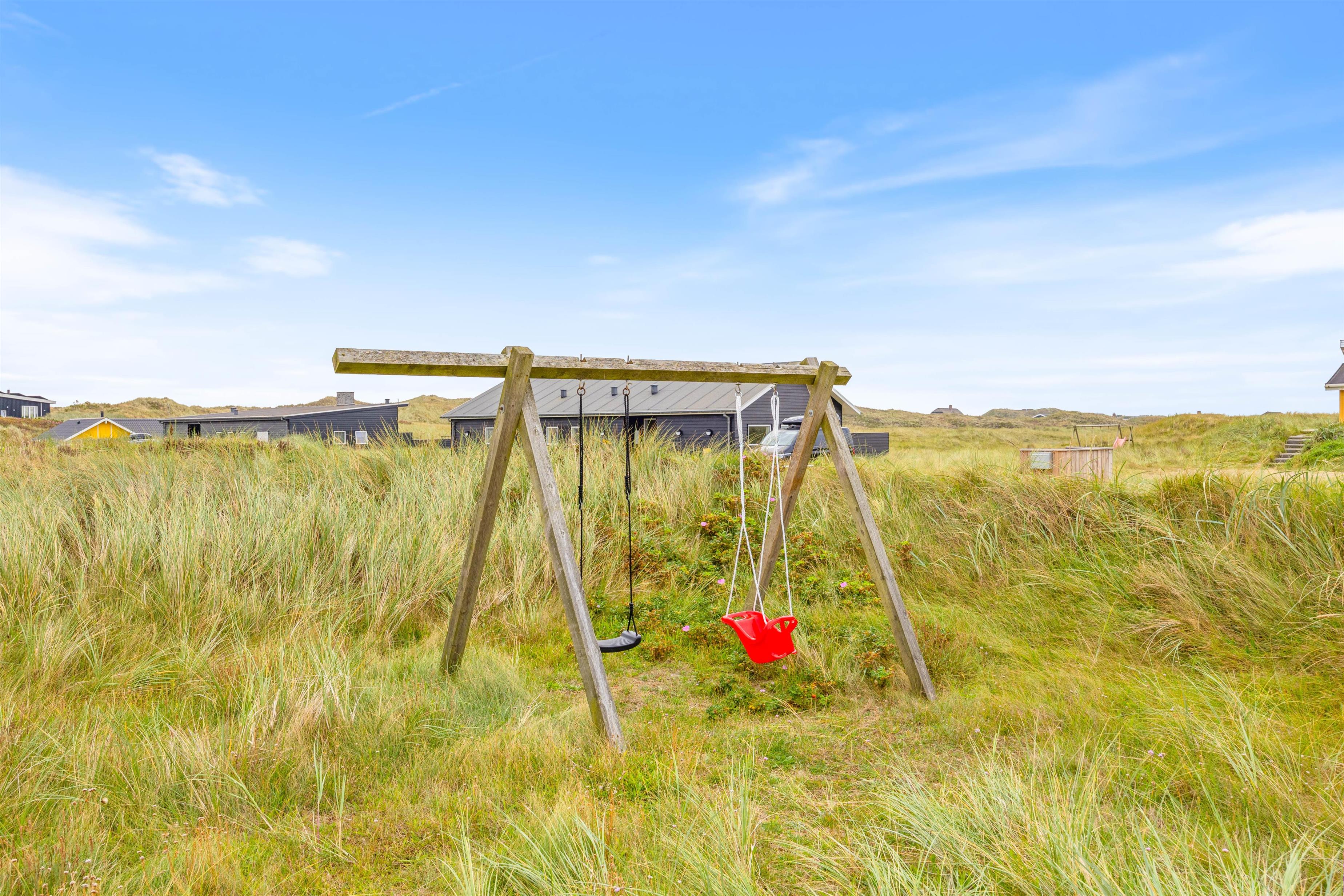 Fra køkkenet kan I gå direkte ud på den delvist overdækkede terrasse, som strækker sig hele vejen fra syd- til nordsiden af feriehuset. Her kan I nyde solen og slutte dagen af med et lækkert grillmåltid med udsigten til klitterne. Til de yngste er der et gyngestativ på grunden.