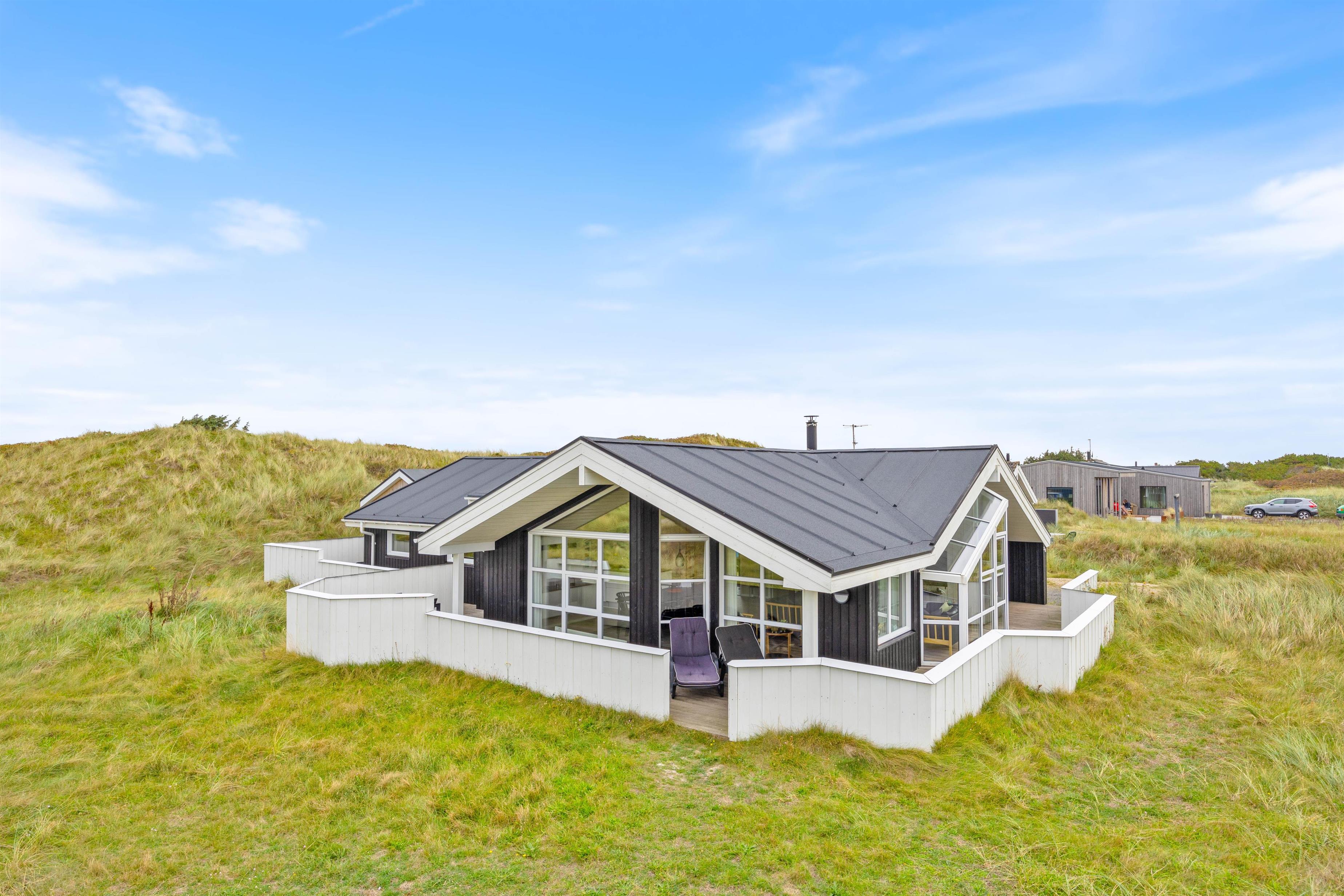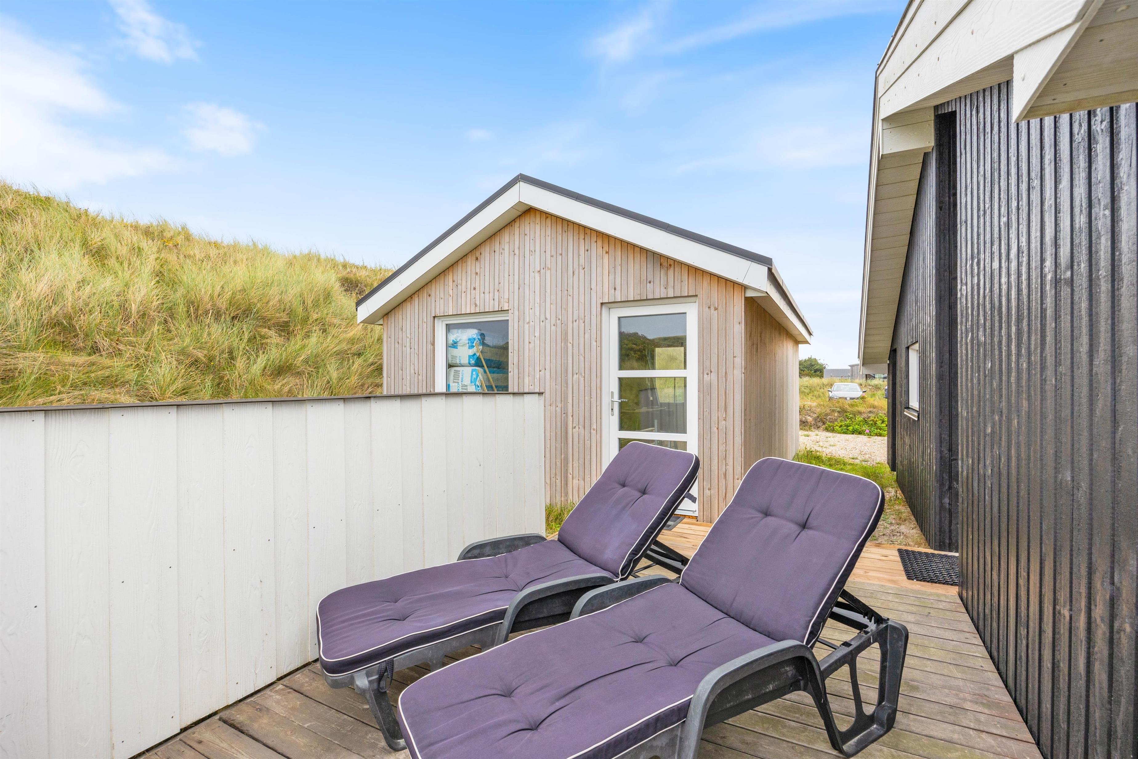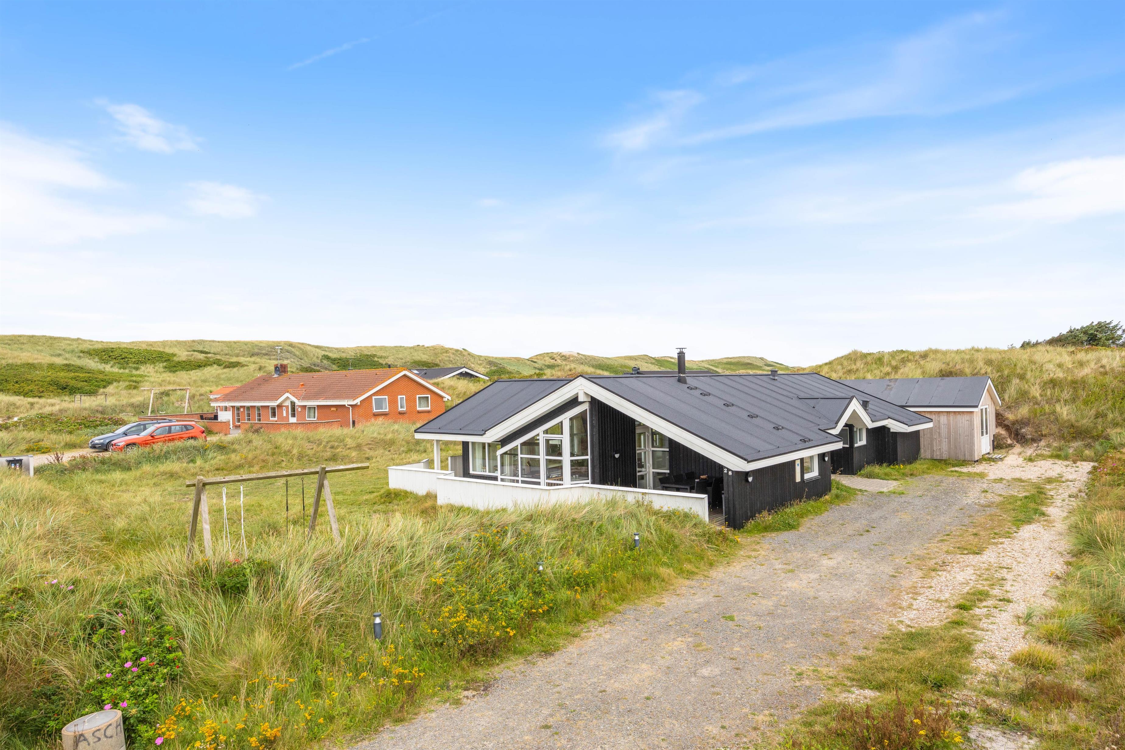 Fra køkkenet kan I gå direkte ud på den delvist overdækkede terrasse, som strækker sig hele vejen fra syd- til nordsiden af feriehuset. Her kan I nyde solen og slutte dagen af med et lækkert grillmåltid med udsigten til klitterne. Til de yngste er der et gyngestativ på grunden.