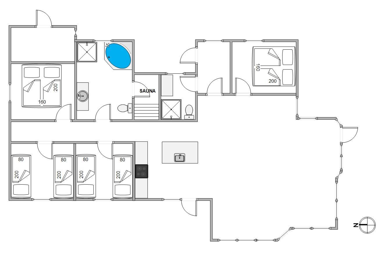 De 8 sovepladser er fordelt på 4 gode soveværelser, hvoraf der er 2 dobbeltsenge. På de sidste 2 værelser er der 2 enkeltsenge. Sommerhuset har 2 badeværelser, som begge er installeret med gulvvarme. På det store badeværelse er der lagt op til afslapning og velvære – her finder I nemlig både sauna og spabad.
