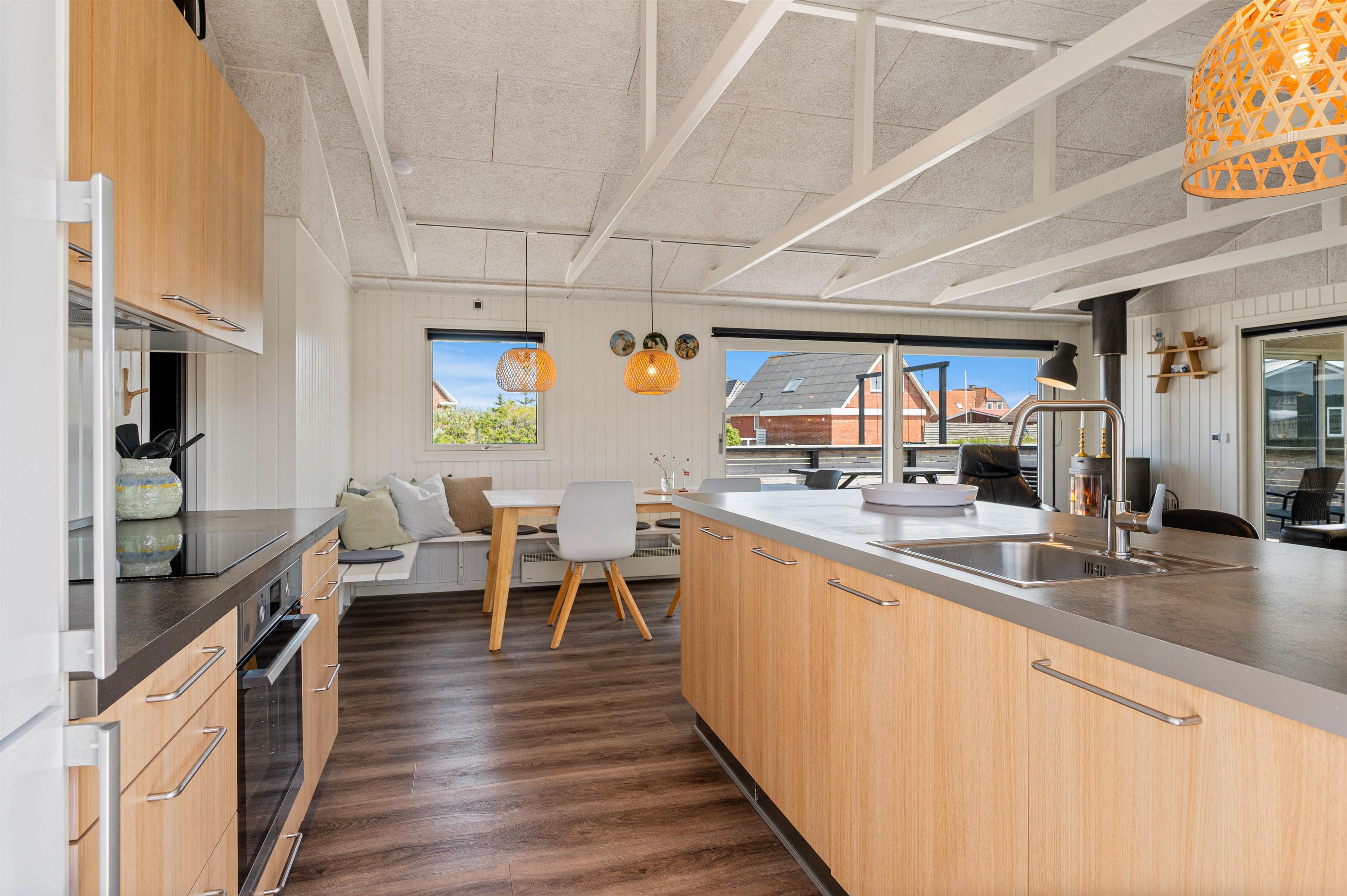 Sommerhuset er særdeles velholdt og indeholder et lyst rum med loft til kip. Stuen er i direkte forbindelse med køkkenet, så der kan kommunikeres fra sofaen til familiens kok, når der skal tilberedes et lækkert aftensmåltid. I stuen er der en brændeovn, som giver varme efter en god gåtur. I kan også bruge den energibesparende varmepumpe til at holde temperaturen behagelig.