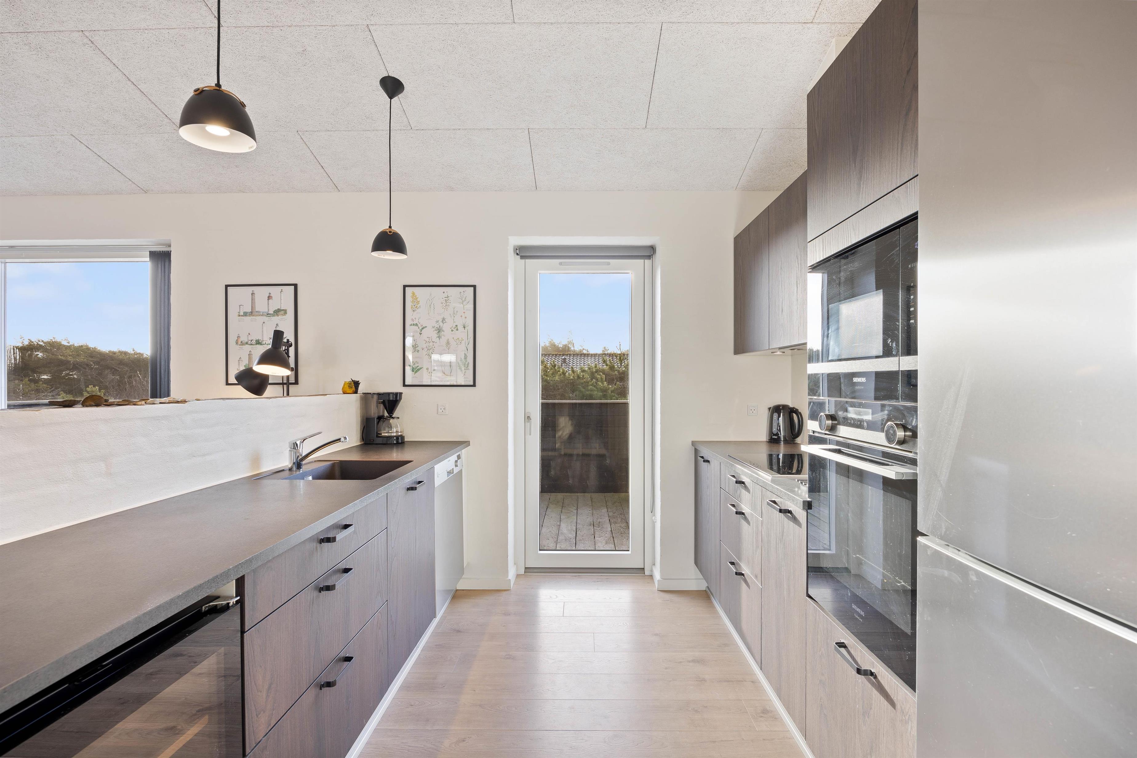 Det flotte opholdsrum med stue, spiseplads og køkken er hjertet i feriehuset, og hvor familien naturligt samles. Igennem de store vinduespartier mod syd har I en flot udsigt ud over sommerhusområdet og det flotte klitlandskab.