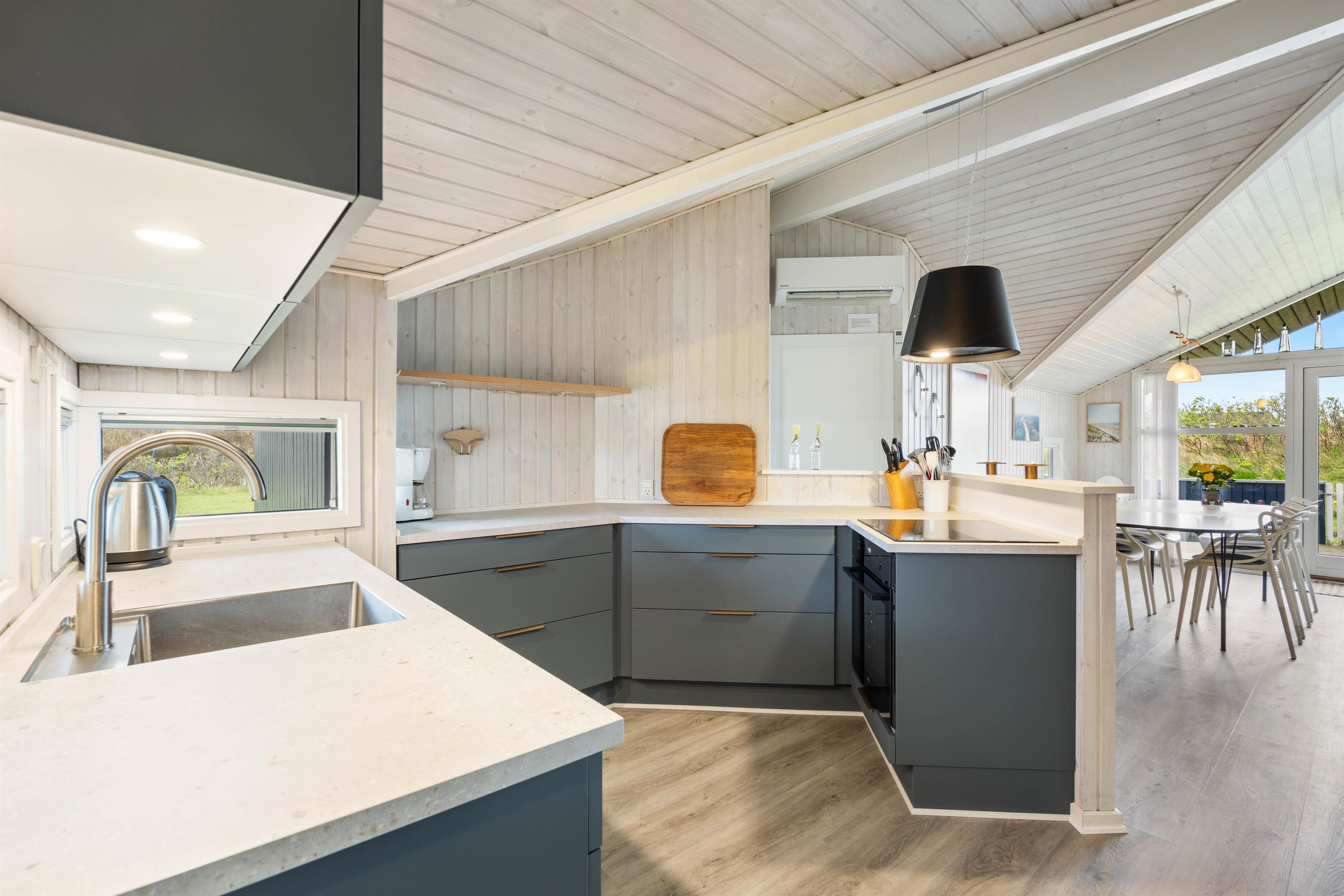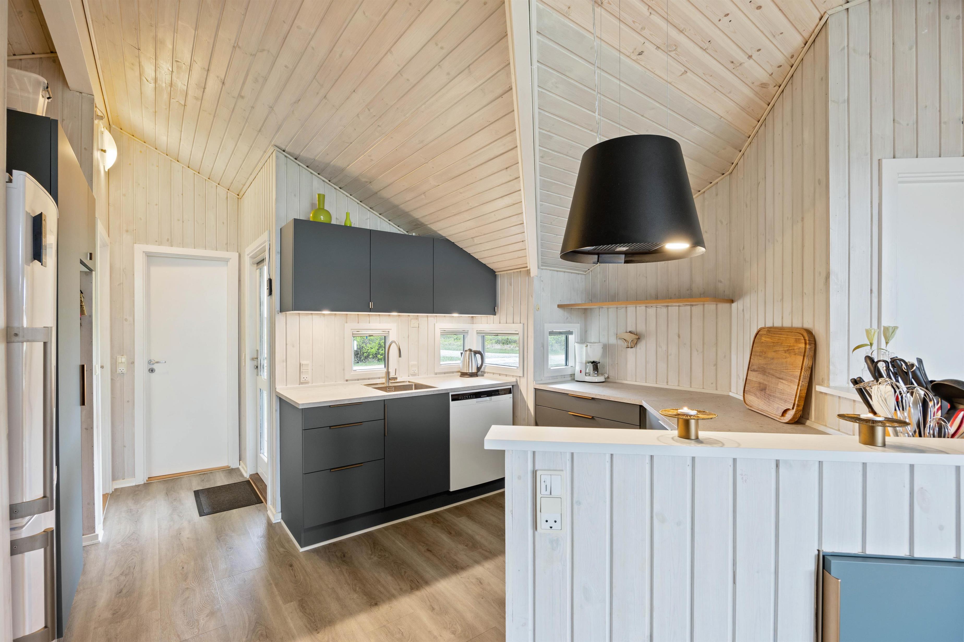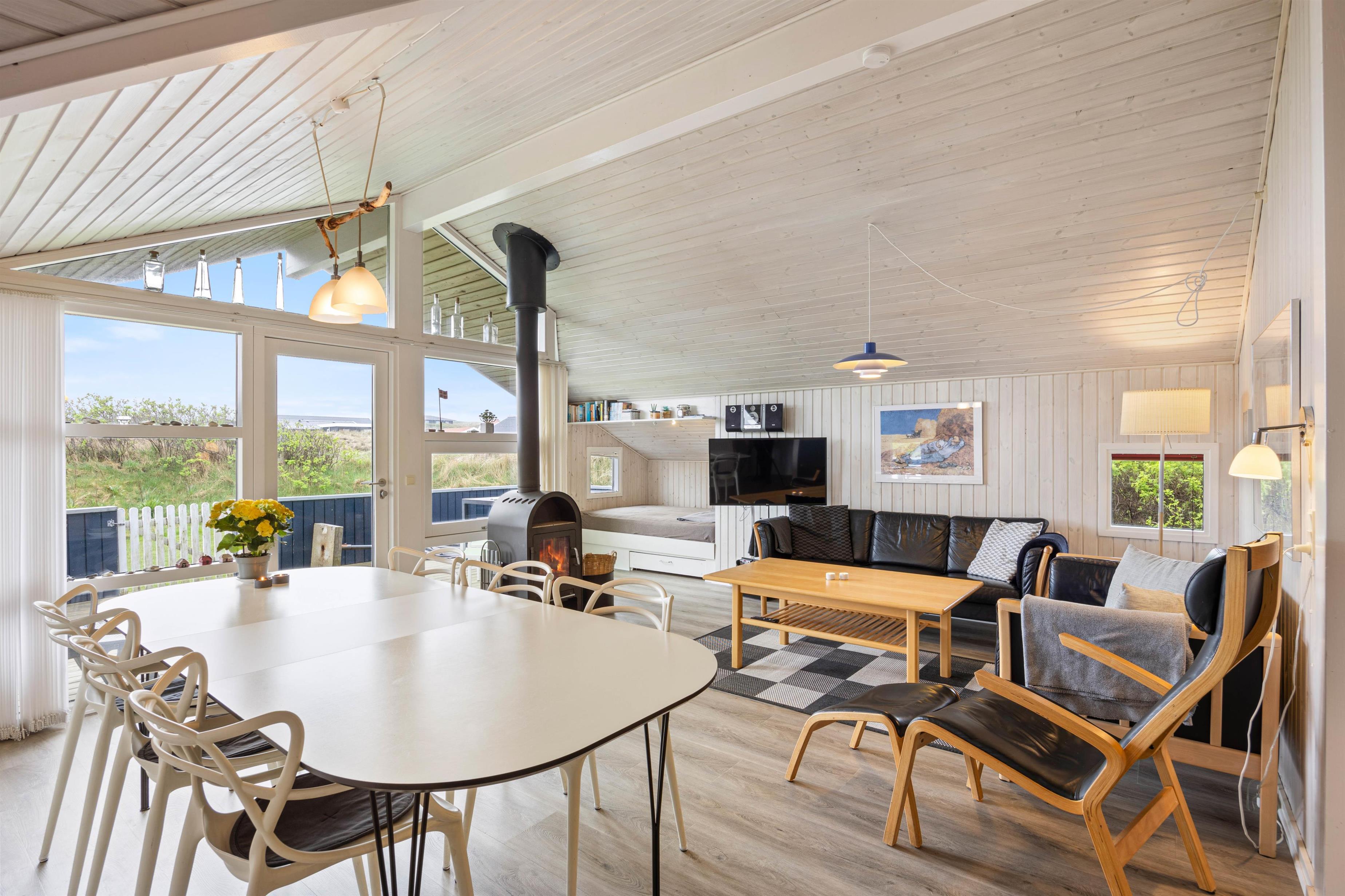 Sommerhuset har et rummeligt køkkealrum kombineret med stuen. Her er åbent til kip og masser af lysindfald fra glaspartiet mod syd, så i altid kan nyde solstrålerne. Sæt dig godt til rette i de komfortable stuemøbler, mens du nyder lyden af den knitrende brændeovn og stream jeres yndlingsfilm eller serie på chromecasten.