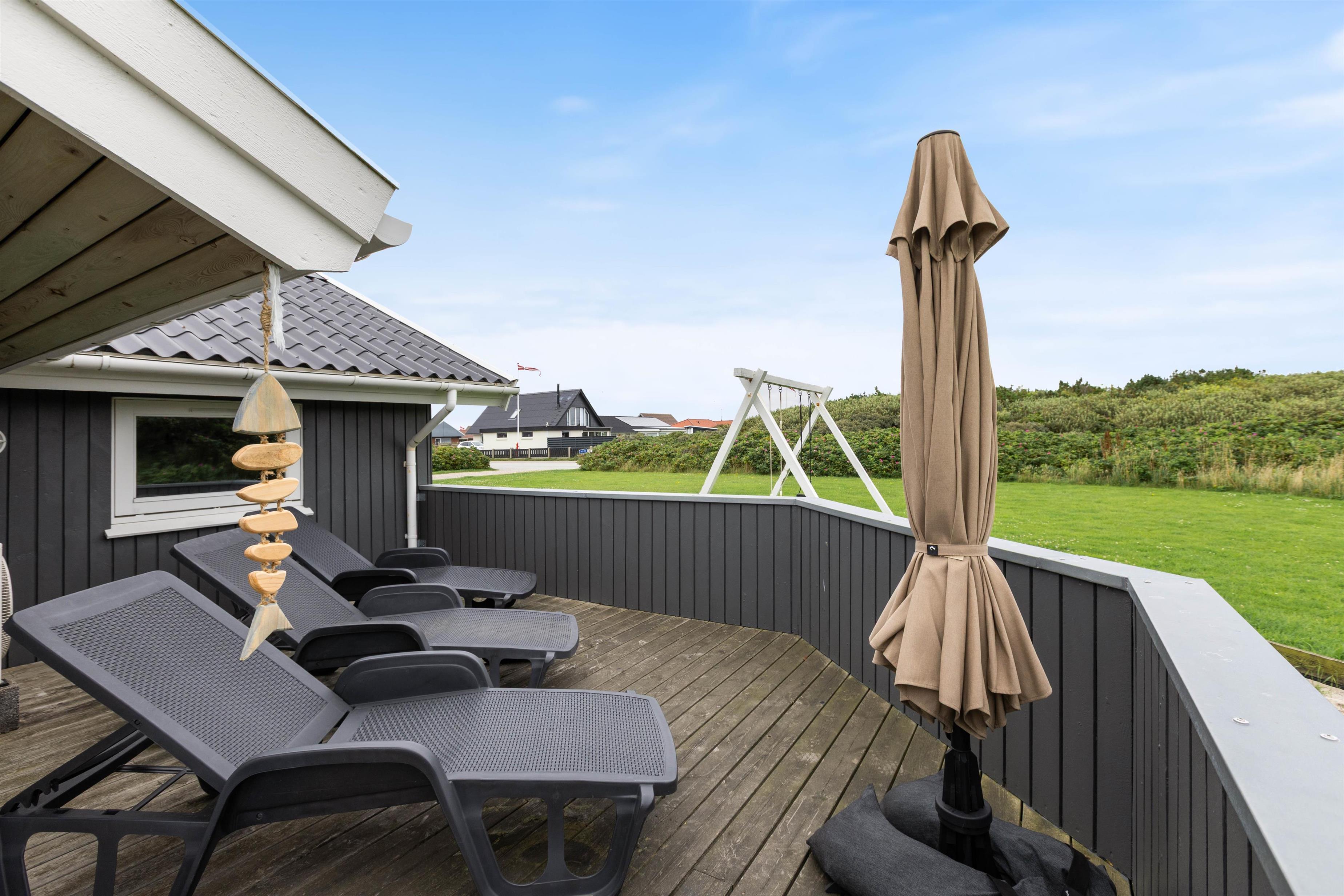 Sommerhusets lukket terrasse byder på mange timers afslapning i solen, hvor I kan lade jeres mindre børn og hund rende rundt uforstyrret. Her kan der også tilberedes dagens aftensmad på grillen, mens børnene er underholdt i sommerhuset sandkasse og på gyngestativet. Til aften kan i afslutte dagen på en afslappende måde i husets have møbler med et tæppe over benene og et brætspil