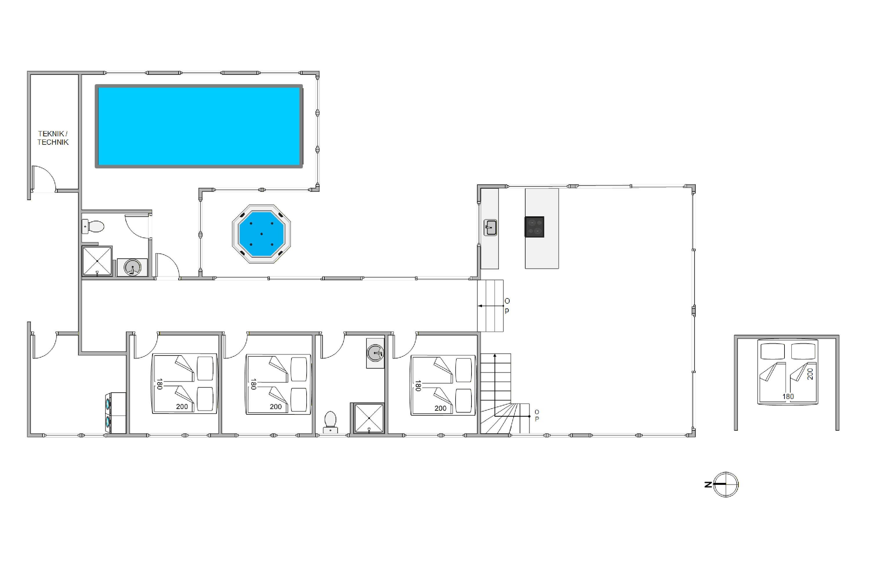 En af sommerhusets absolutte højdepunkter er den imponerende poolafdeling. Den 25 m² store pool er udstyret med svømmetræner, så både motion og leg kan kombineres uanset vejret udenfor. Til dem, der foretrækker ren afslapning, er det muligt at nyde den afslappende udespa efter en dag fyldt med aktiviteter.