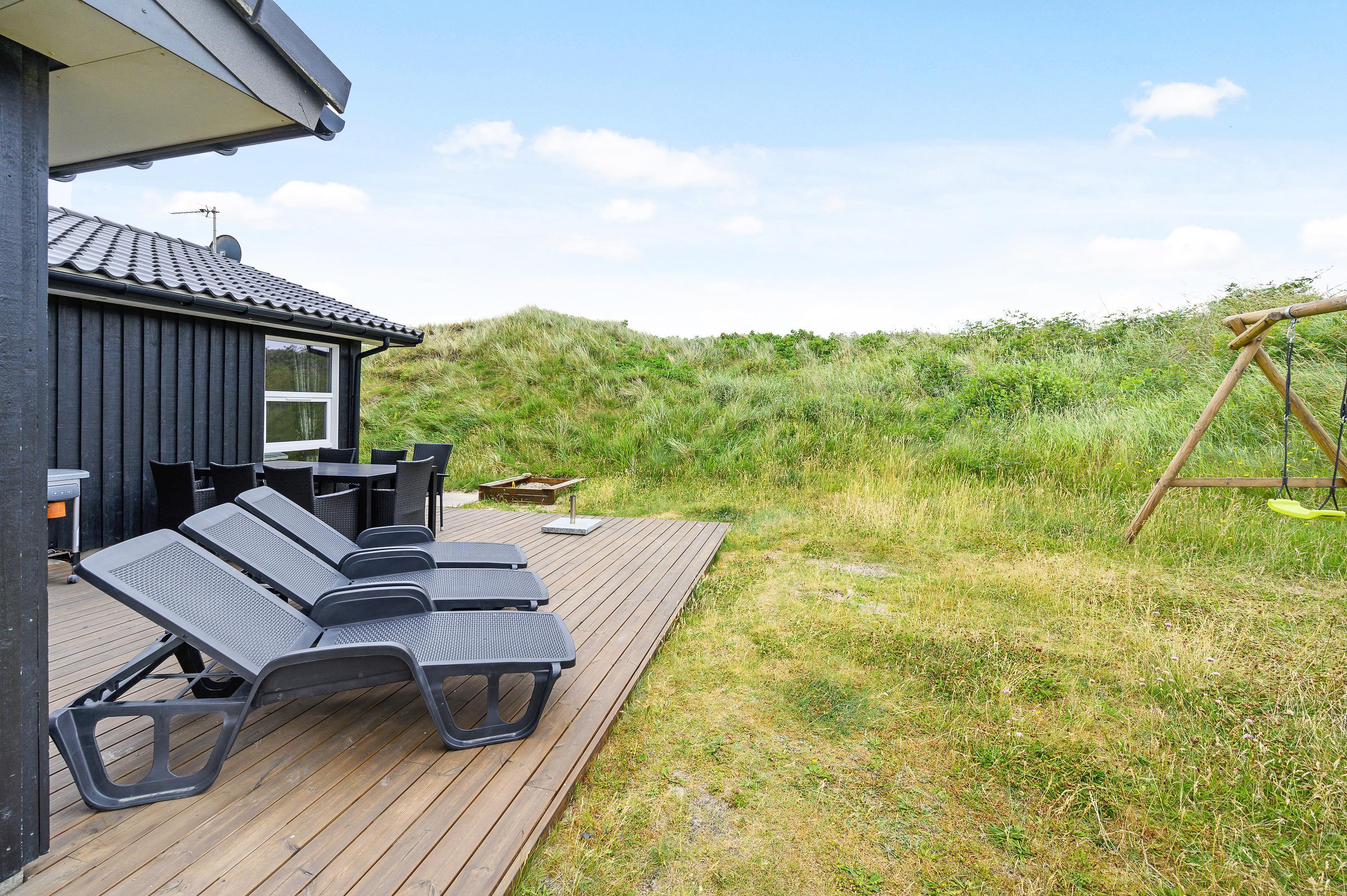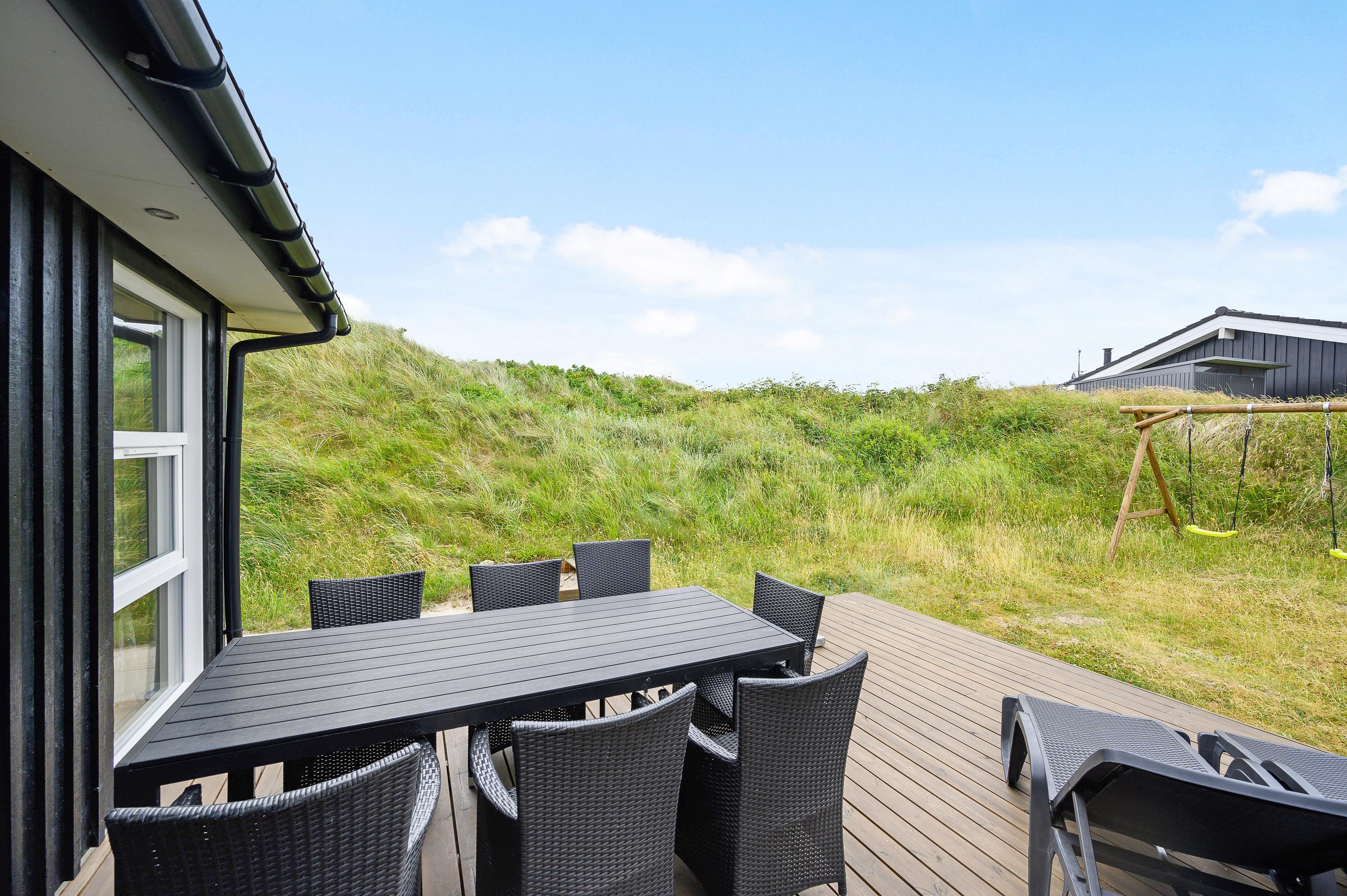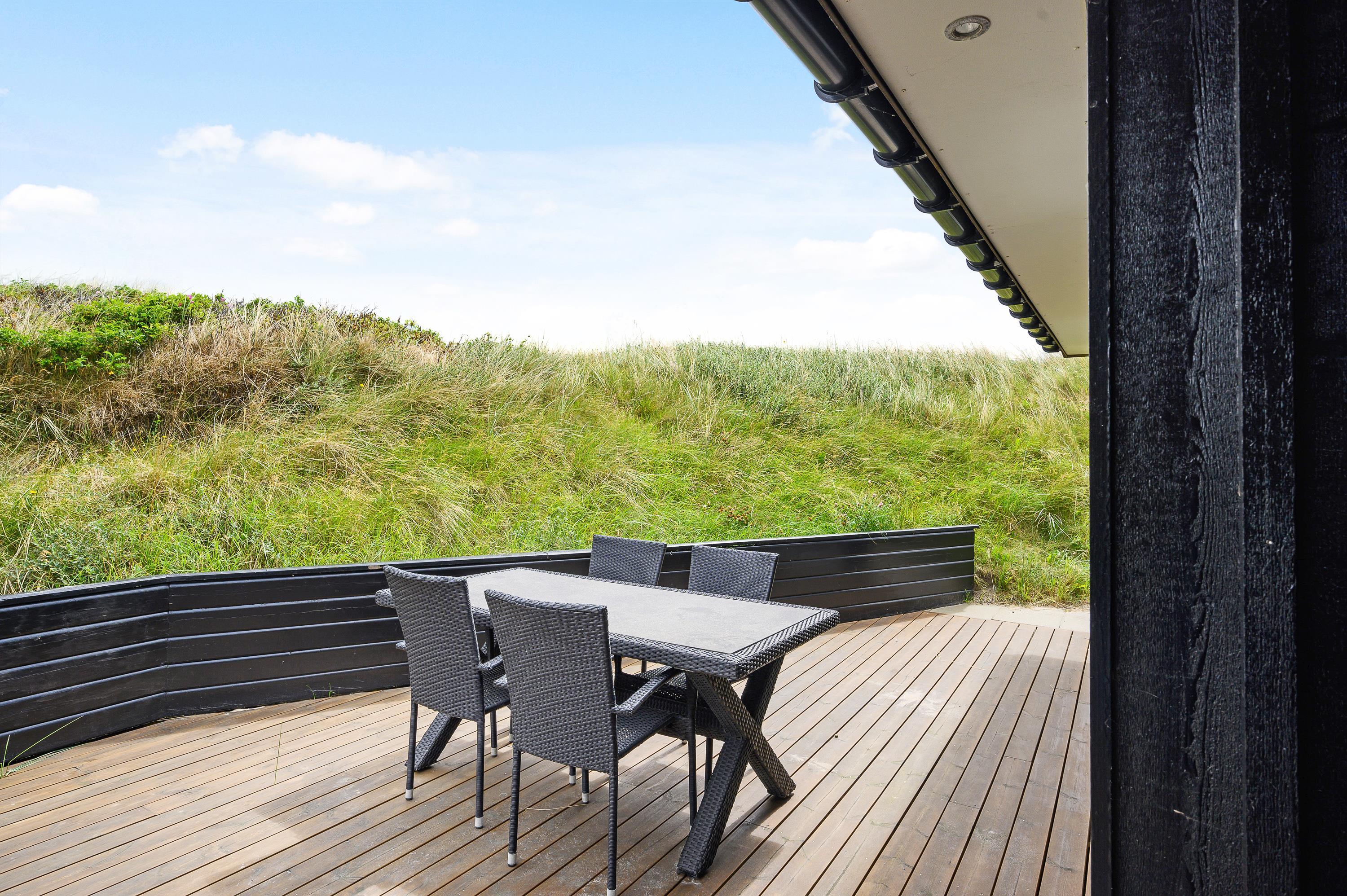 Fra den åbne terrasse kan I nyde den smukke udsigt, der understreger, hvor langt væk I er fra den grå hverdag. På de varme sommerdage kan I dase i liggestolene med en kold drink i hånden, mens børnene leger i sandkassen eller på gyngestativet, og når vejret viser sig fra sin mindre gode side, kan I sidde i ly under den overdækkede del af terrassen.