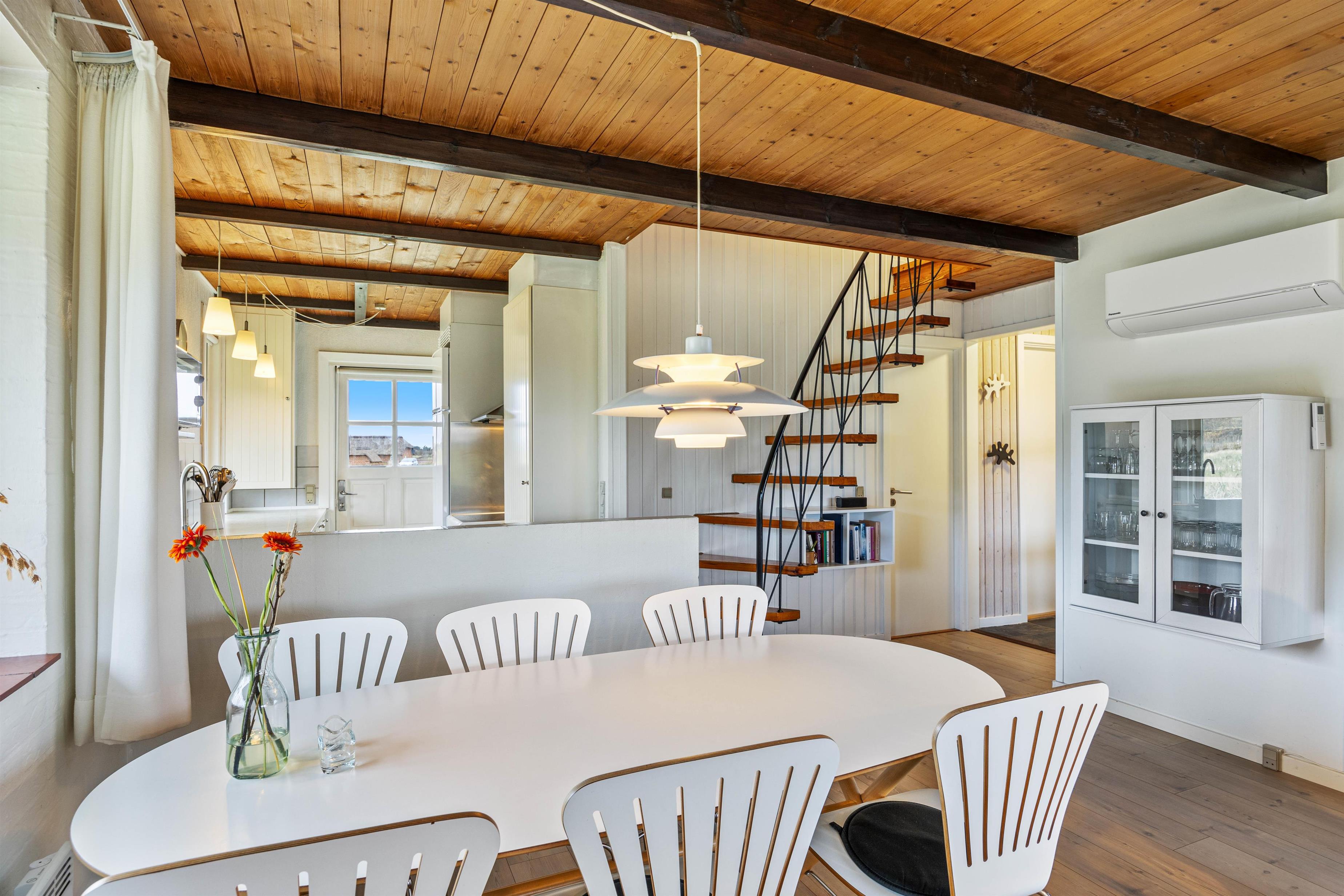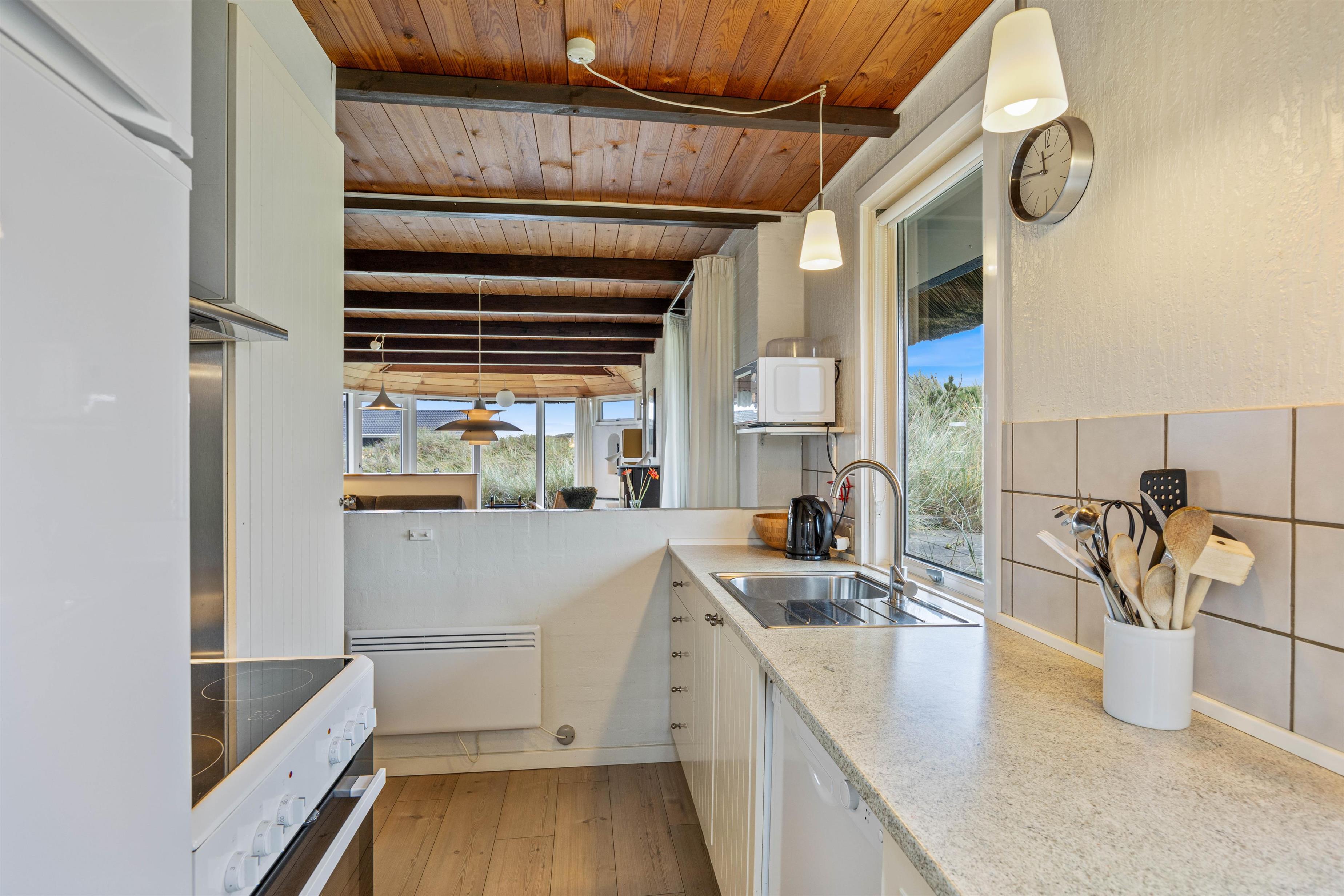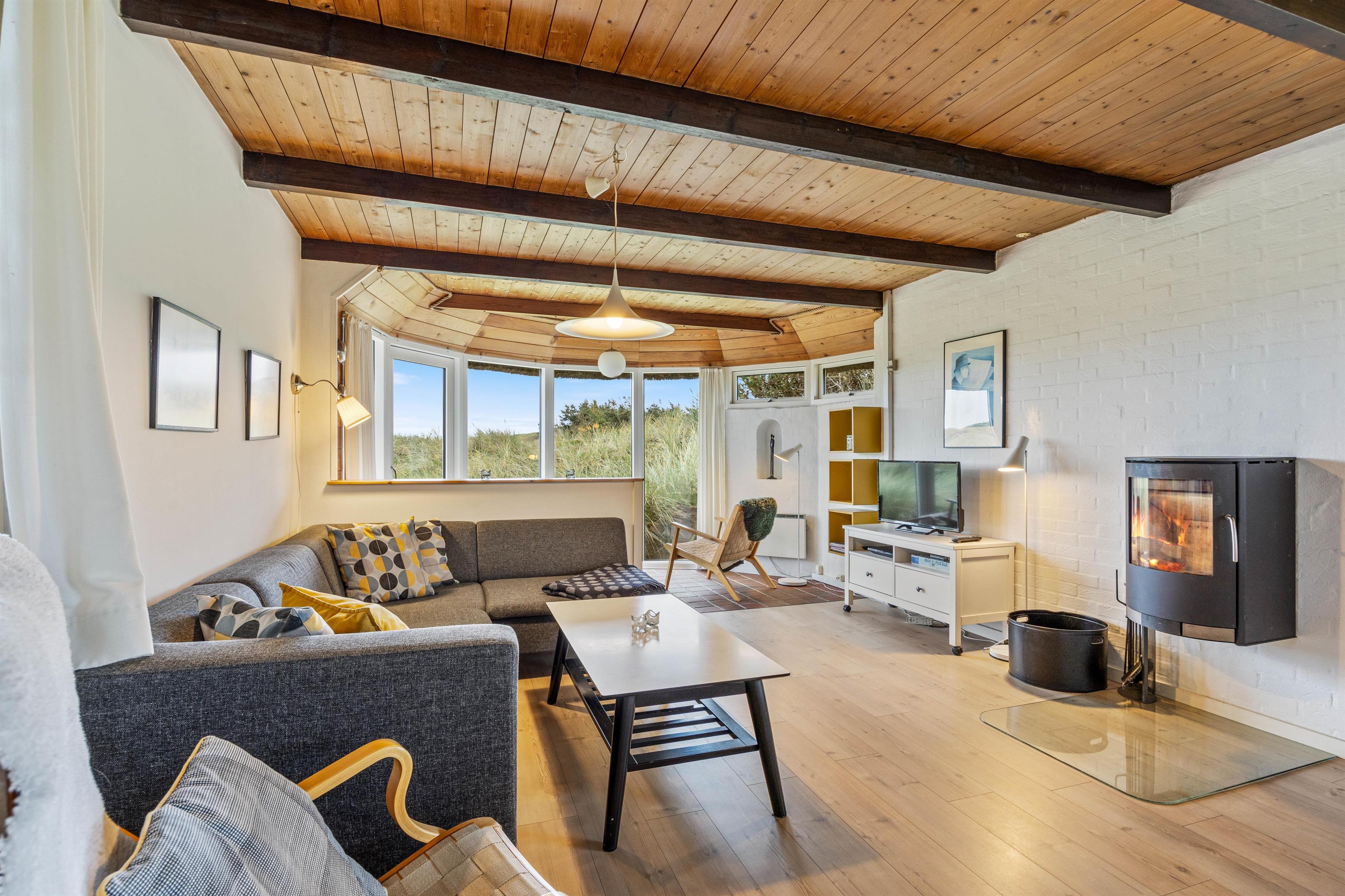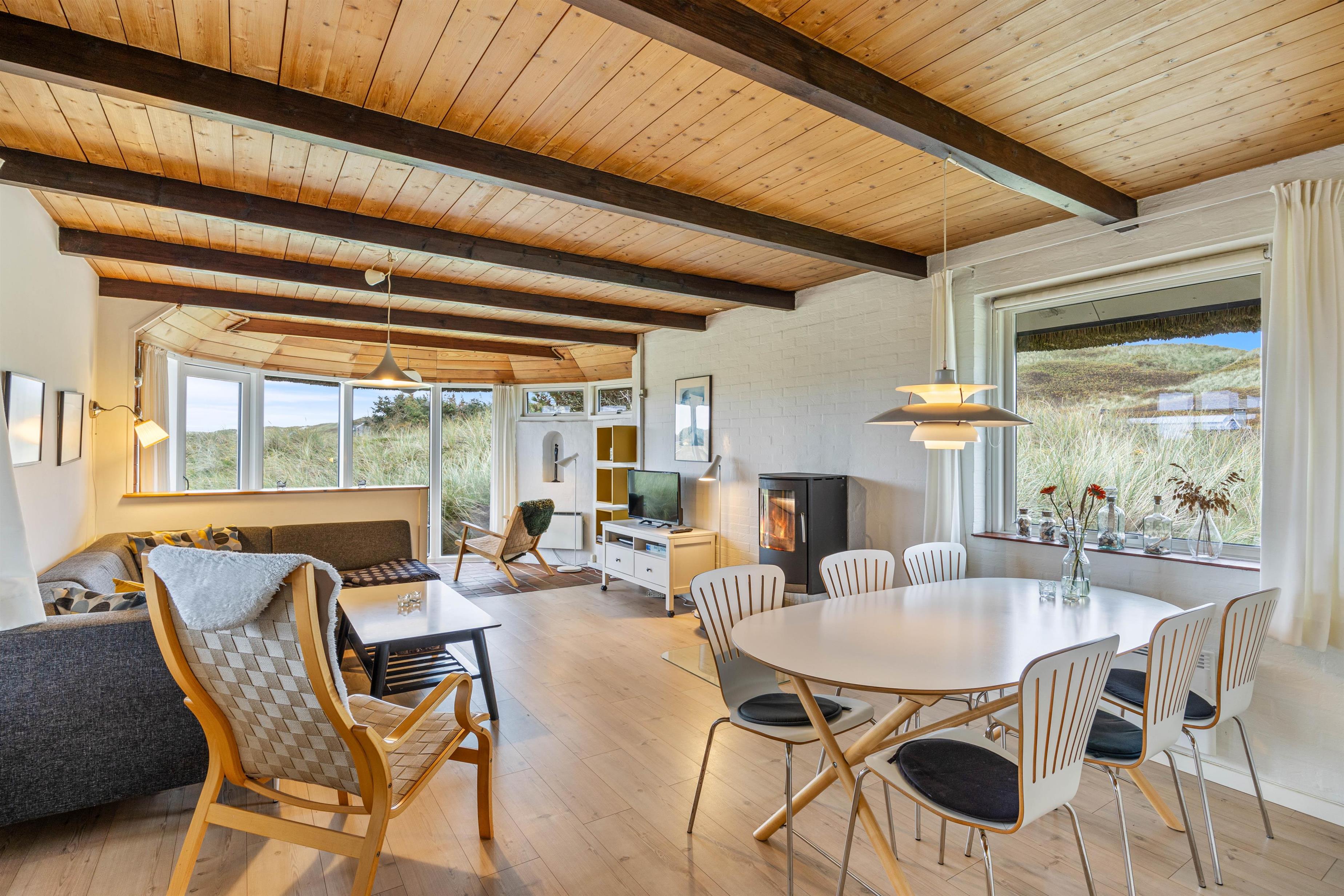 Her vil I hurtigt mærke den afslappende atmosfære med de moderne komfortable møbler og de mange vinduer som giver et dejligt lysindfald. Køkkenalrummet er hjertet af sommerhuset, og her vil I kunne lade batterierne op igen. Så sæt jer foran fjernsynet, nyd jeres favorit tv-program mens I bliver holdt lune af brændeovnen. En ekstra bonus i dette hus er den skønne udestue, hvor der er mulighed for at nyde varmen fra solen og udsigten i alle slags vejr.