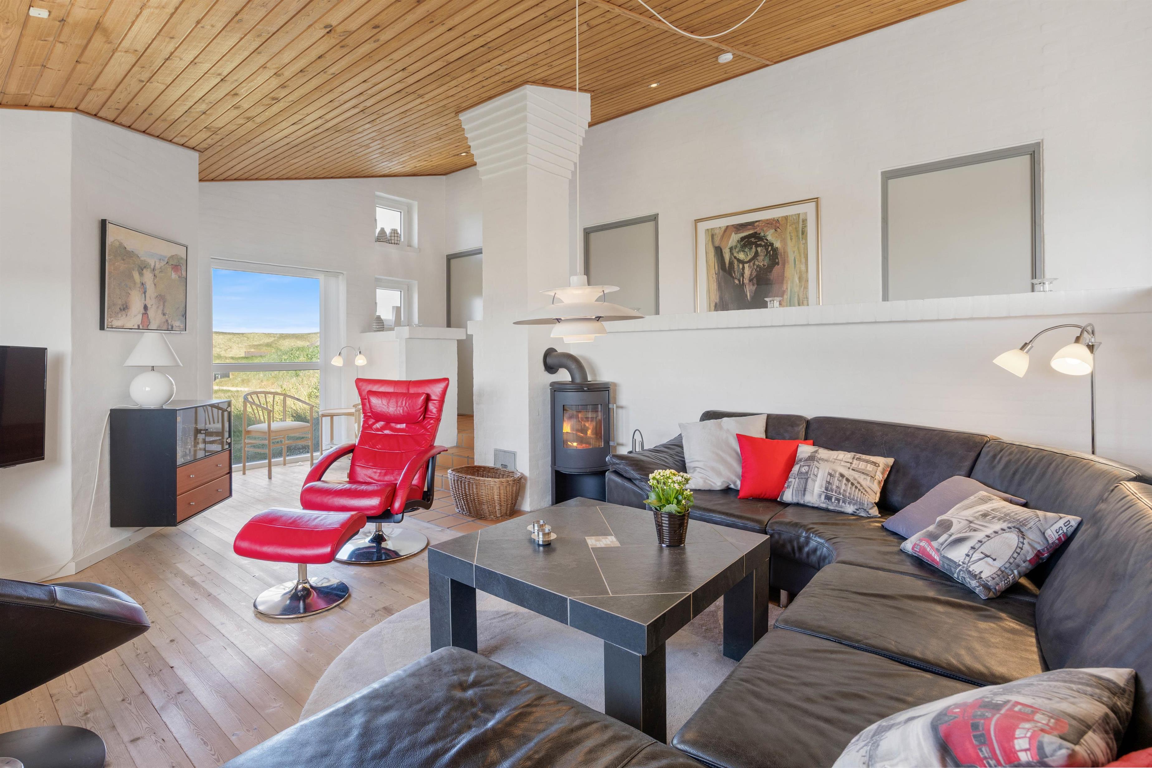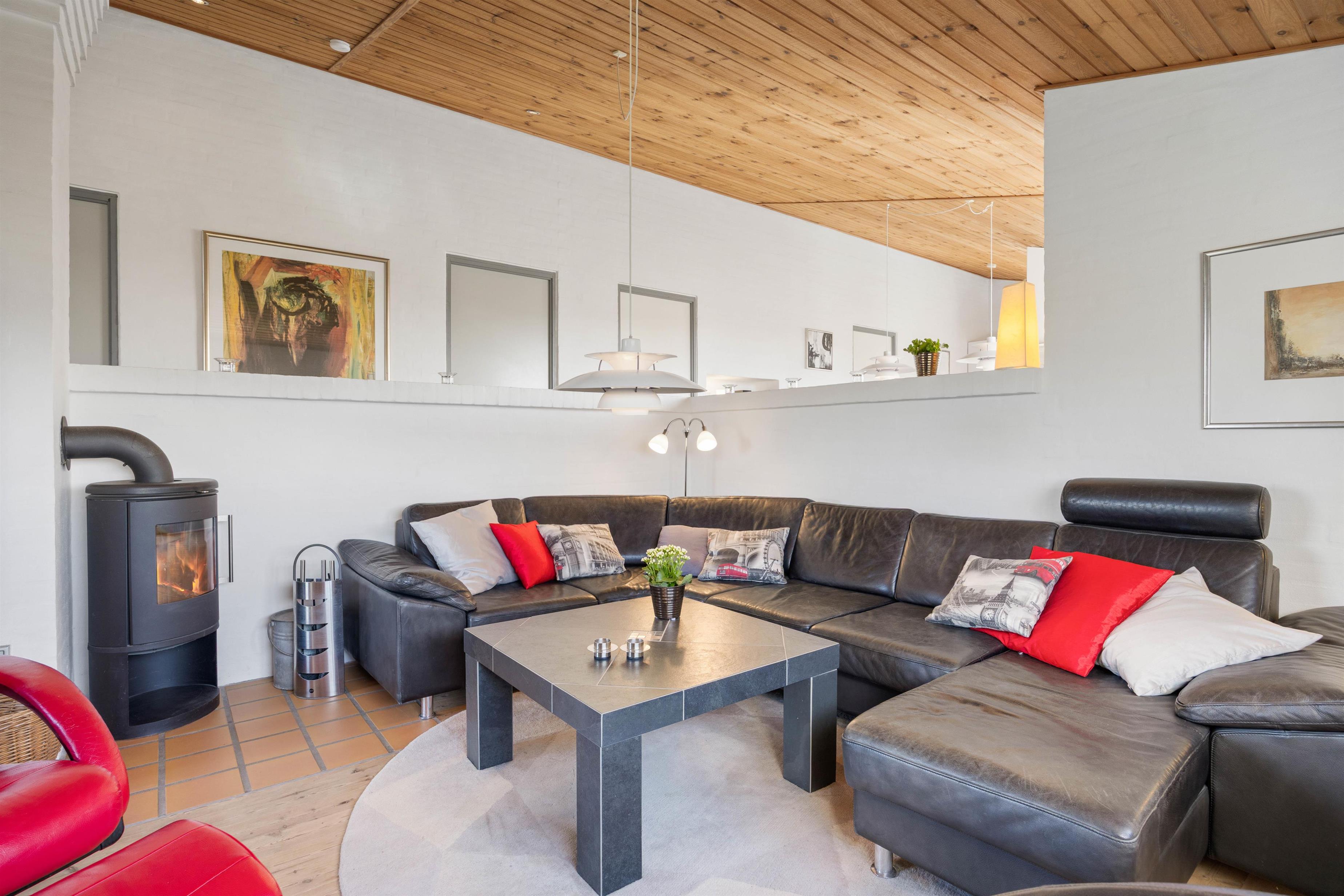 Stuen finder du i forskudt plan, hvilket har en god effekt og nærmest gør den til en rigtig hyggekrog, hvor der slappes af med en god film og ild i brændeovnen.