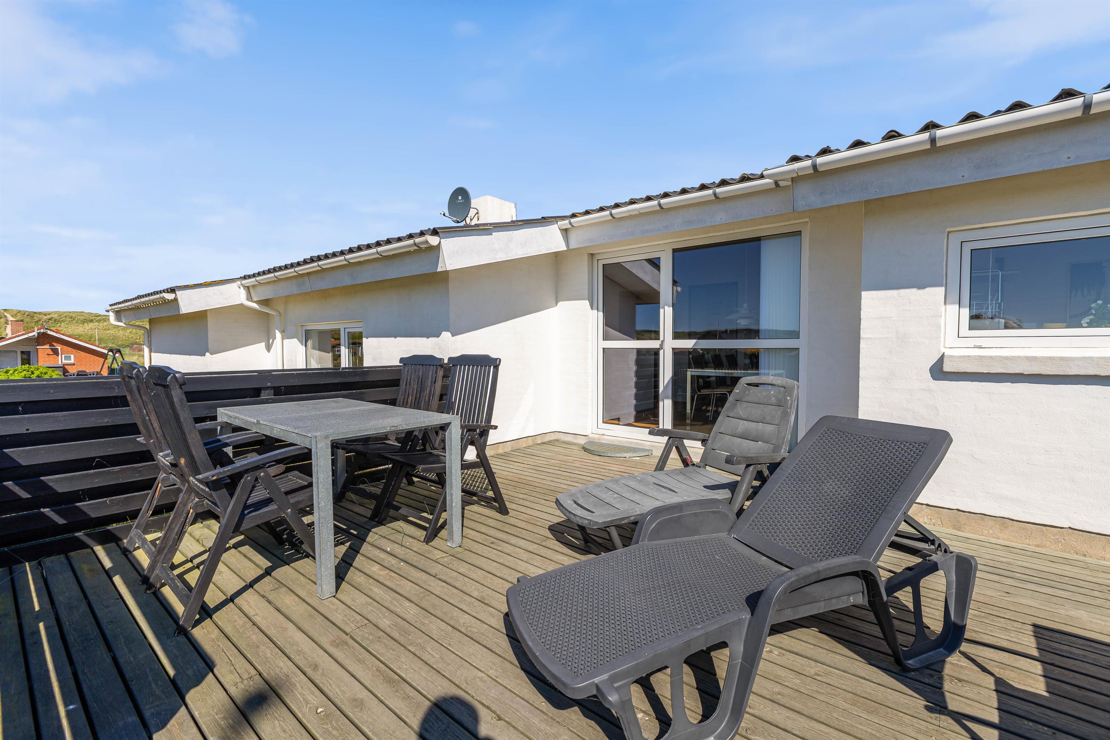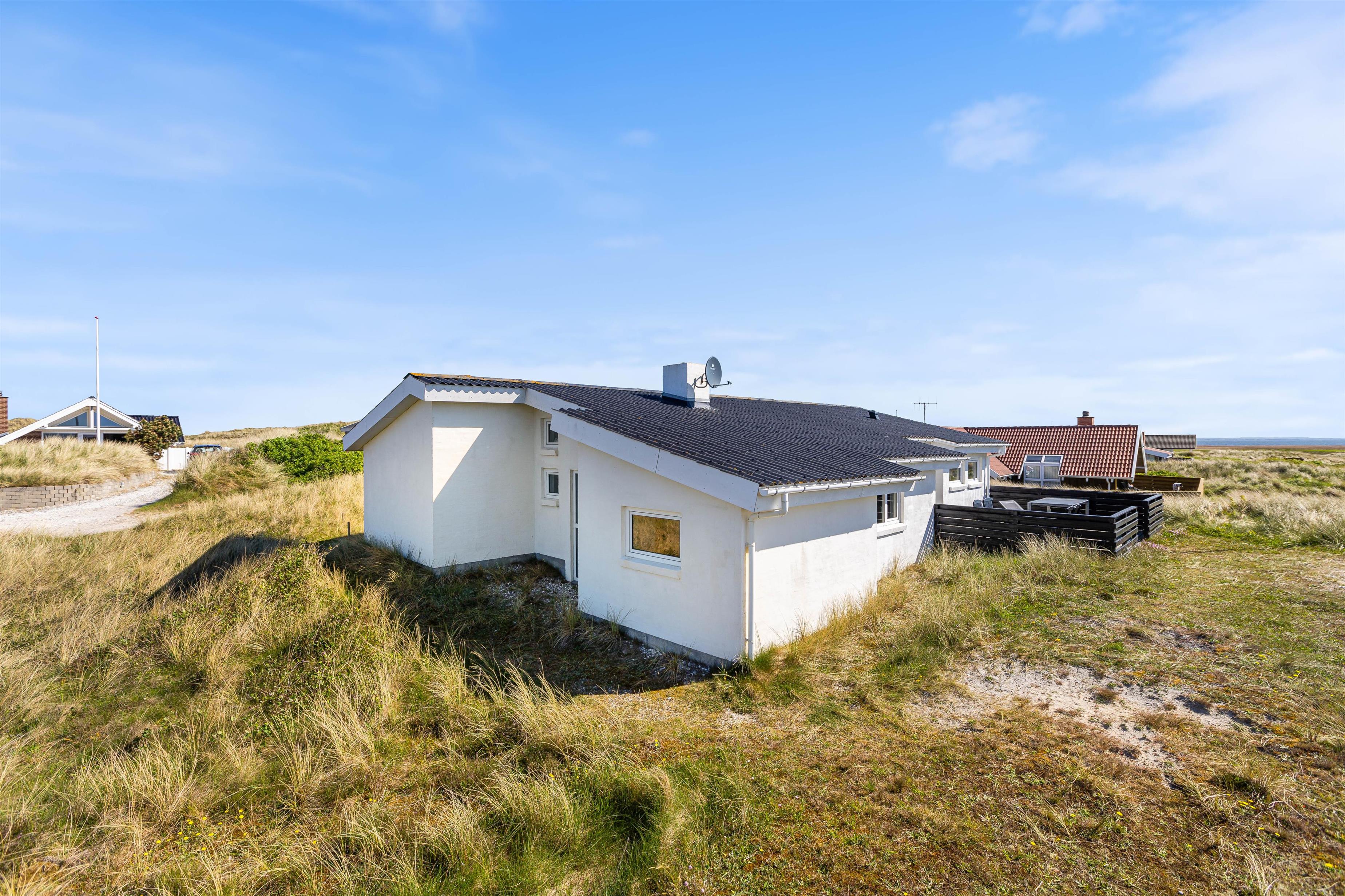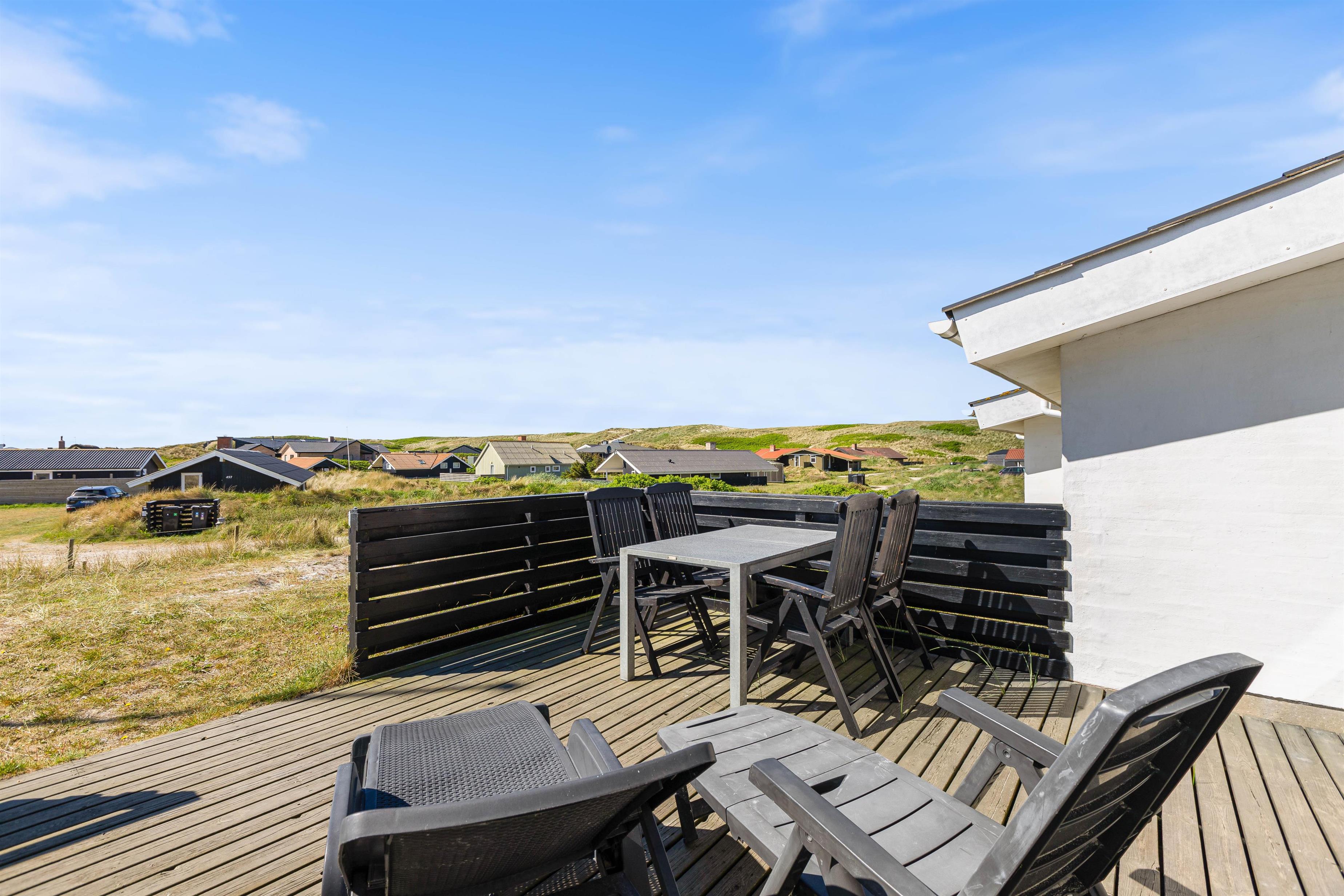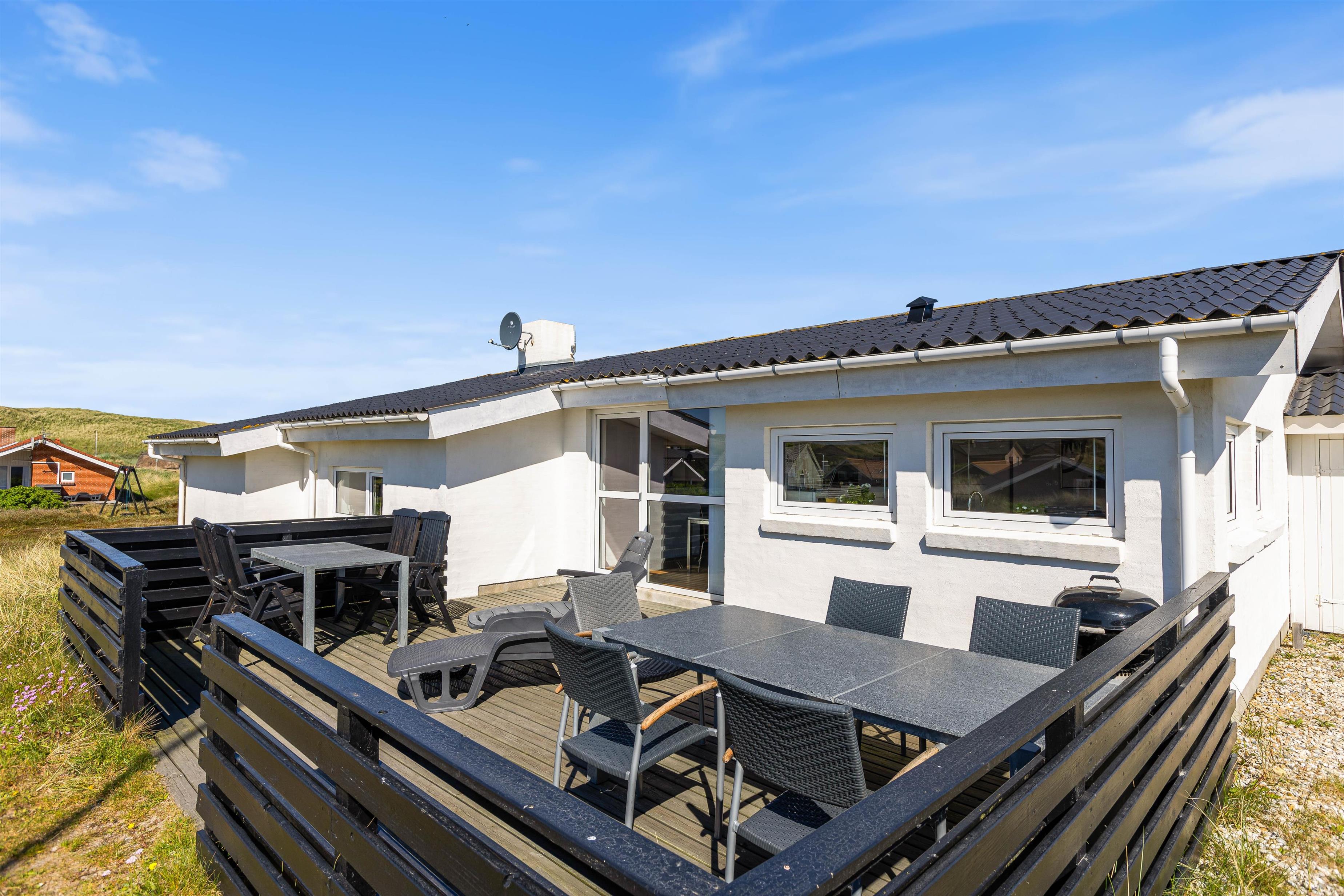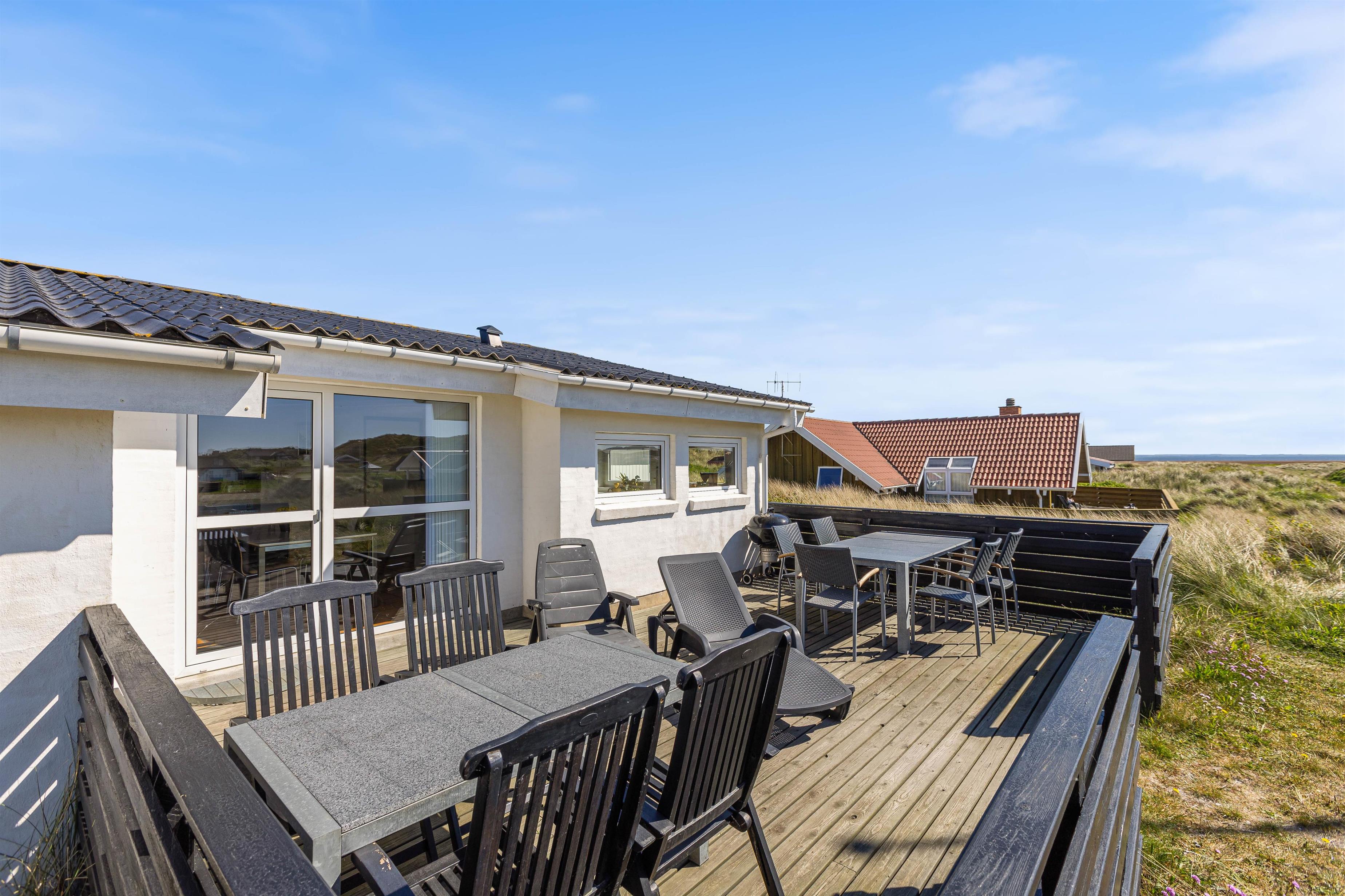 Feriehuset ligger på en skøn naturgrund, så du rigtig kan opleve den vestjyske natur med marehalm og klitter. Og på den gode terrasse kan du slappe af i liggestolen med en god bog, eller nyde morgenkaffen, frokosten eller grillaftenen med udsigten til fjorden i baggrunden.