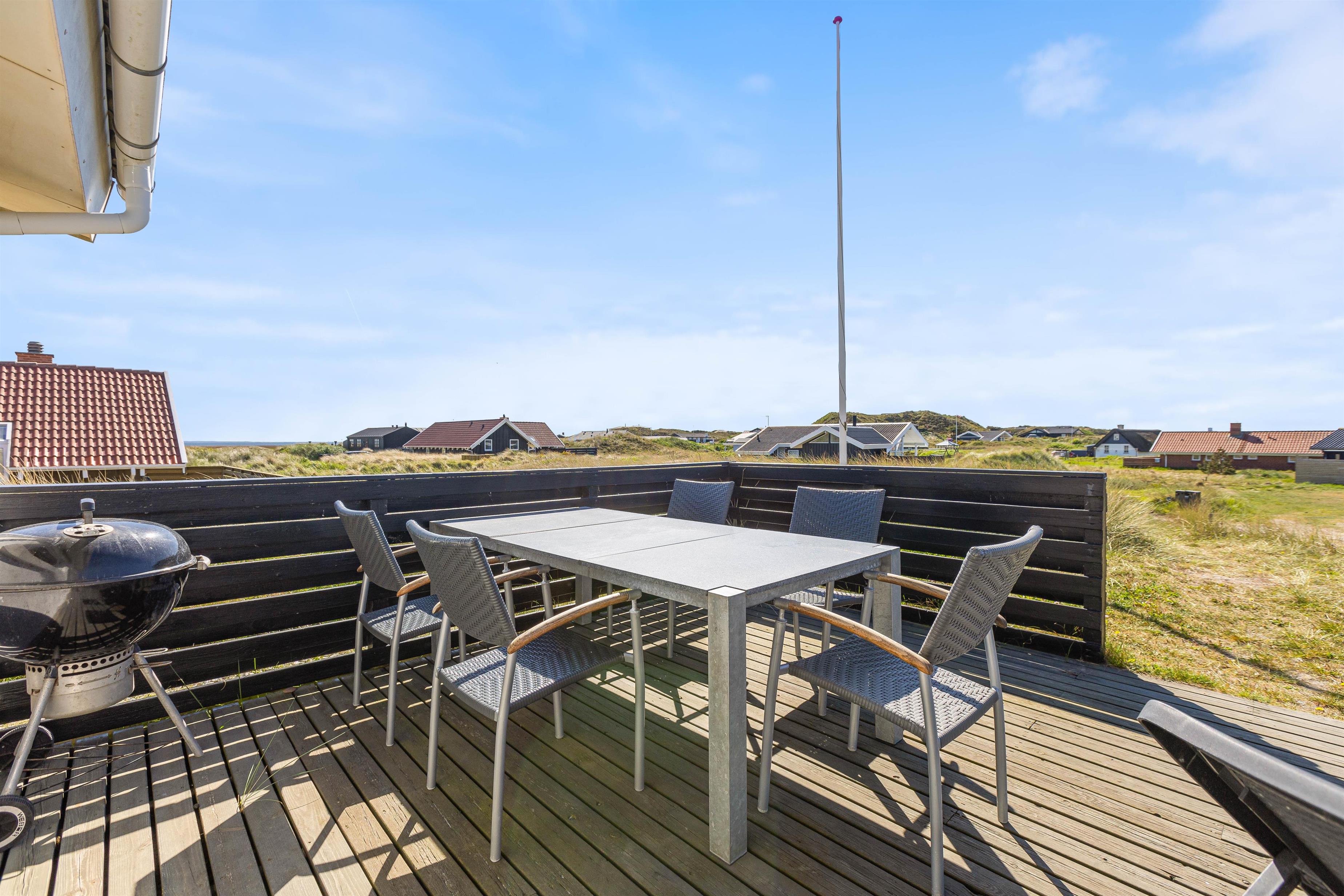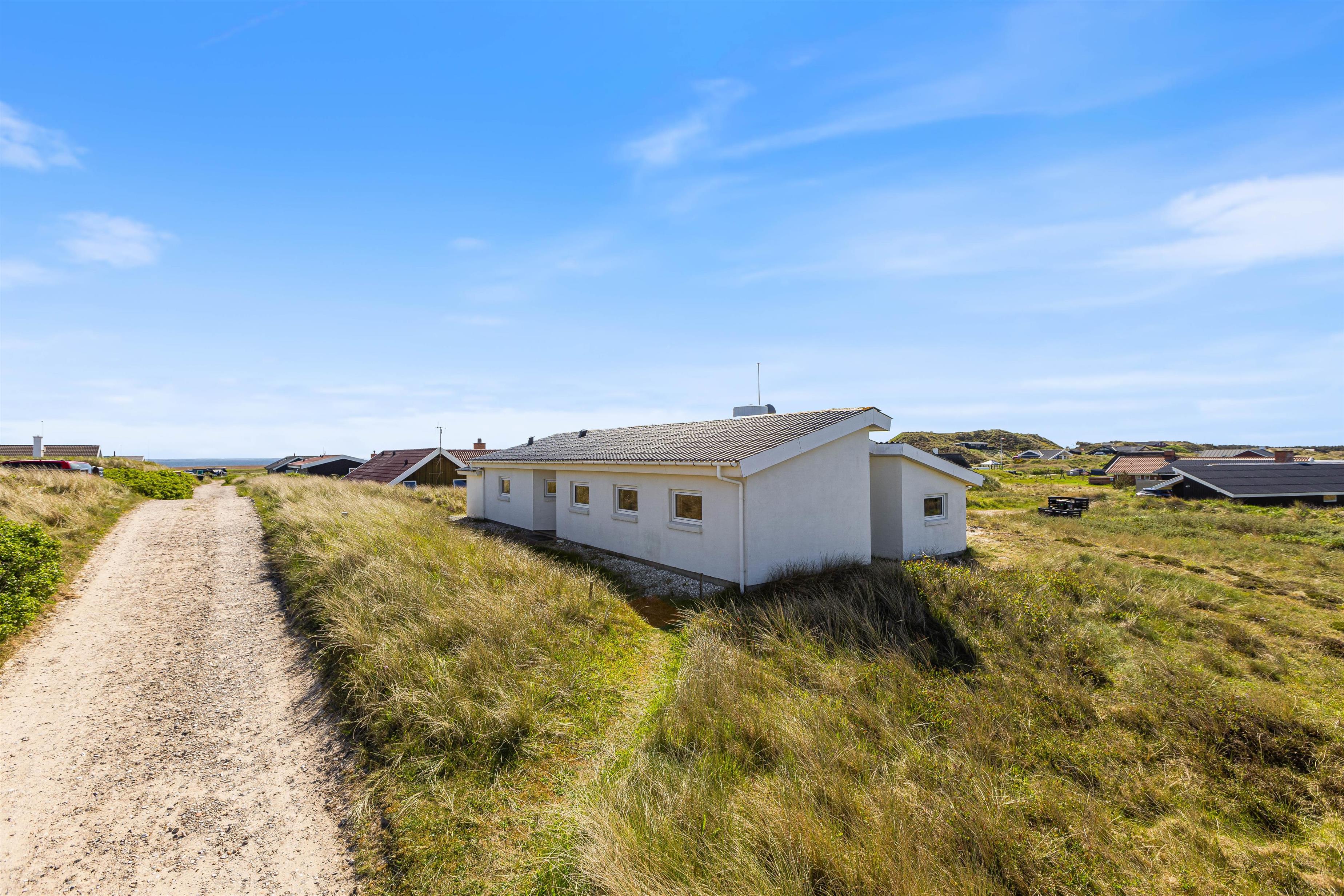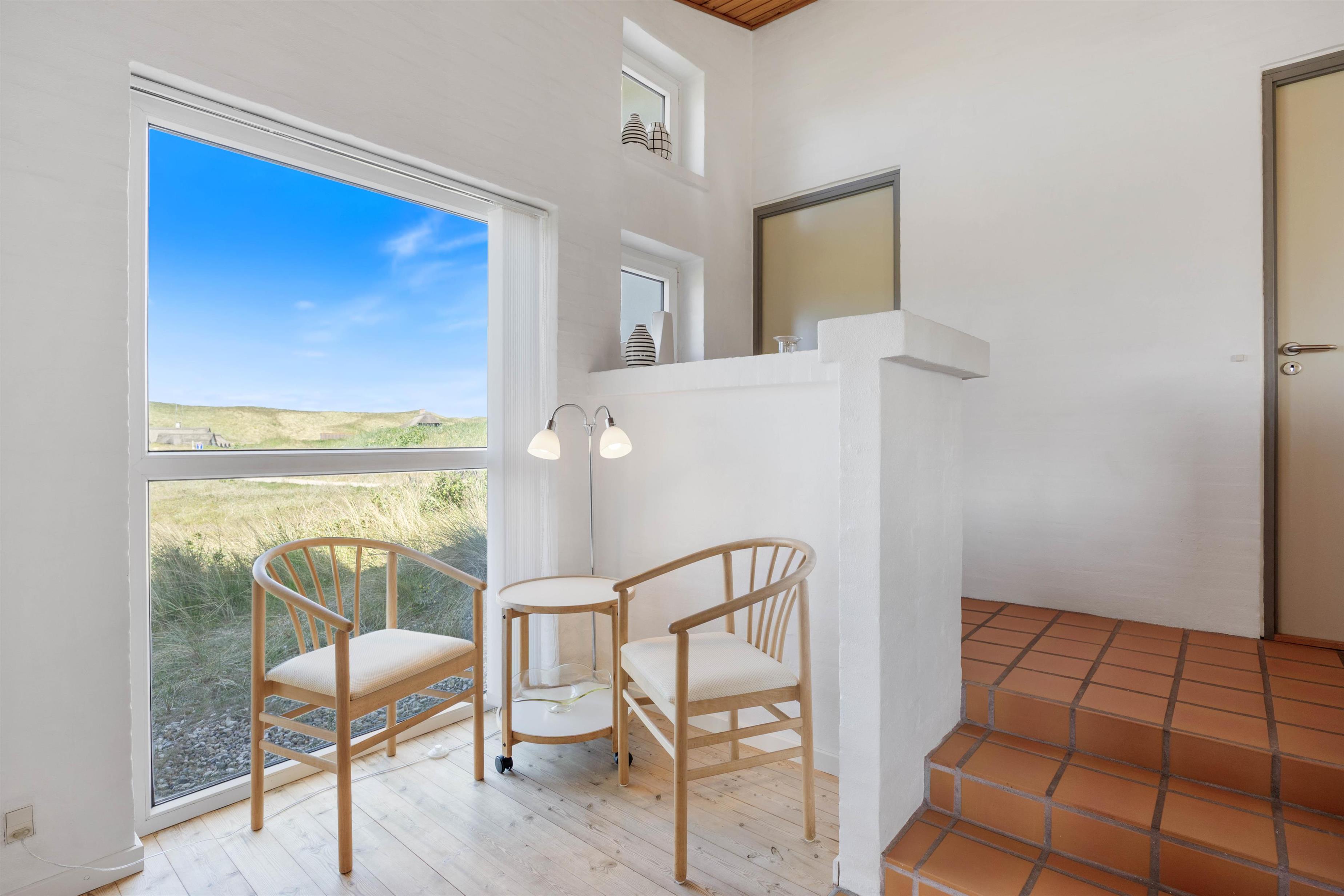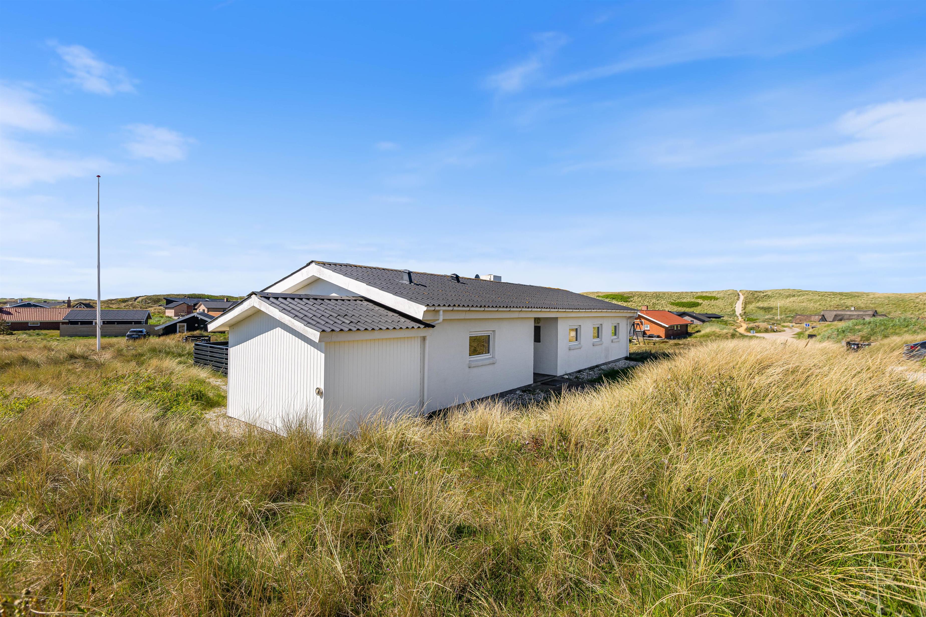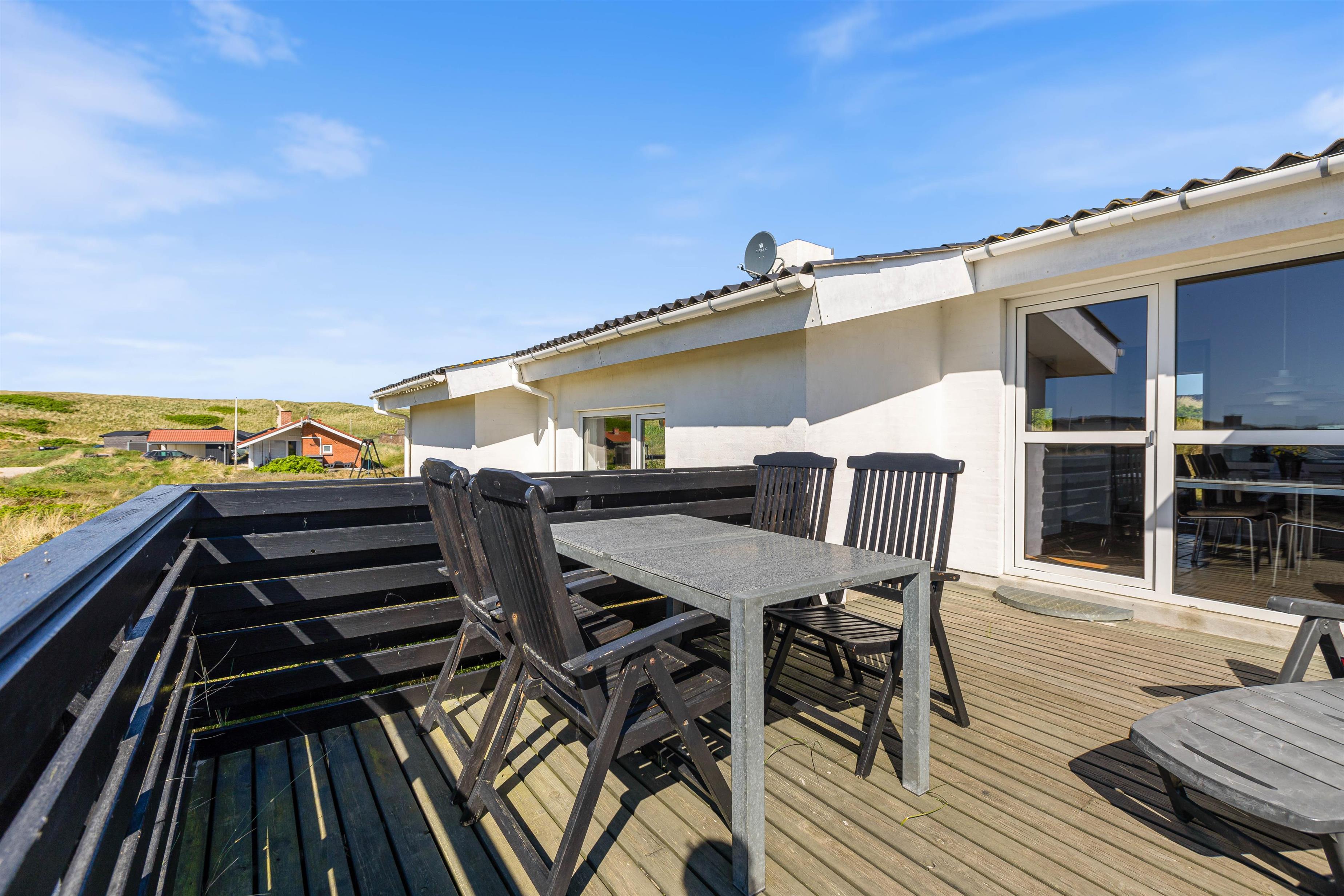 Feriehuset ligger på en skøn naturgrund, så du rigtig kan opleve den vestjyske natur med marehalm og klitter. Og på den gode terrasse kan du slappe af i liggestolen med en god bog, eller nyde morgenkaffen, frokosten eller grillaftenen med udsigten til fjorden i baggrunden.