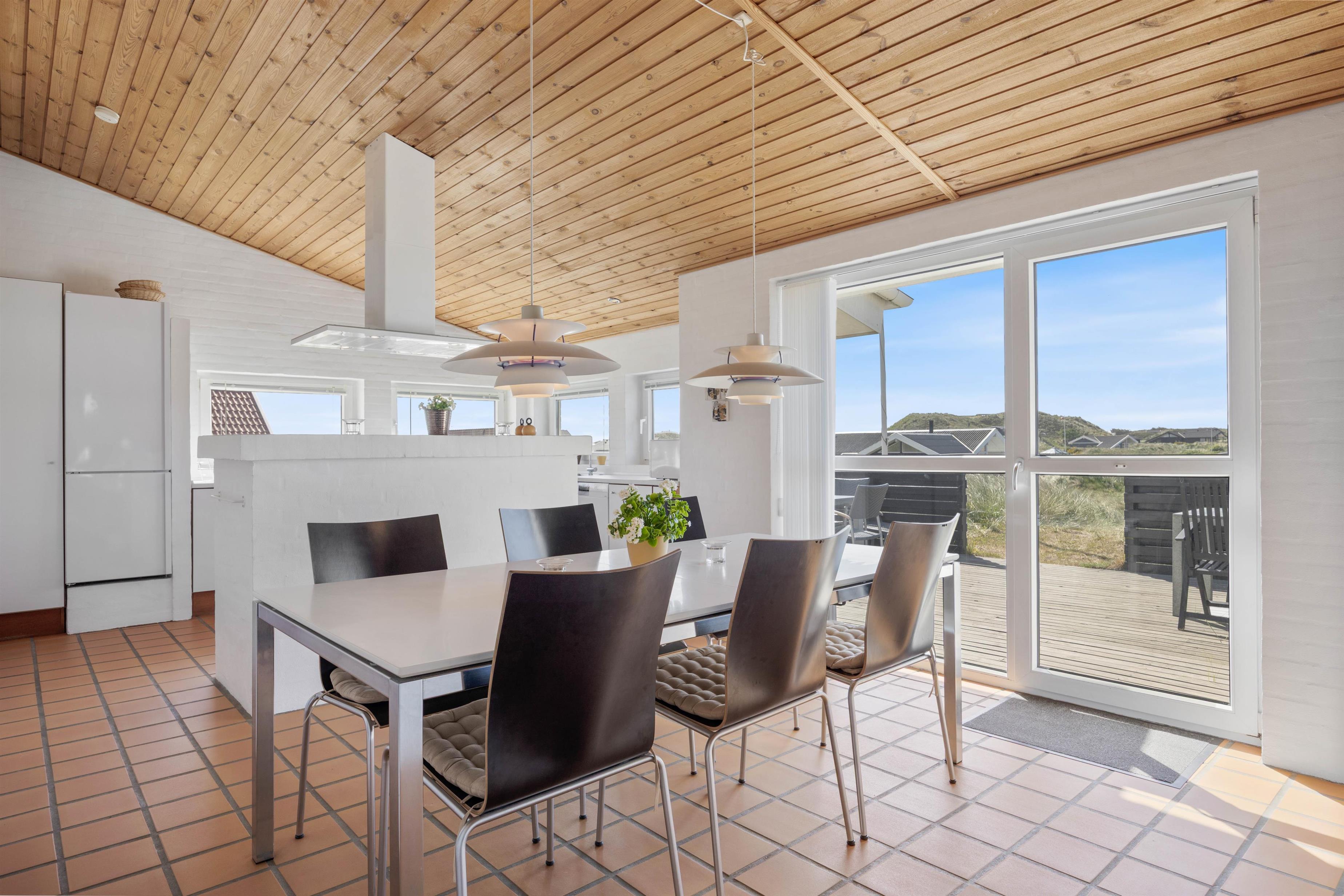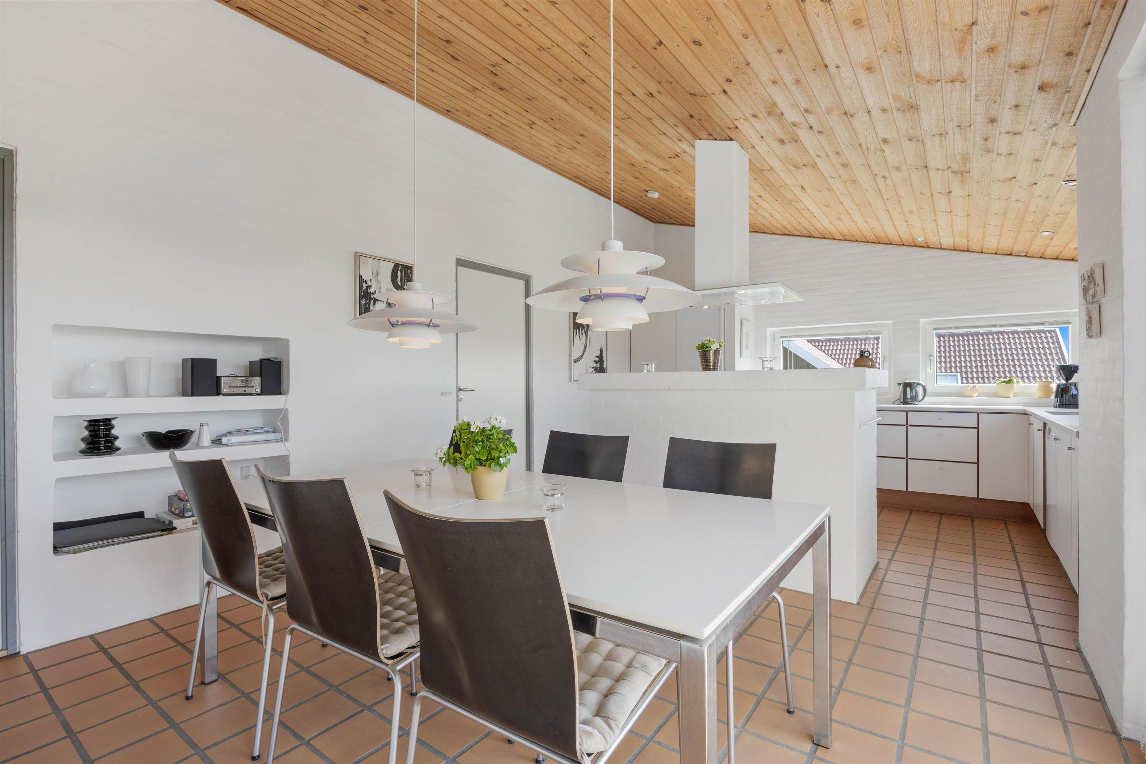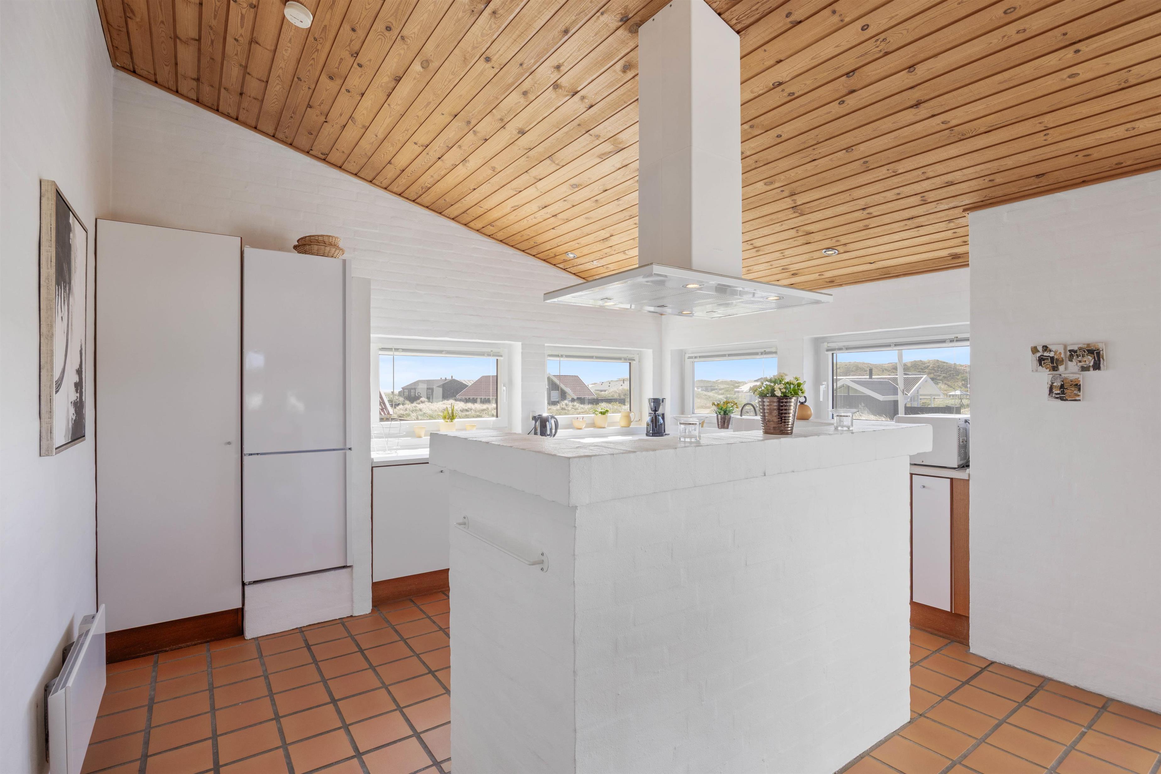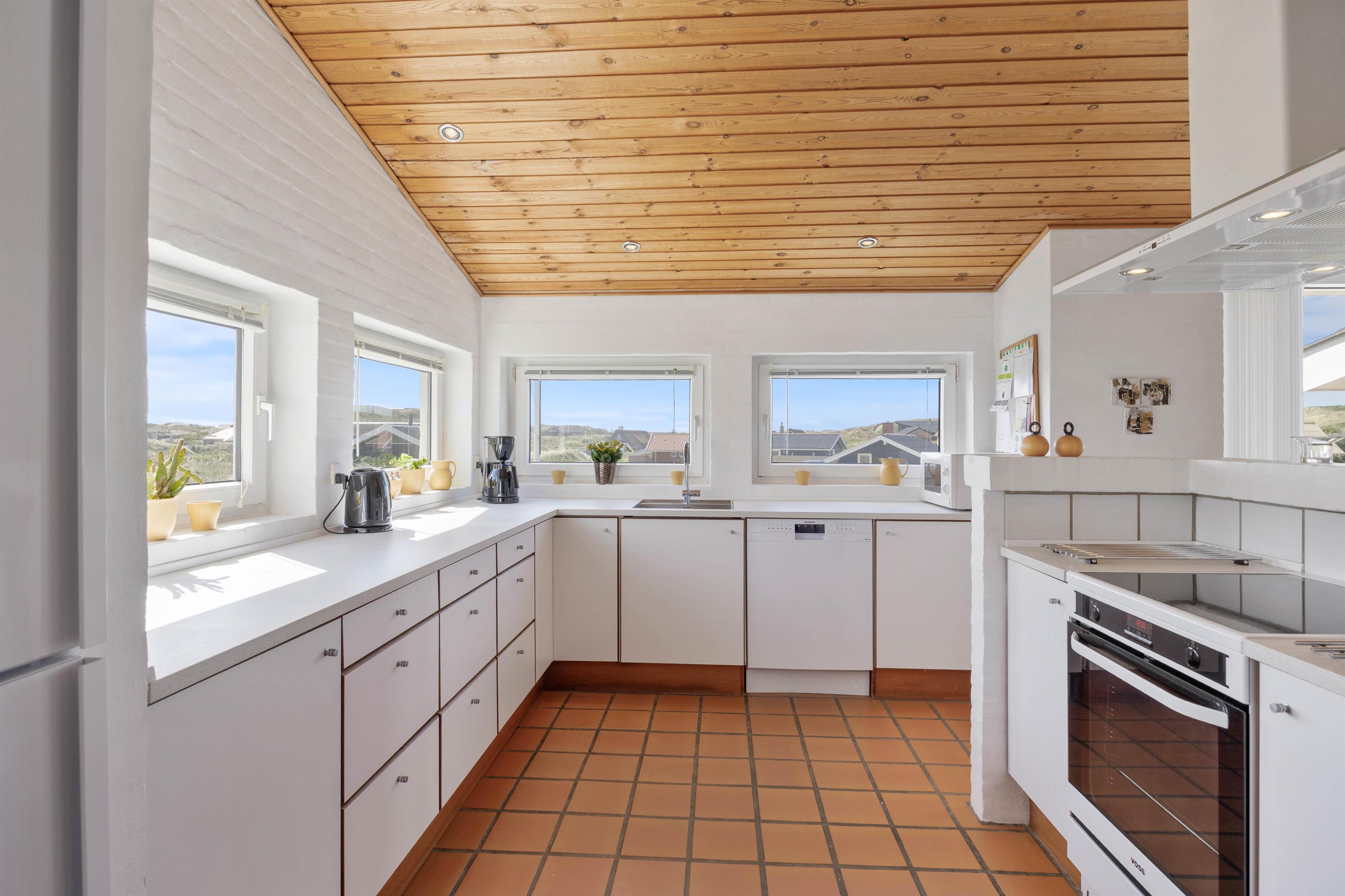 Feriehuset er dejligt og praktisk indrettet, så du kan nyde en rigtig dejlig ferie. I køkkenet har du god skabs- og bordplads, når du laver mad. Og da det er i åben forbindelse med spiseafdelingen, er det dejligt rummeligt og perfekt til hyggelige stunder med familien.