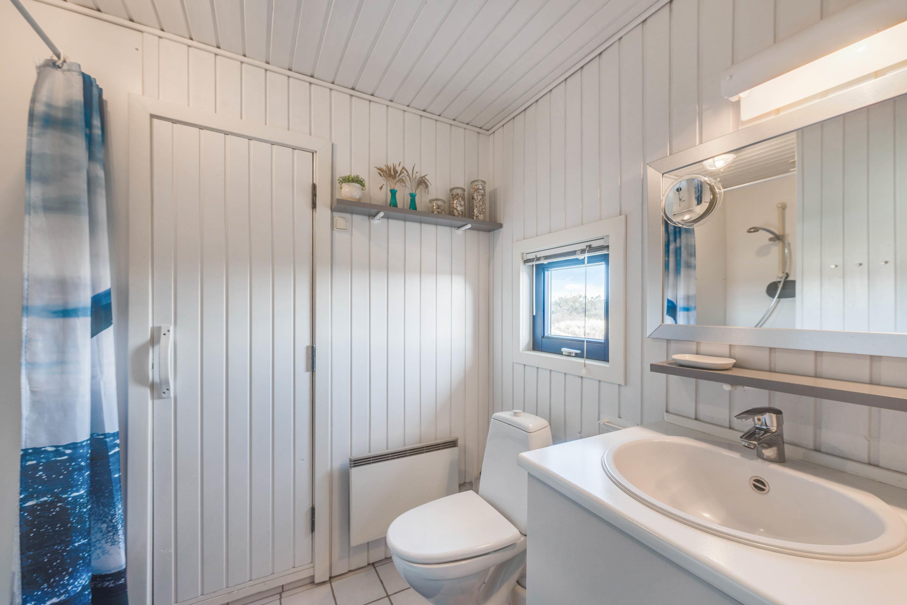 På sommerhusets badeværelse finder I vaskemaskine/tørretumbler, og herfra er der også adgang til sommerhusets sauna – perfekt efter en frisk gåtur langs vandet.