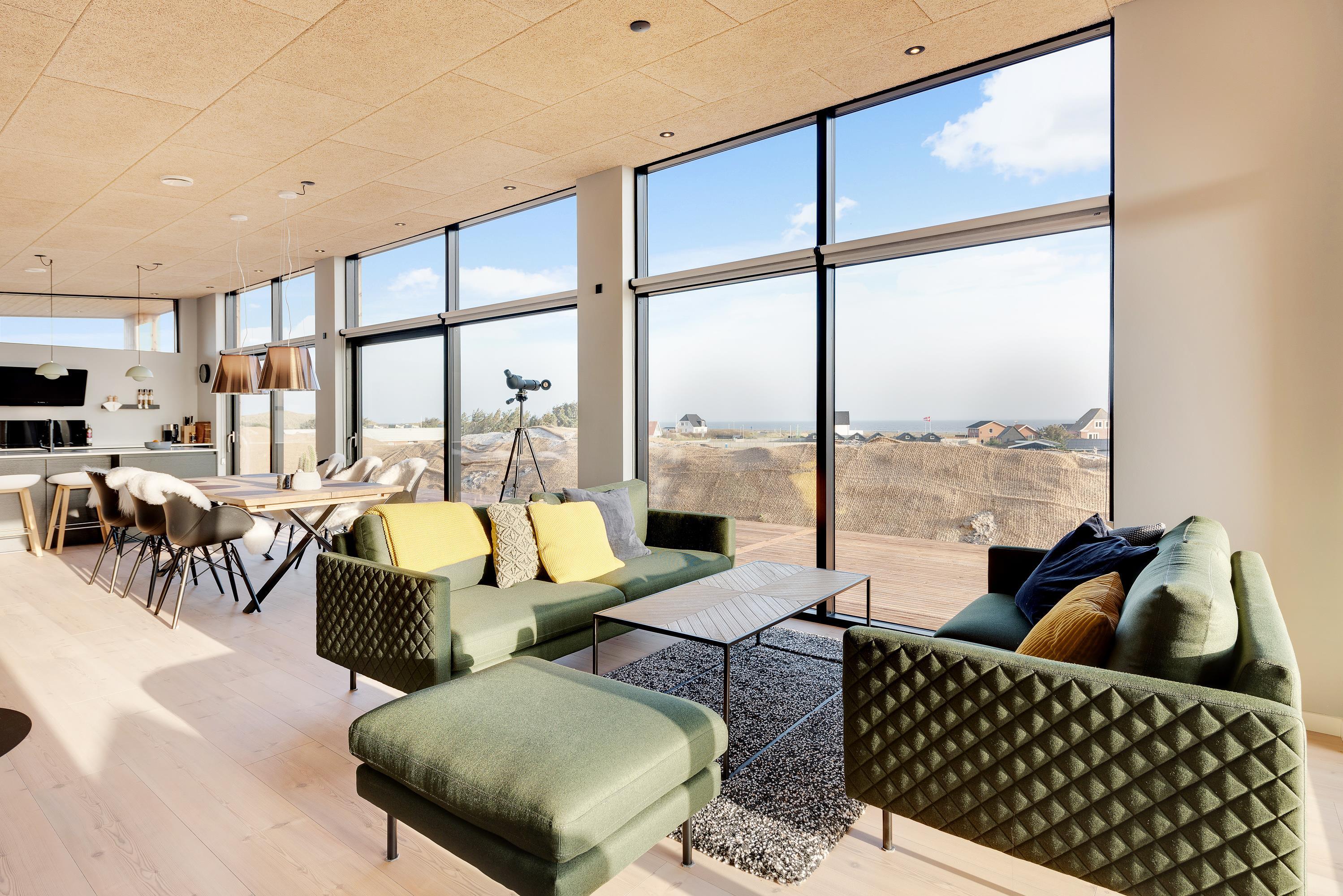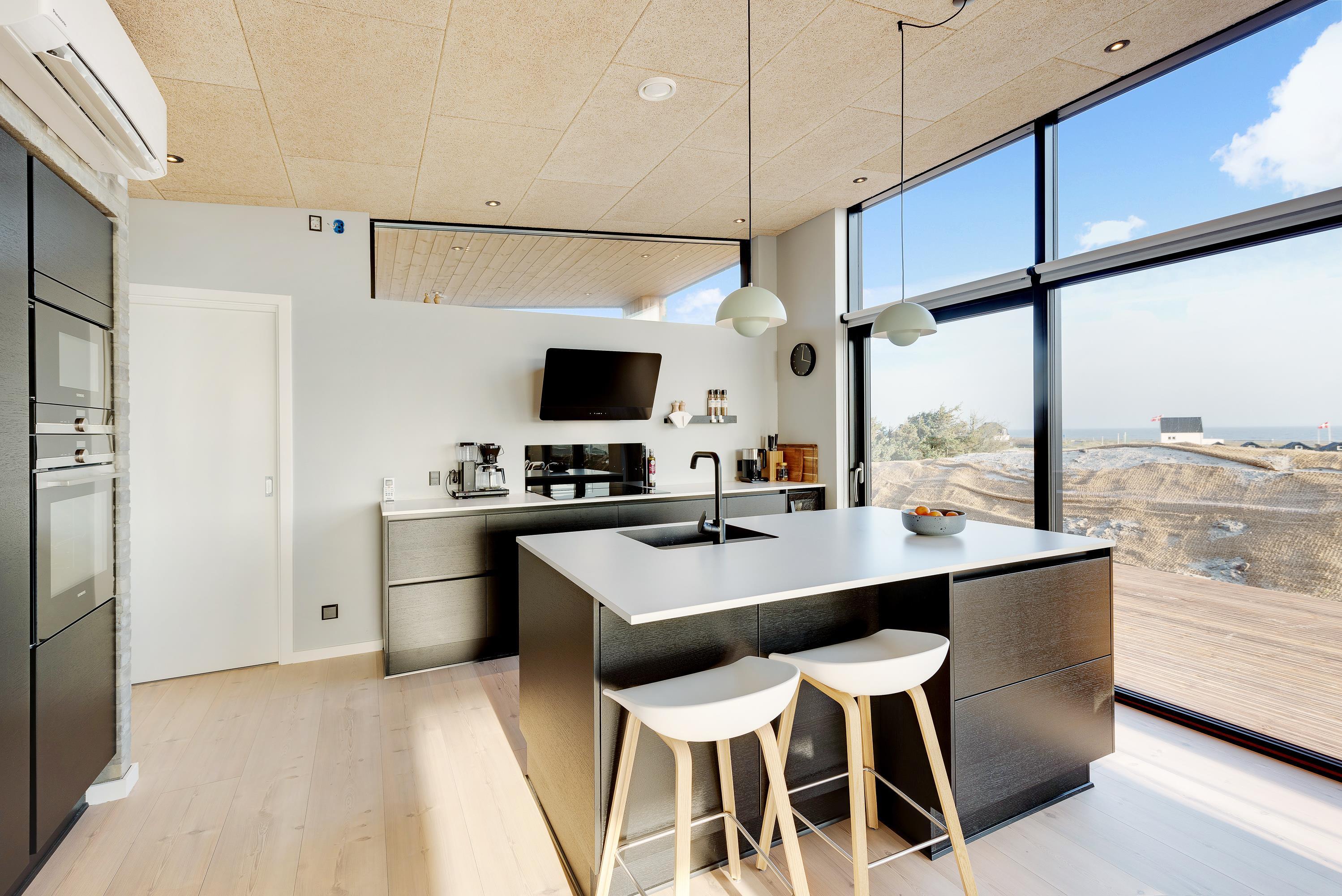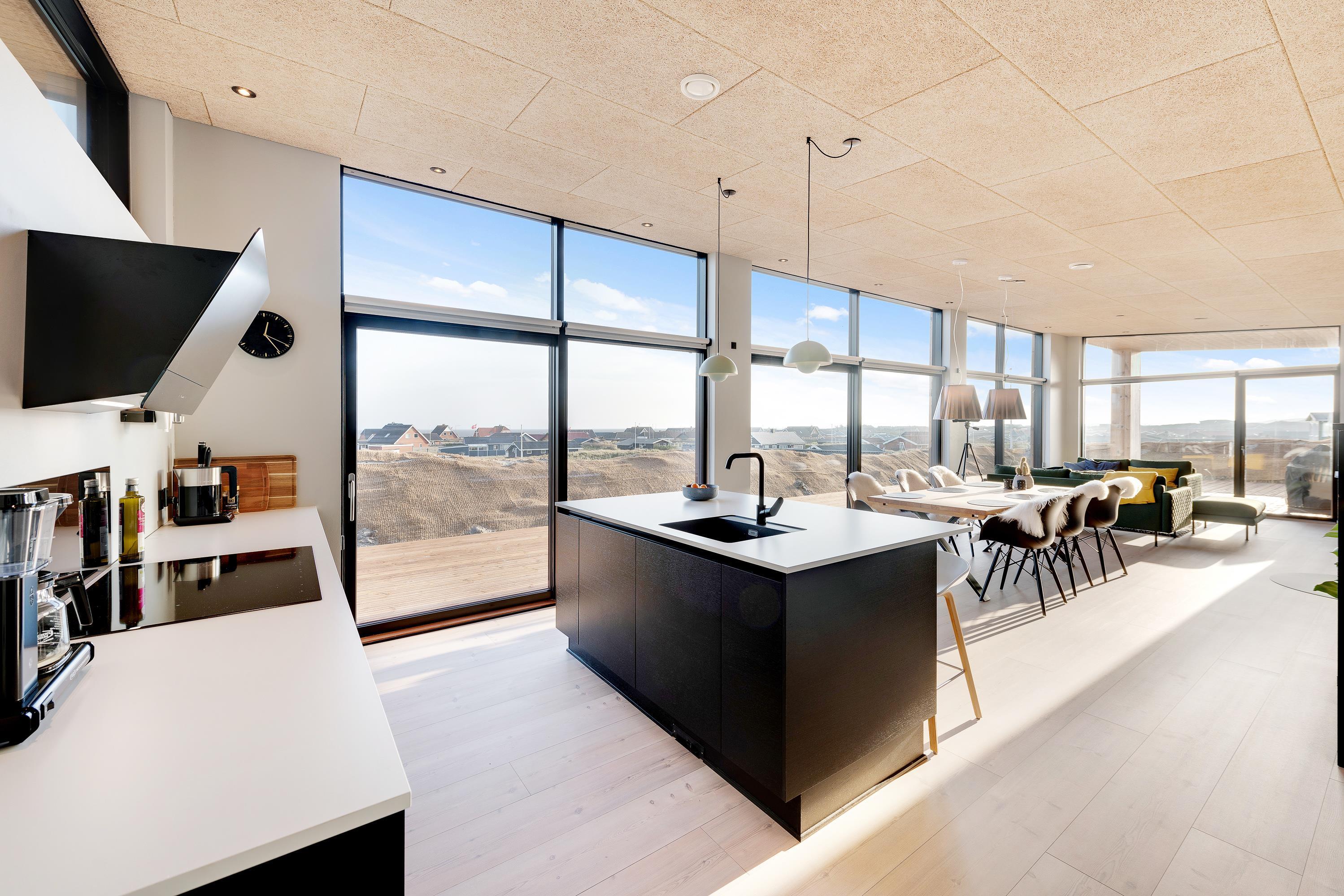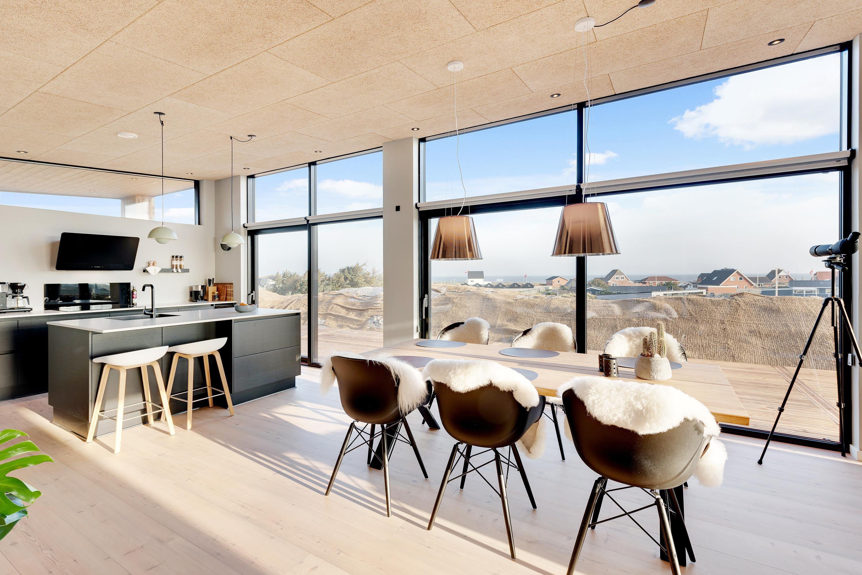 Et praktisk indrettet køkken med bl.a. opvaskemaskine og mikroovn. Spiseafdelingen og den hyggelige stue ligger i umiddelbar forlængelse af det åbne køkken. Mod øst er der store vinduespartier, med en storslået udsigt over feriehusområdet og Ringkøbing Fjord. Her får man solopgangen helt ind i rummet.