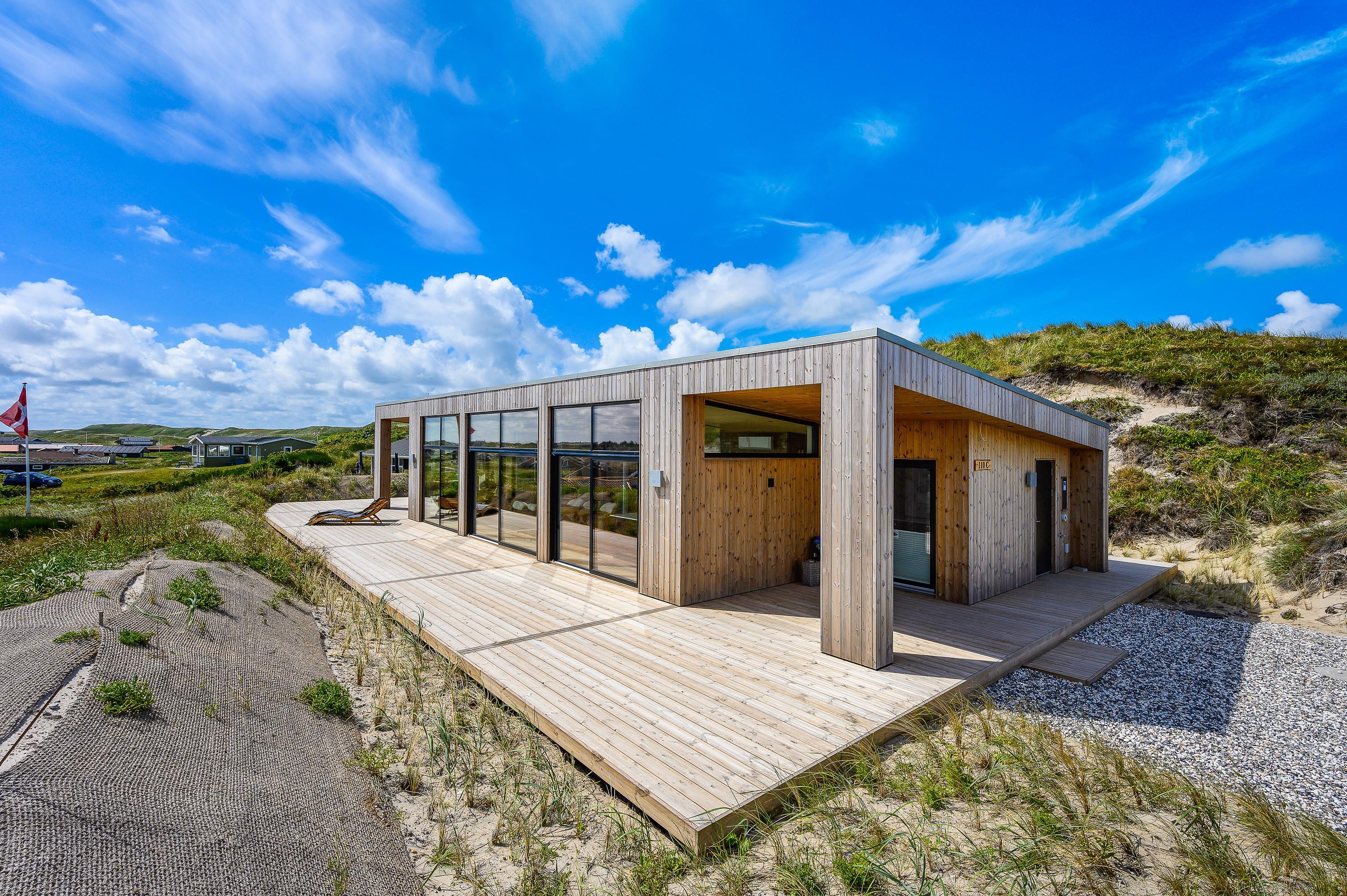 Dette flotte og spændende træferiehus er opført i gode materialer og hyggeligt indrettet, lyst og stilfuldt, i flot skandinavisk stil.