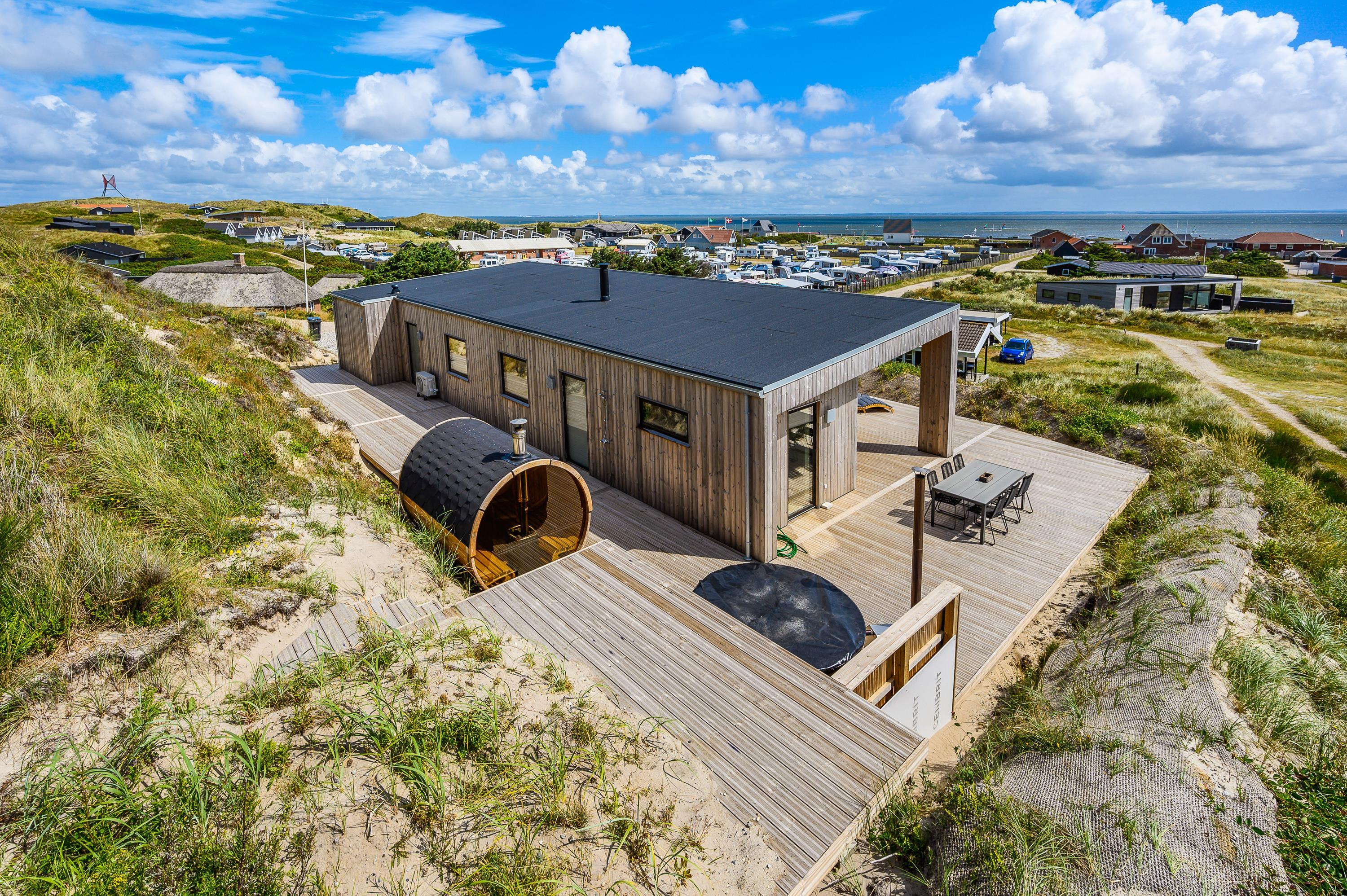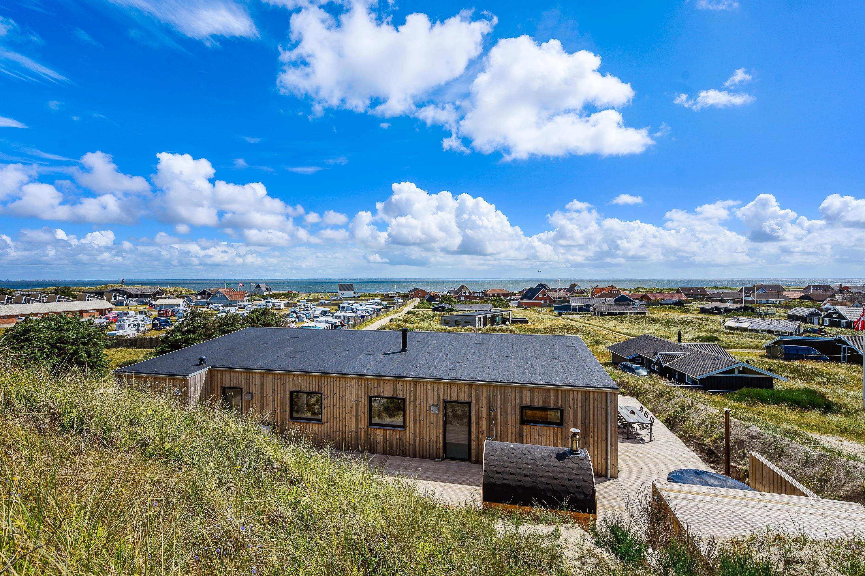 Dette spændende og nybyggede træferiehus (2019) til 6 personer ligger for enden af en stik vej - på Karen Brands Vej 110 C i Årgab – og helt ud til det fantastiske klitlandskab, kun 150 meter fra det altid fascinerende Vesterhav og få hundrede meter fra Ringkøbing Fjord. Tæt på surf skolen.