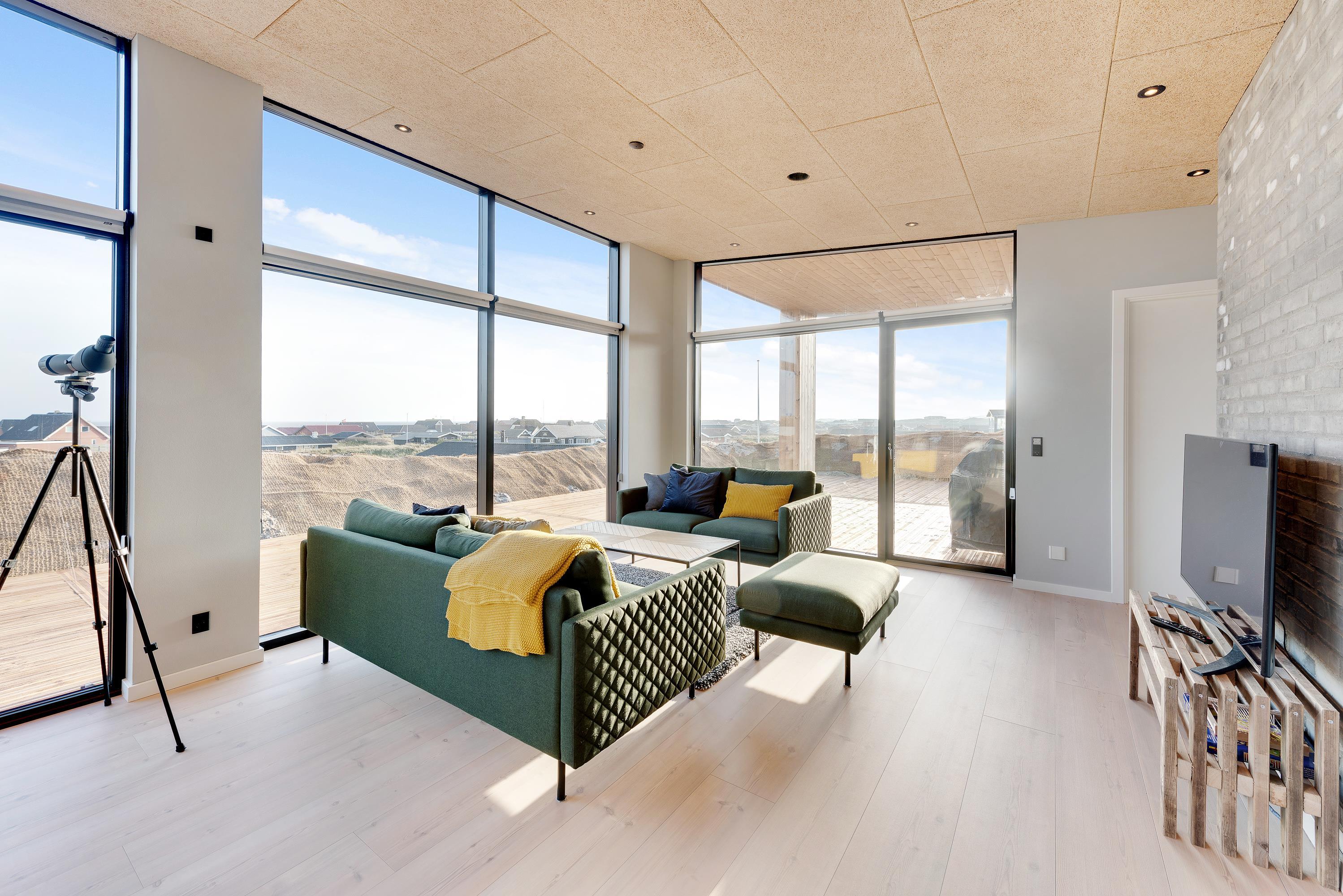 På de lidt køligere dage – eller efter en lang tur i klitterne, kan man nyde en god bog og en kop kaffe i sofahjørnet, foran den knitrende ild i brændeovnen, mens man nyder naturen indefra.