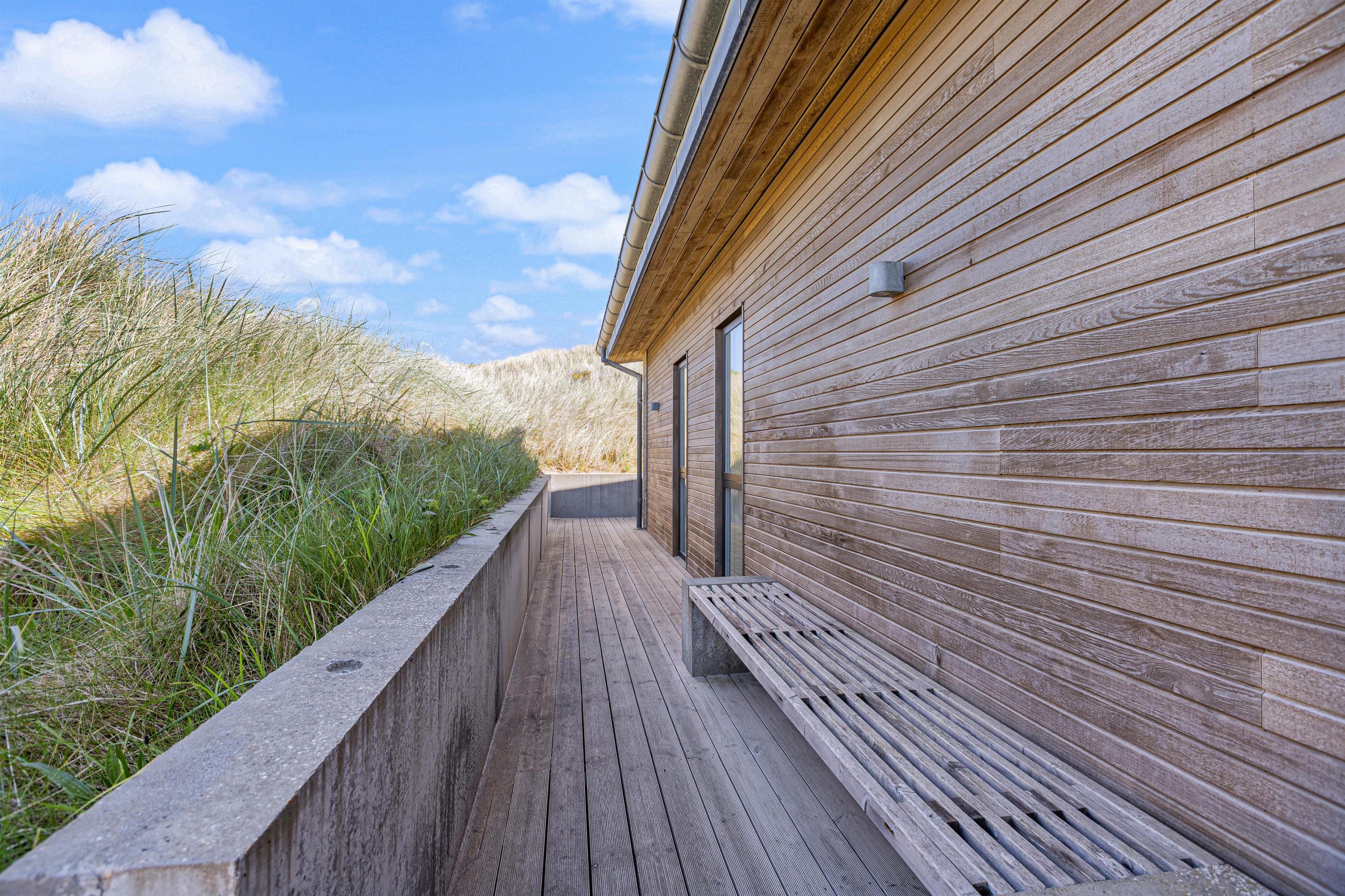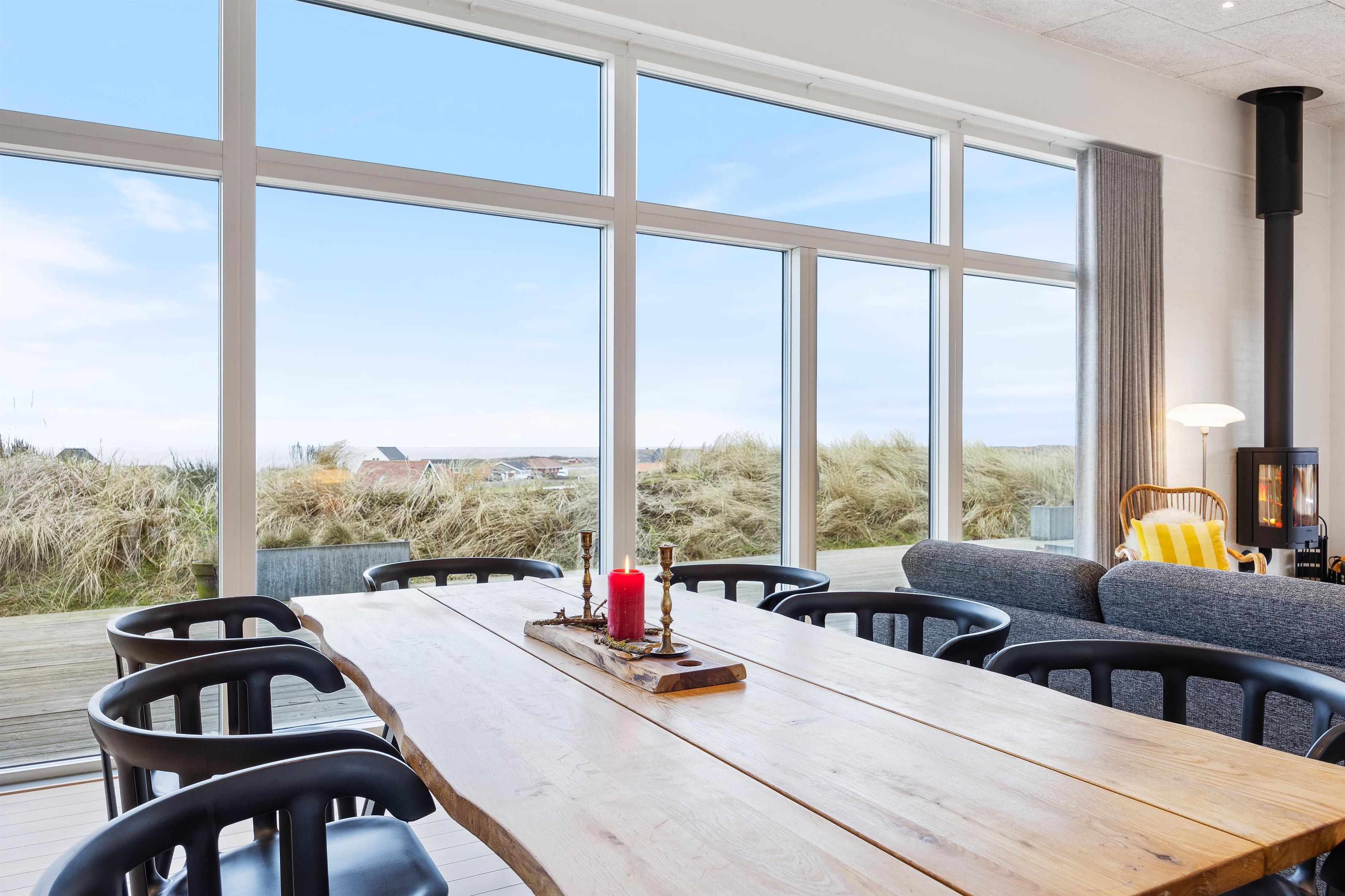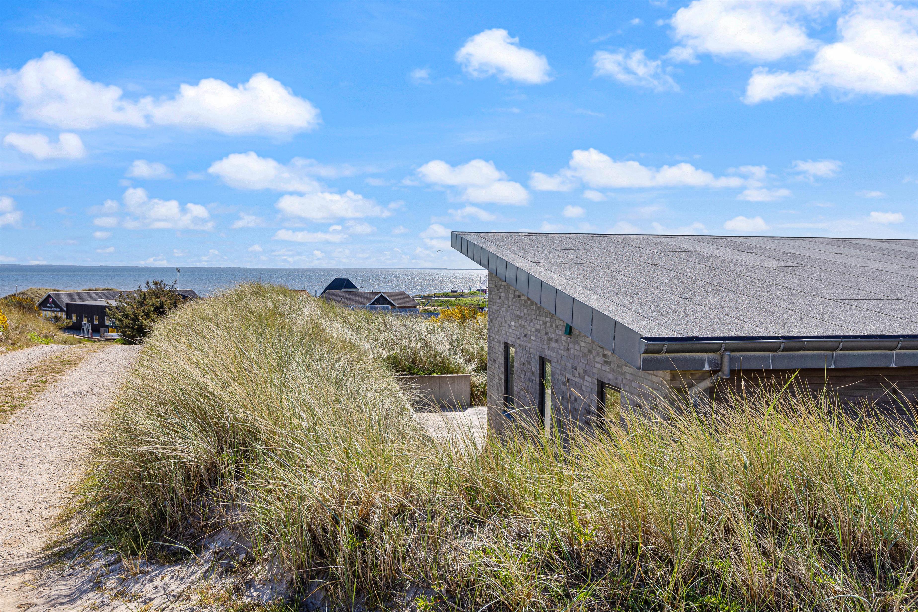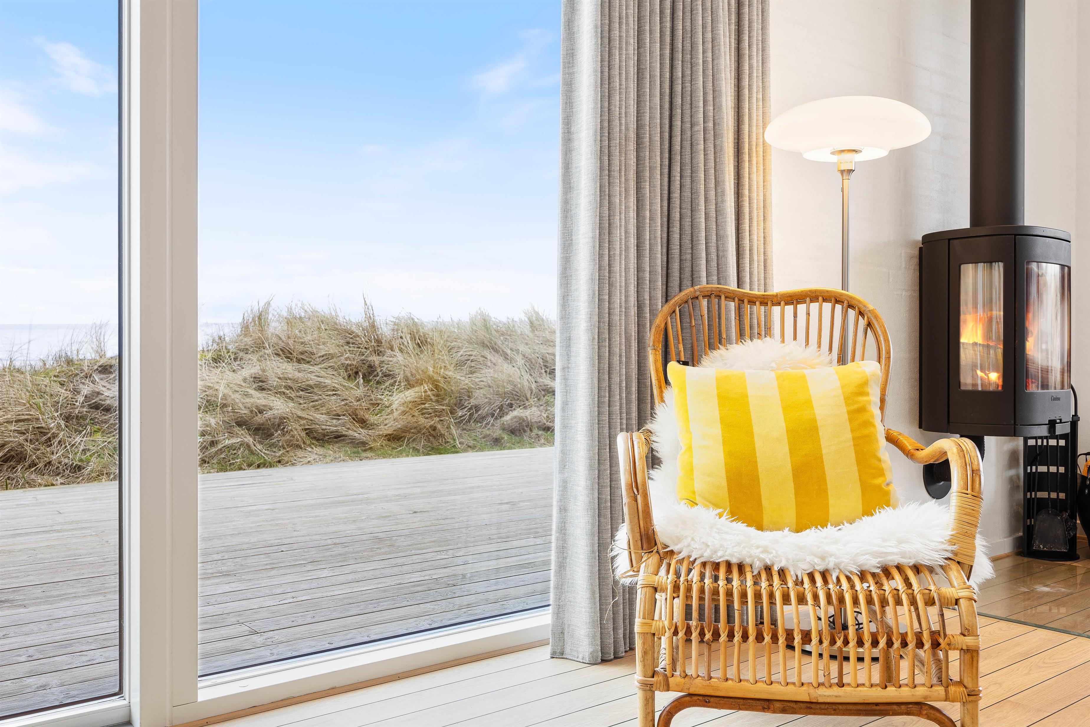 Flot, spændende og luksuriøst feriehus, opført 2019 i sten og træ, beliggende midt i en klit på Karen Brands Vej 60 i Årgab – og med en fantastisk panoramaudsigt udover over en del af sommerhusområdet og Ringkøbing Fjord.