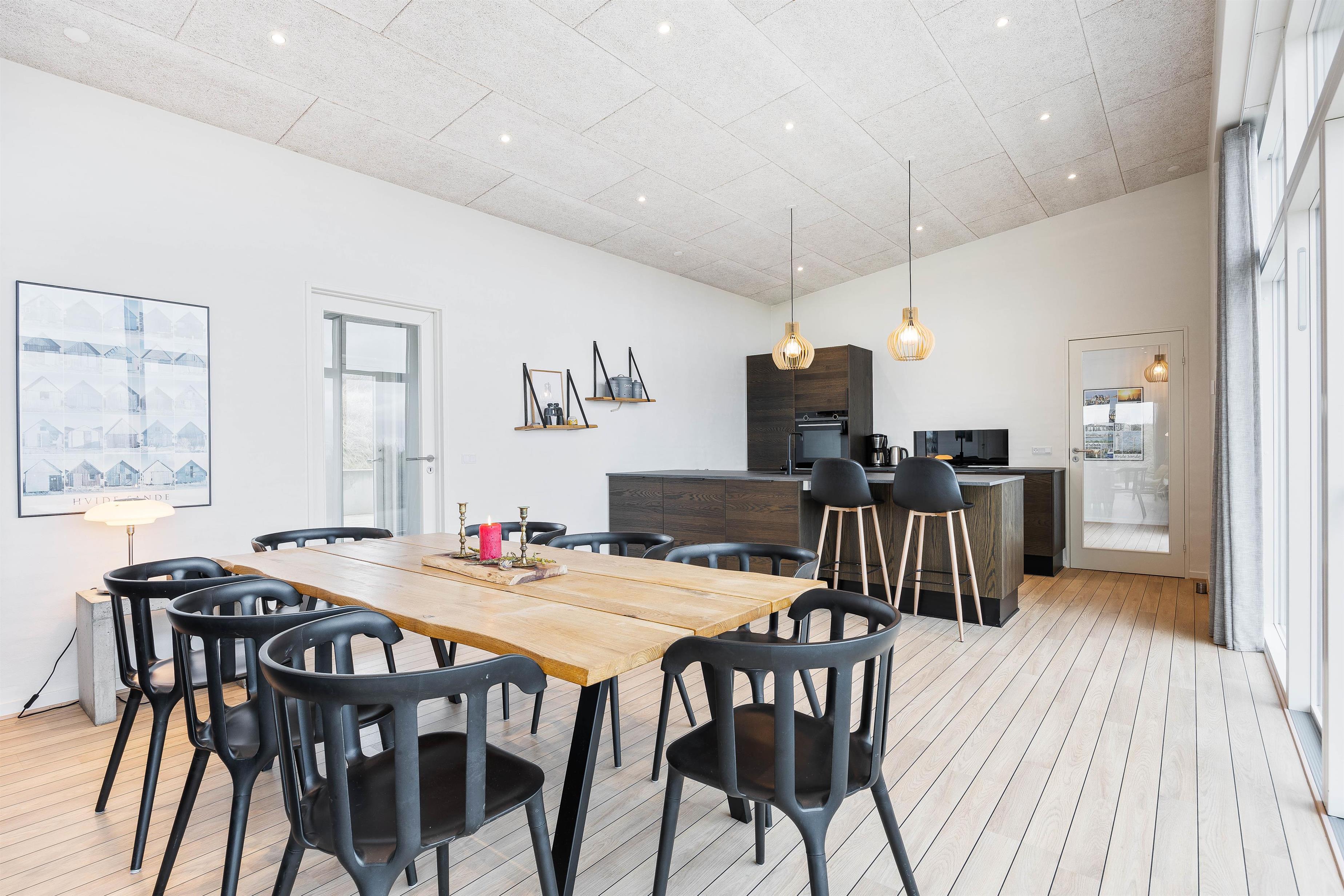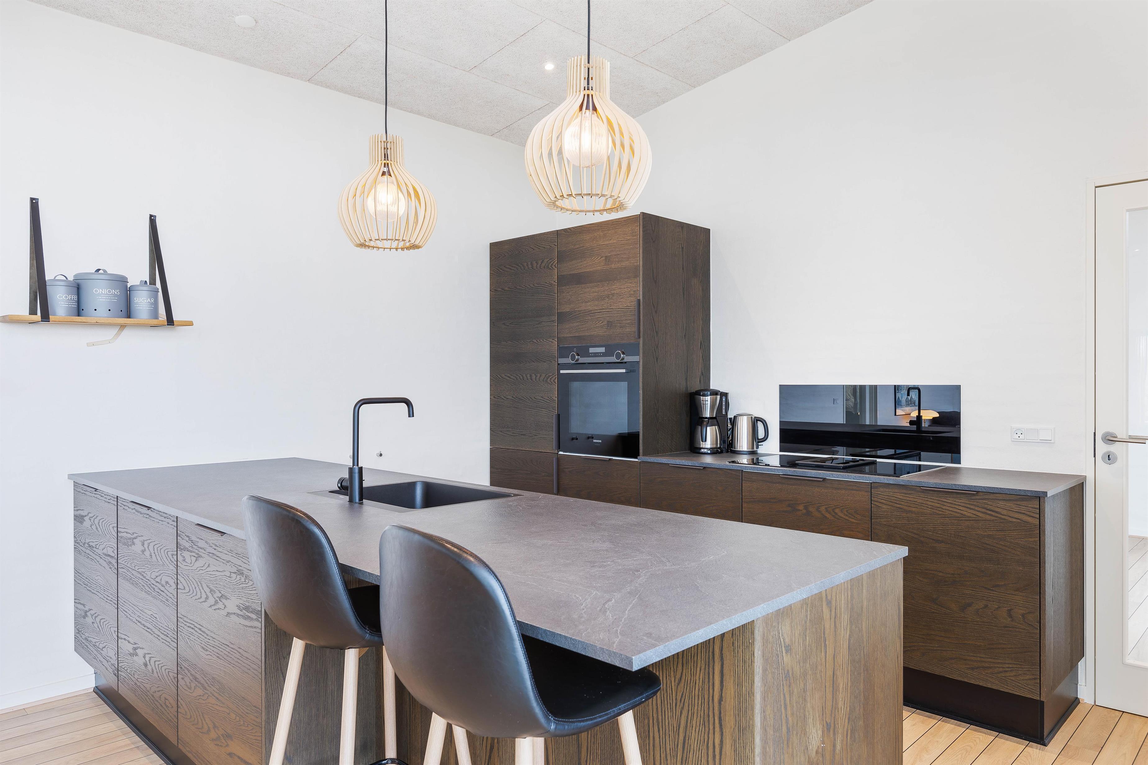 Køkkenet er flot og praktisk indrettet med bl.a. stor fryser (80l), opvaskemaskine og mikroovn. Spiseafdelingen ligger i umiddelbar forlængelse af det åbne køkken. Herfra er der også åbent indtil den hyggelige stue med de store vinduespartier, der ”tager den storslåede natur med ind i stuen”.