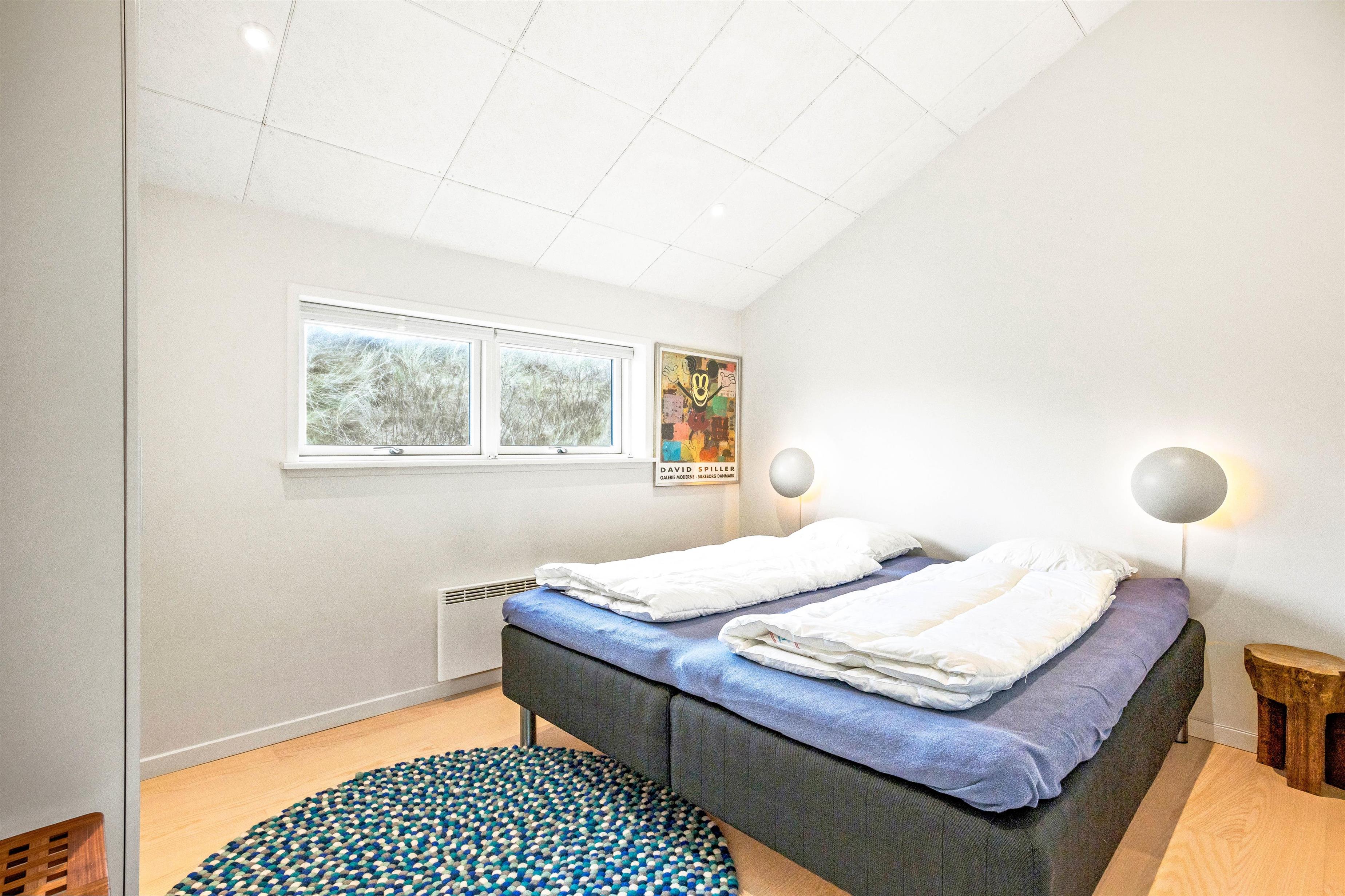 Sommerhuset har 3 store og lyse soverum med trægulv. Et af de store soverum har direkte adgang til et af sommerhusets 2 badeværelser. Efter en lang gåtur i frostvejret, kan I blive genopvarmet i et af sommerhusets 2 badeværelser med gulvvarme. Derudover er der også en varmepumpe.