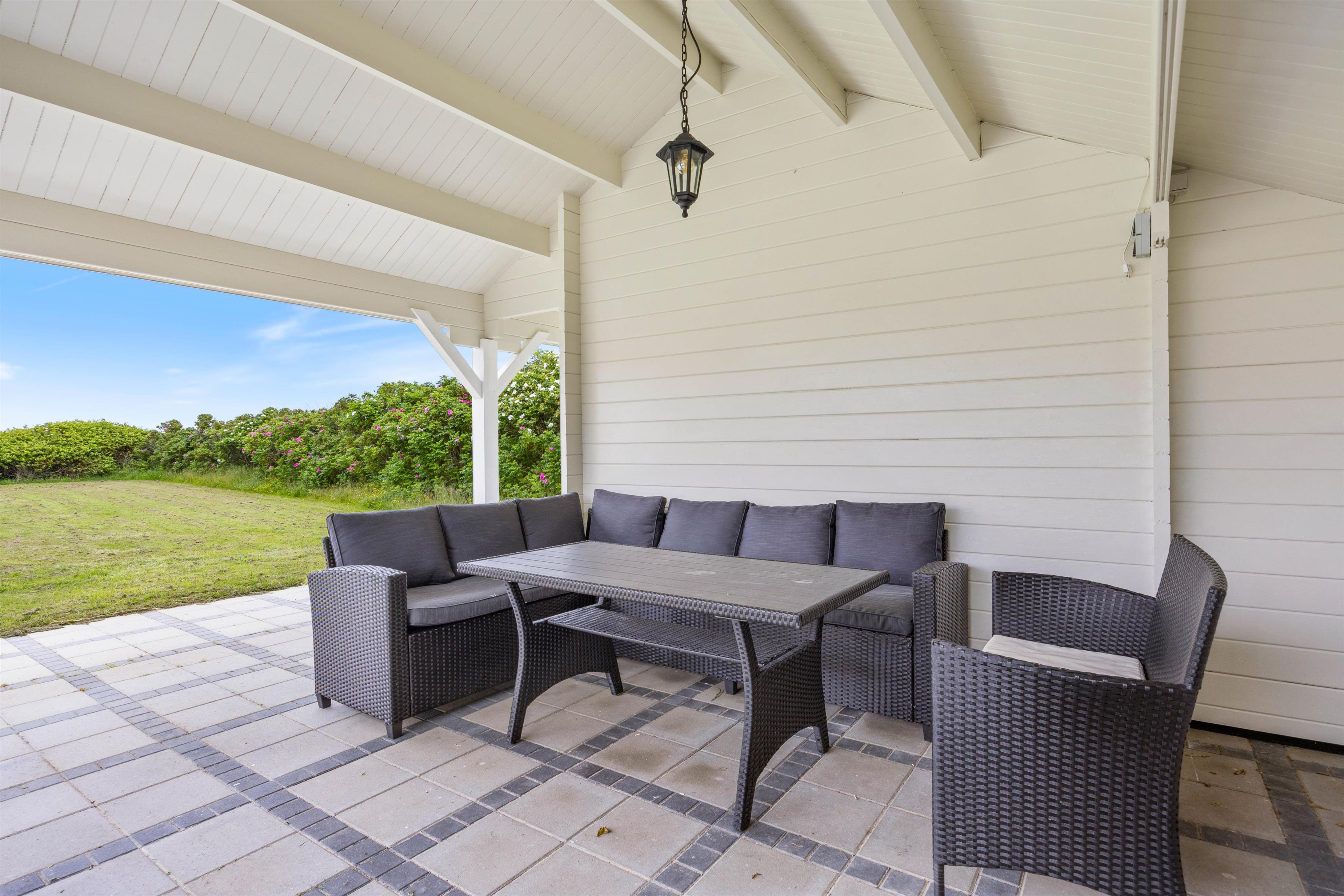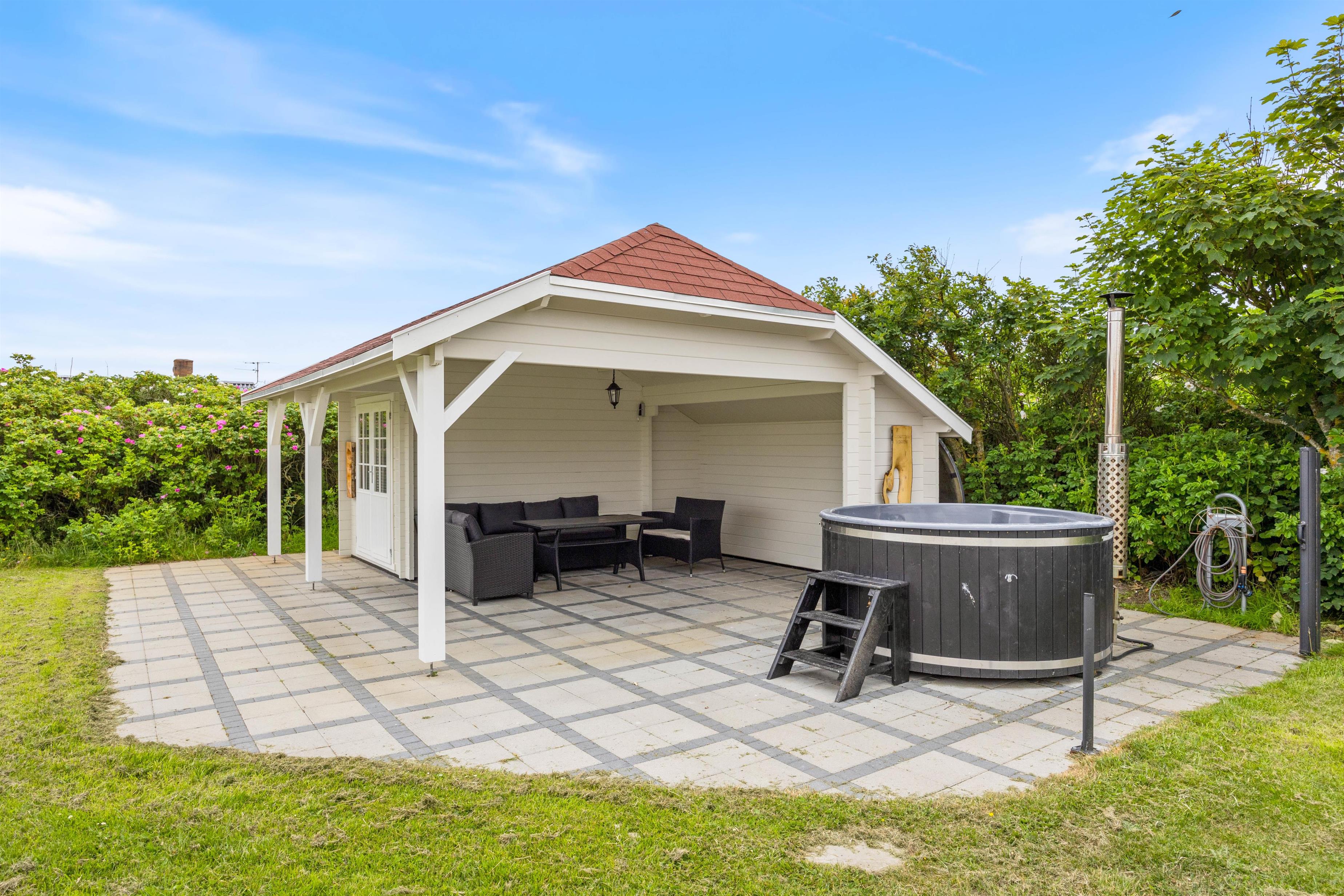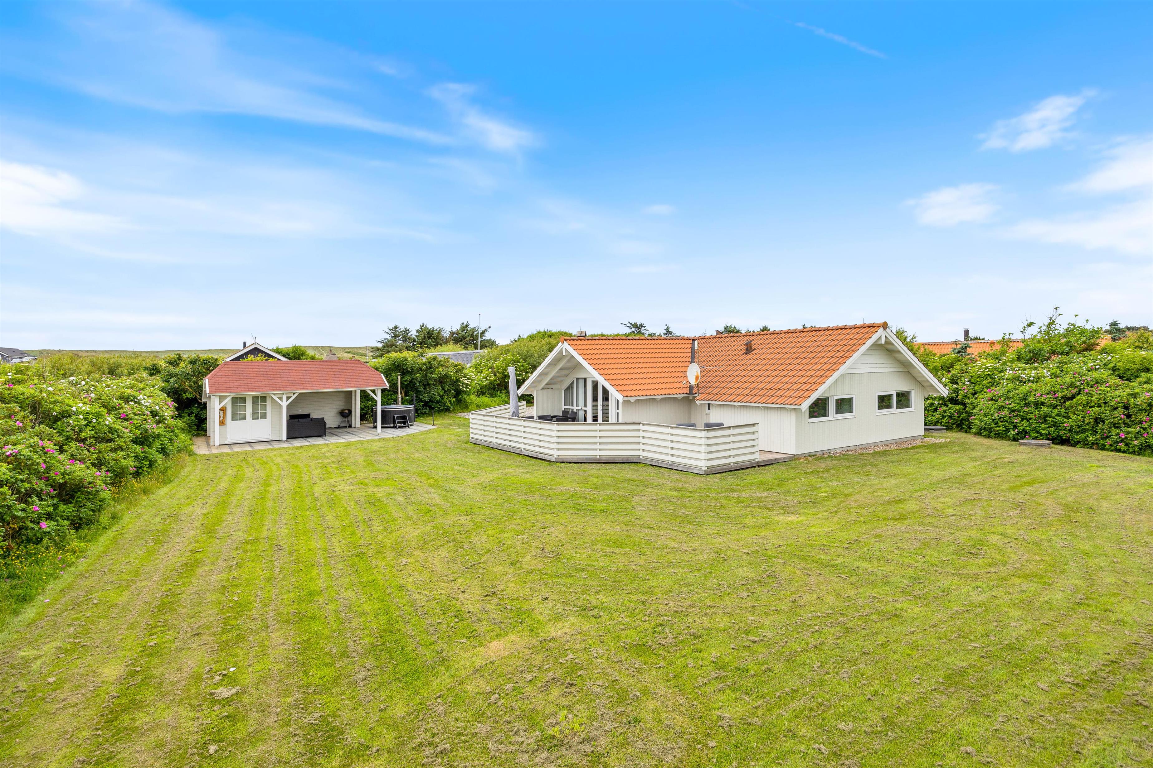 Feriehuset ligger på en stor plænegrund, hvor der er plads til at børnene kan lege, imens I nyder solen på den afskærmede terrasse. Annekset er placeret i hjørnet på den smukke plæne. Her indbyder den flisebelagte og overdækkede terrasse til mange hyggelige timer, hop i den varme vildmarksbad efter dagens strandtur, ren fornøjelse for store og små. Til aften kan I spise et lækkert grillmåltid i den friske havluft, og med udsigt til den smukke solnedgang. Det kan også anbefales at se solnedgangen fra første parket i klitterne. Havet ligger blot 300 meter fra feriehuset.