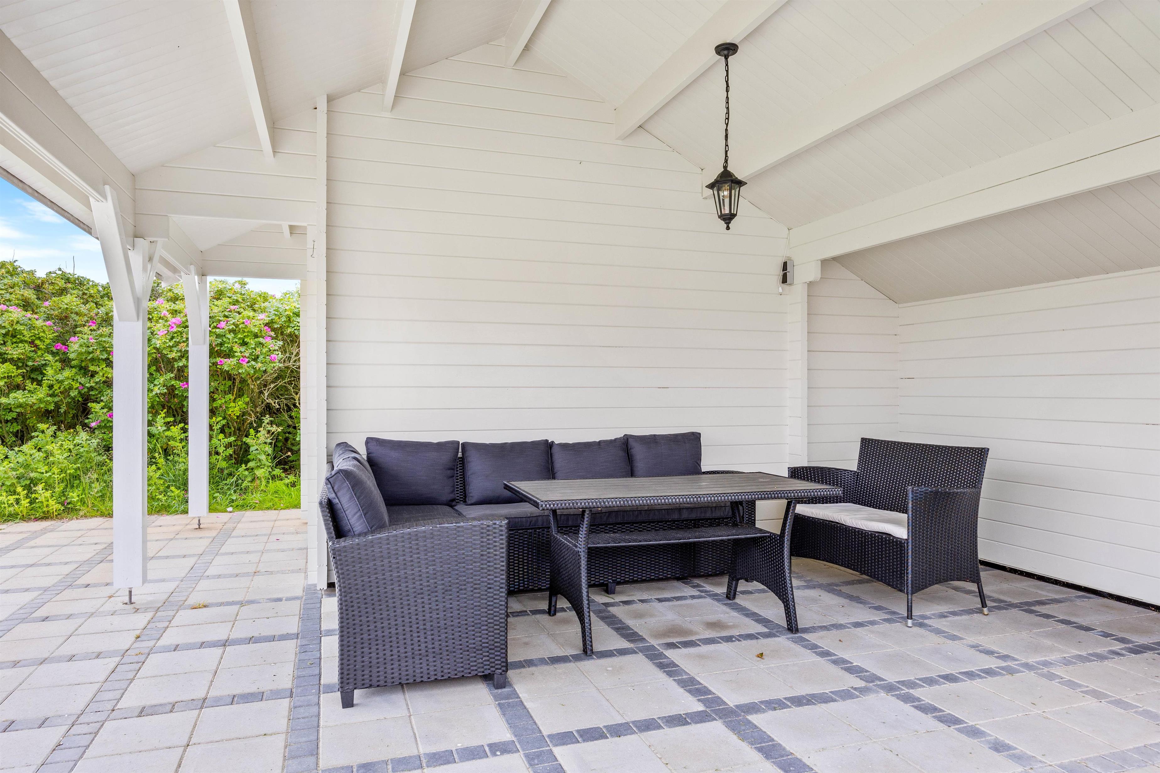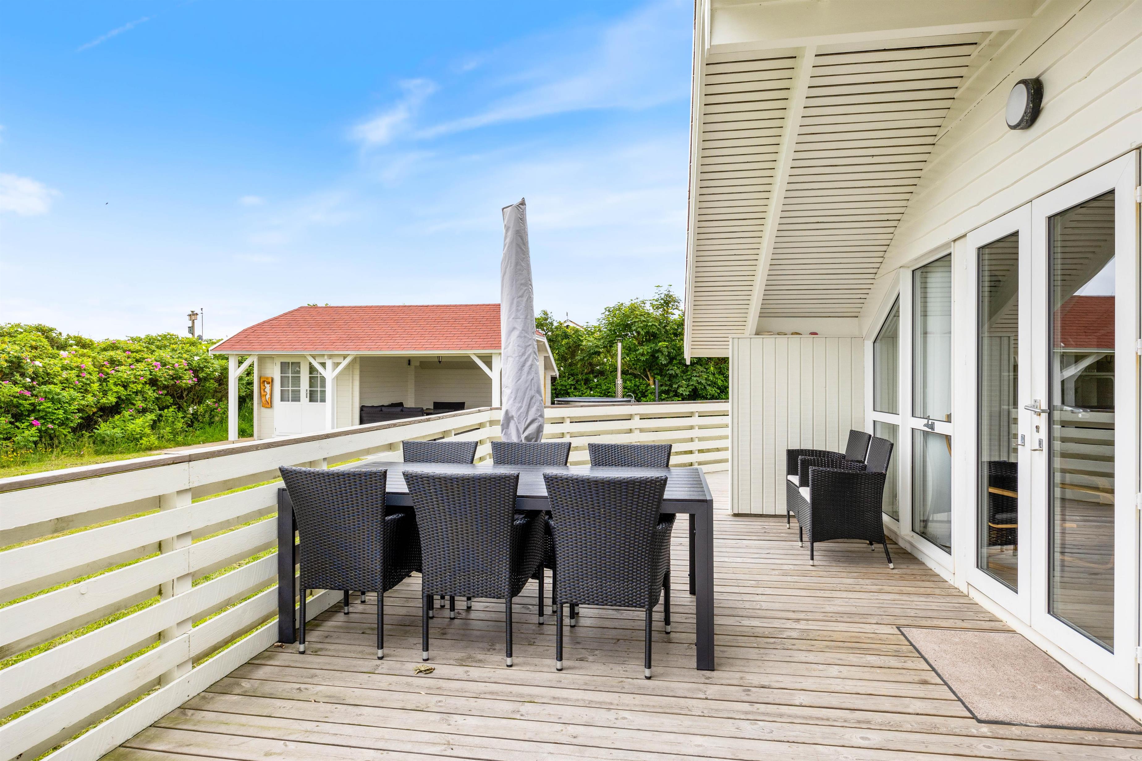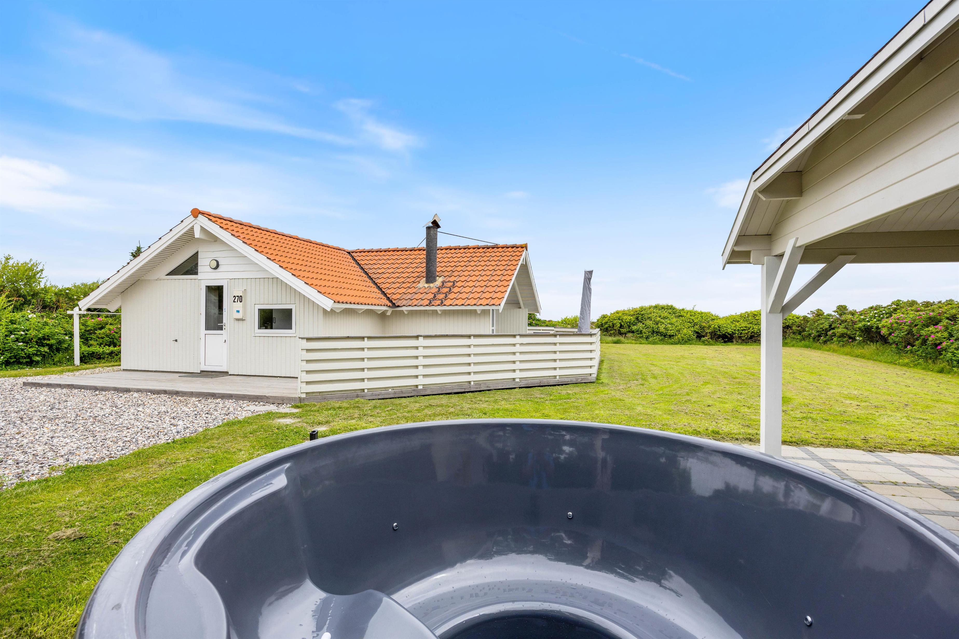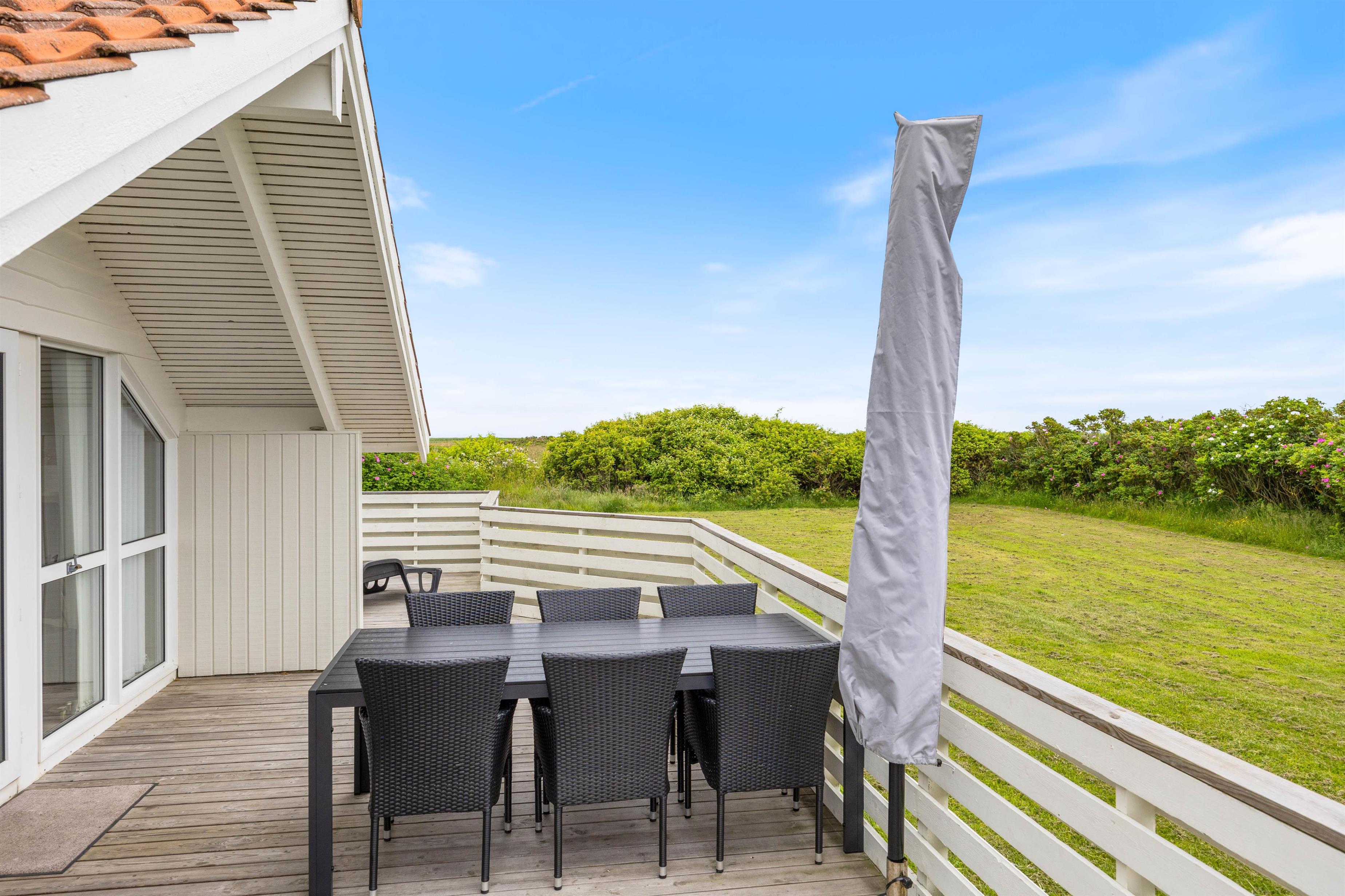 Feriehuset ligger på en stor plænegrund, hvor der er plads til at børnene kan lege, imens I nyder solen på den afskærmede terrasse. Annekset er placeret i hjørnet på den smukke plæne. Her indbyder den flisebelagte og overdækkede terrasse til mange hyggelige timer, hop i den varme vildmarksbad efter dagens strandtur, ren fornøjelse for store og små. Til aften kan I spise et lækkert grillmåltid i den friske havluft, og med udsigt til den smukke solnedgang. Det kan også anbefales at se solnedgangen fra første parket i klitterne. Havet ligger blot 300 meter fra feriehuset.