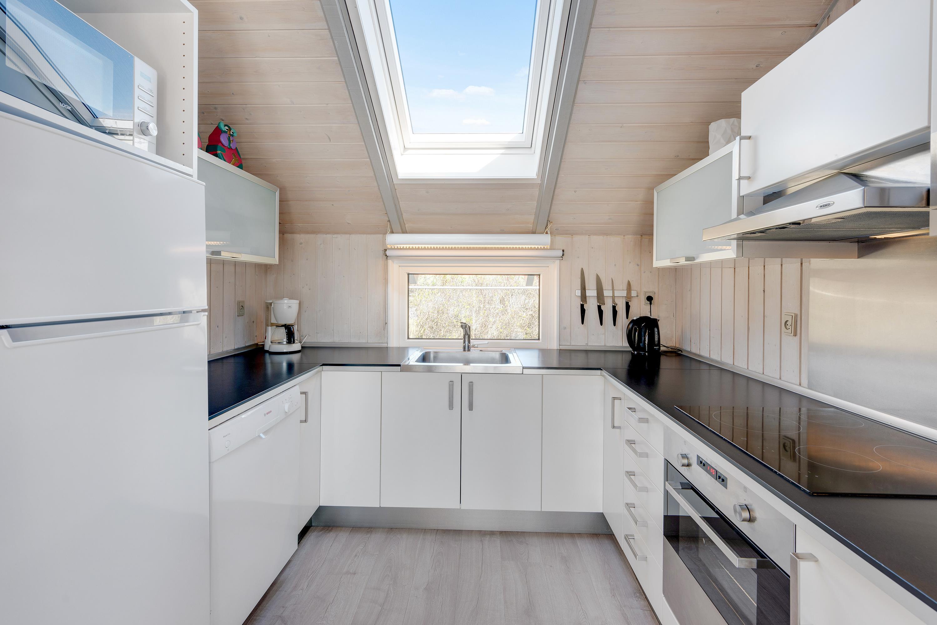 Husets køkken er lyst og moderne, her finder I både opvaskemaskine, mikroovn samt køleskab med lille fryseboks.