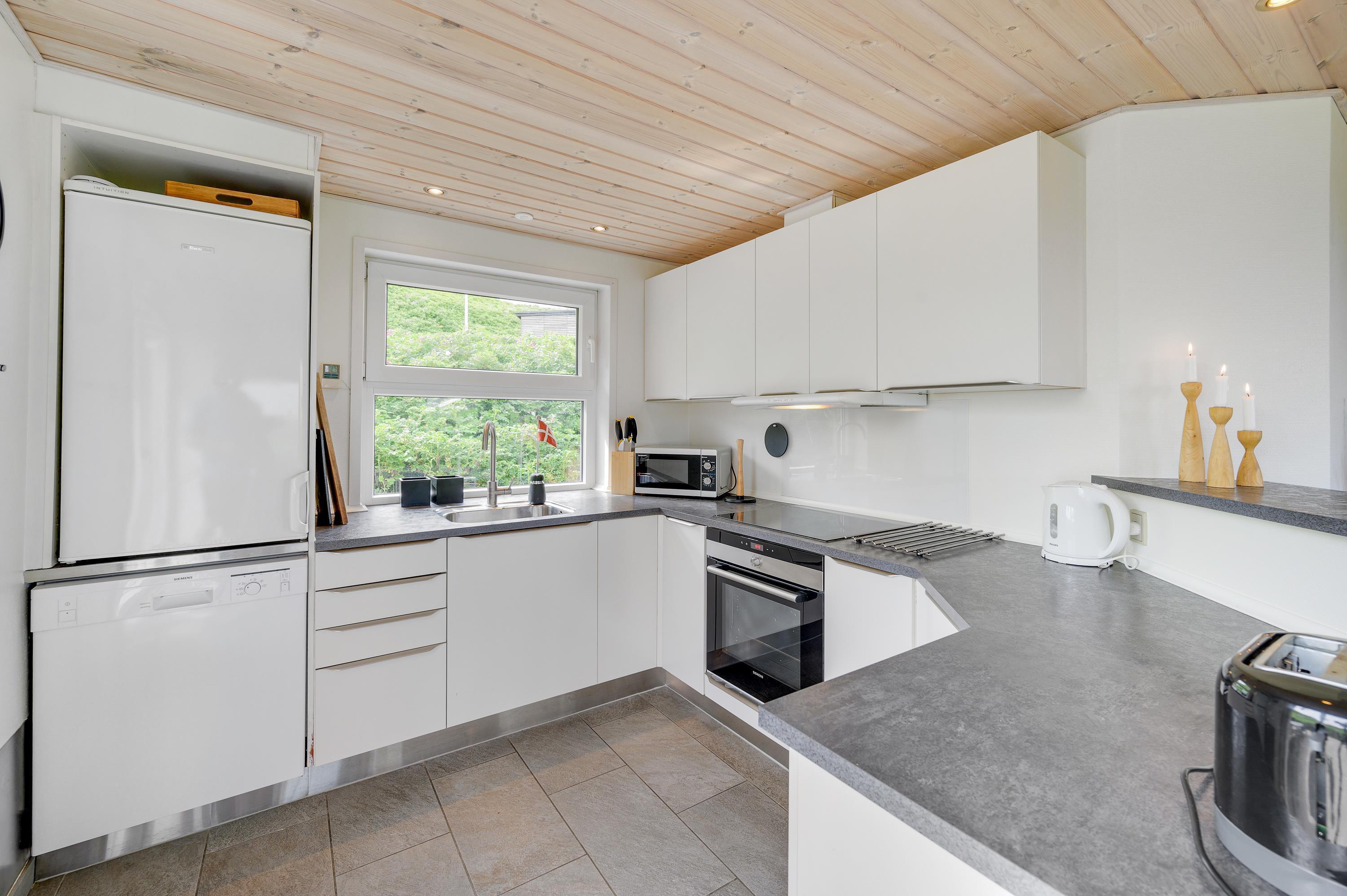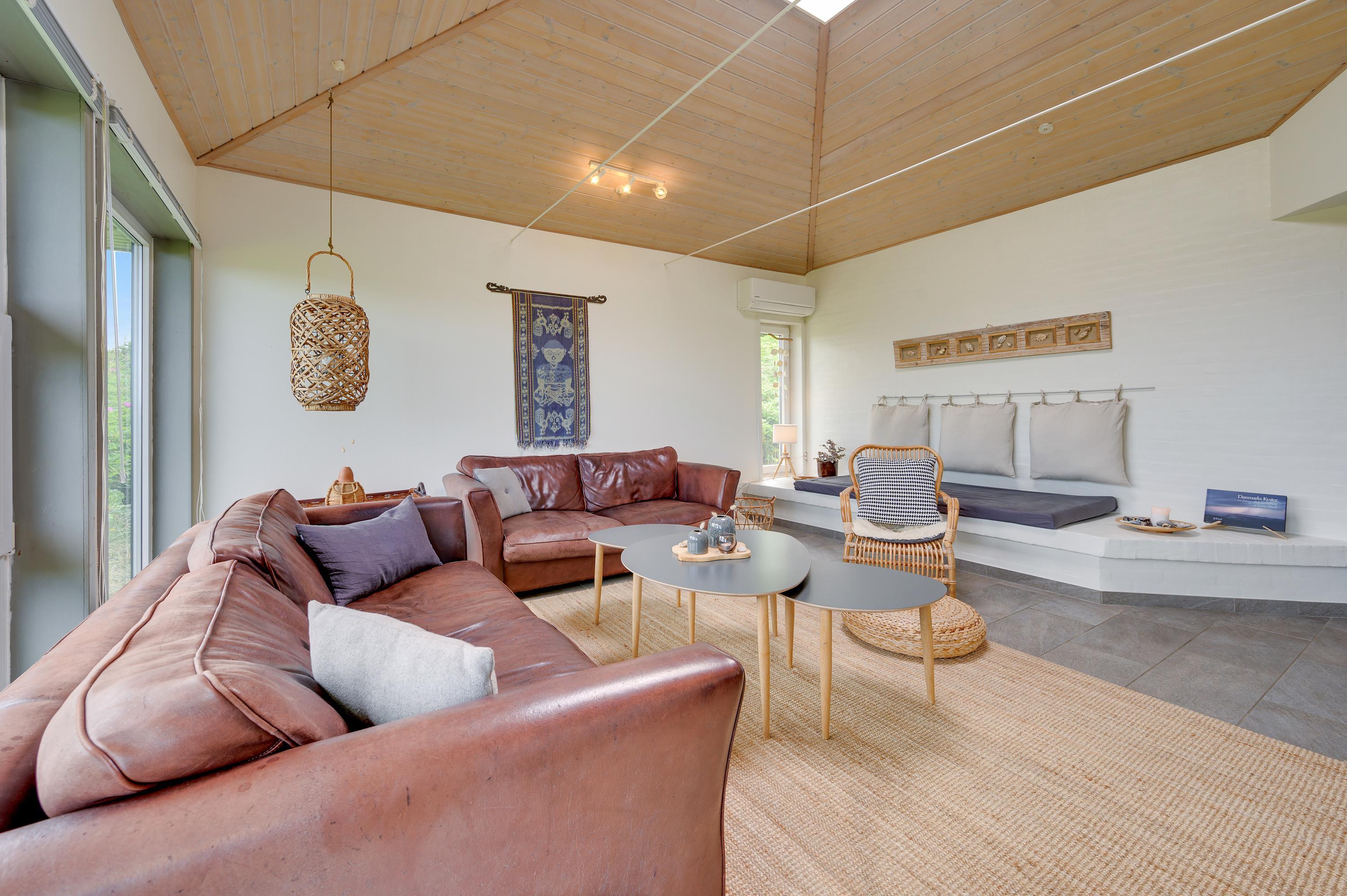 Sommerhusets hjerterum er den hyggelige og velindrettede stue, der ligger i åben forbindelse med køkken og spiseplads. De store vinduespartier gør rummet særdeles lyst og indbydende, og I vil hurtigt føle jer hjemme i den moderne indretning.