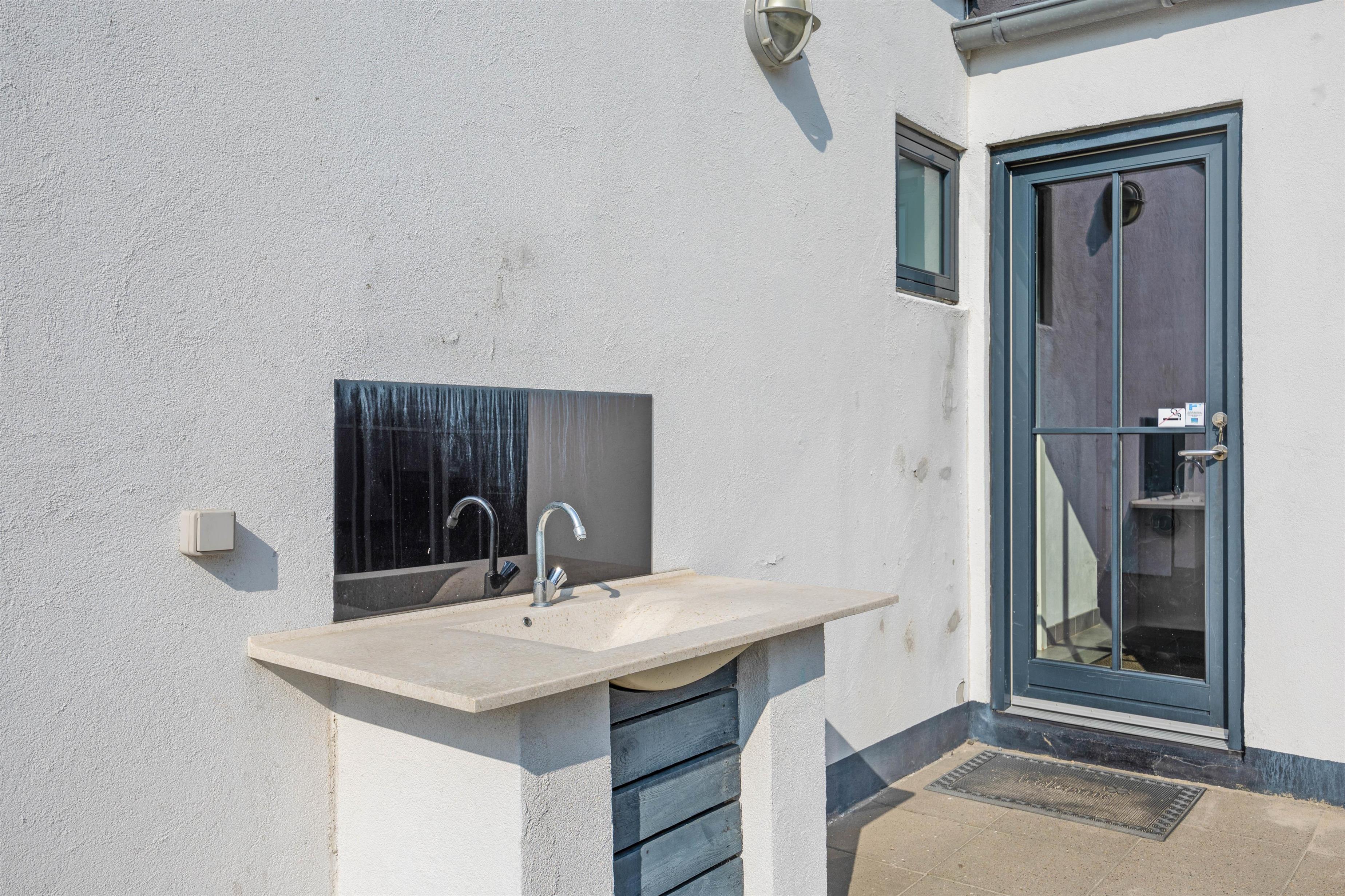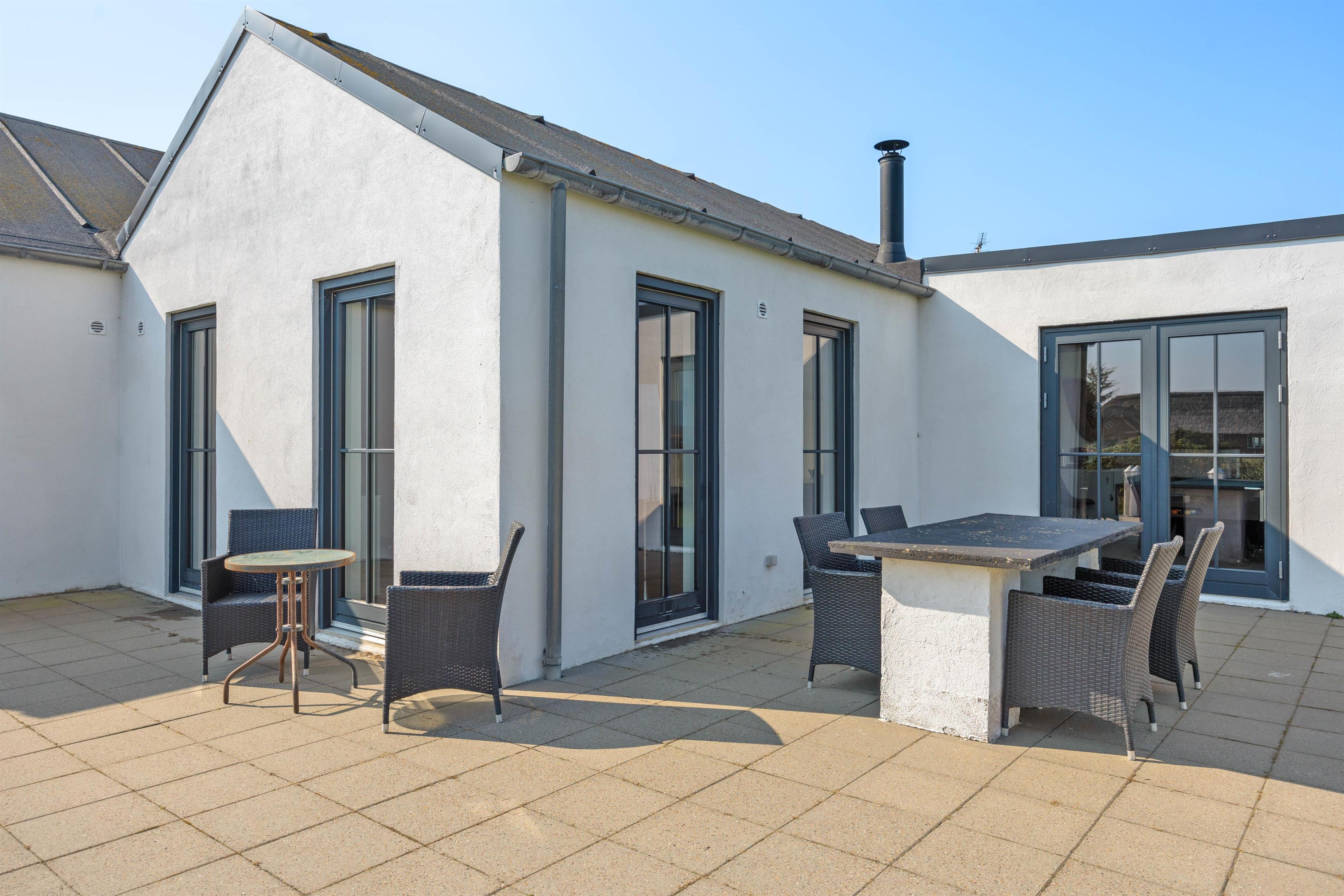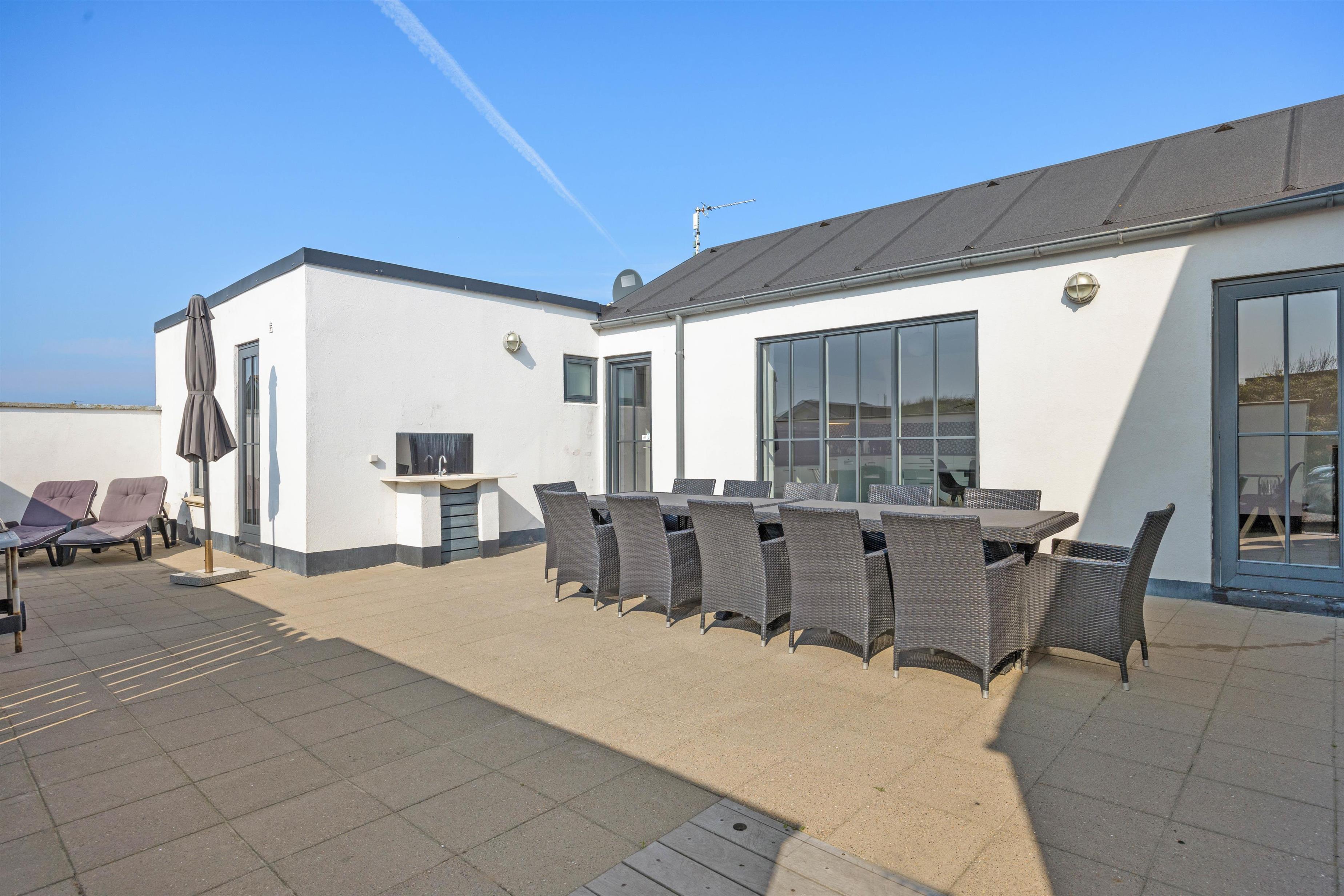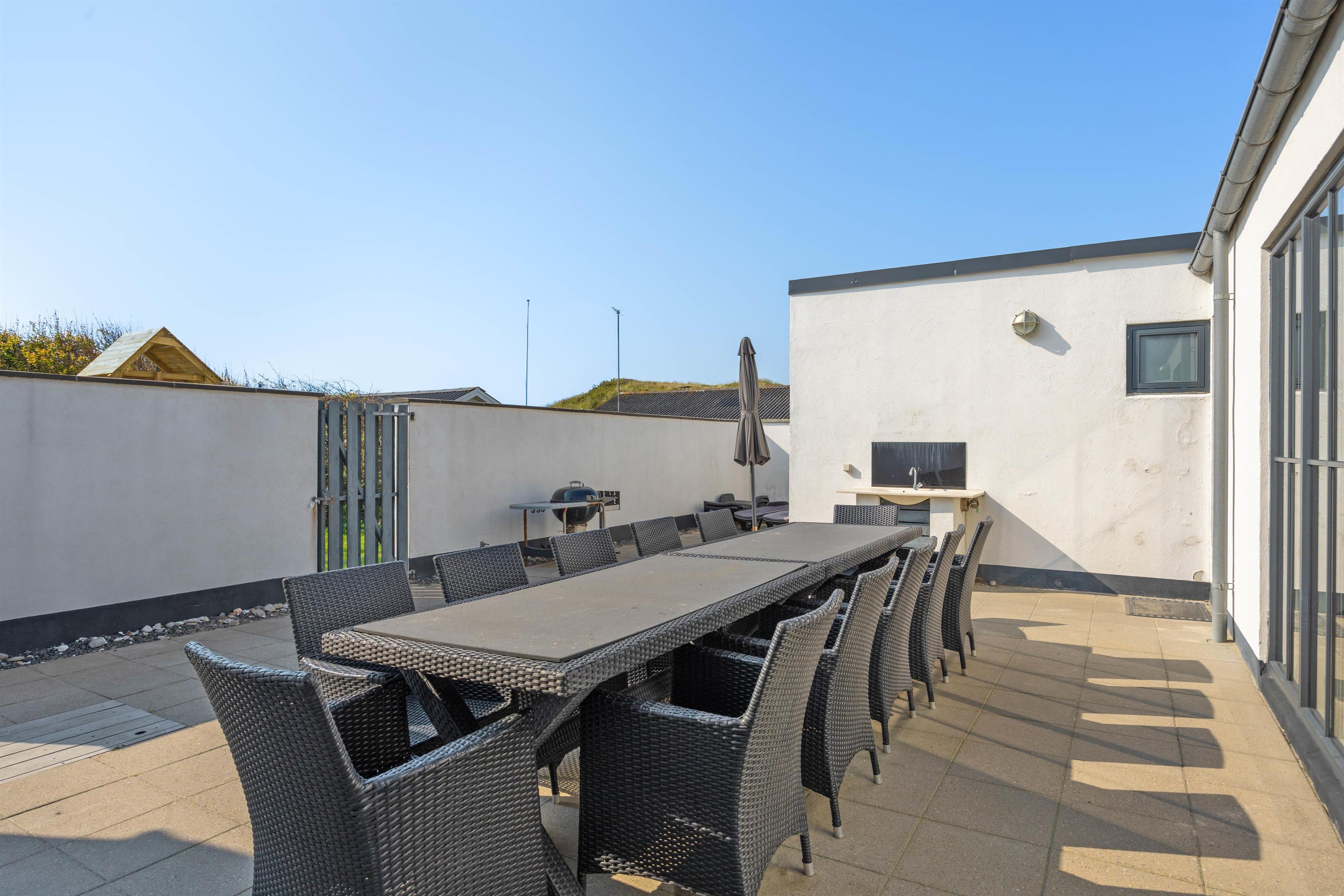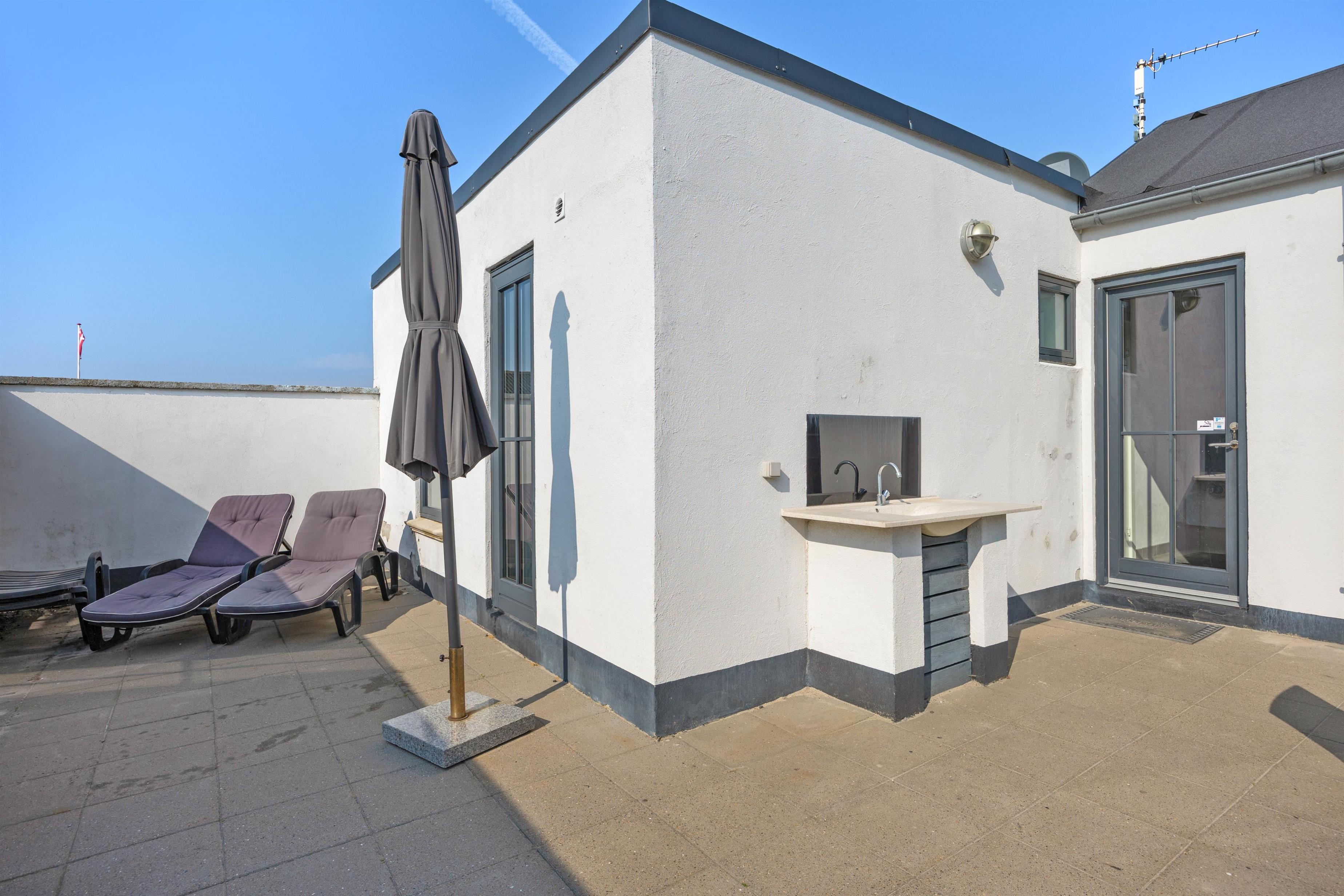 Og mod syd har du helt aflukket terrasse, hvor du uforstyrret kan sidde og nyde solen og den friske luft. Her er der gode havemøbler, en grill og sogar et lille udekøkken med håndvask, som er helt perfekt, når du skal grille.