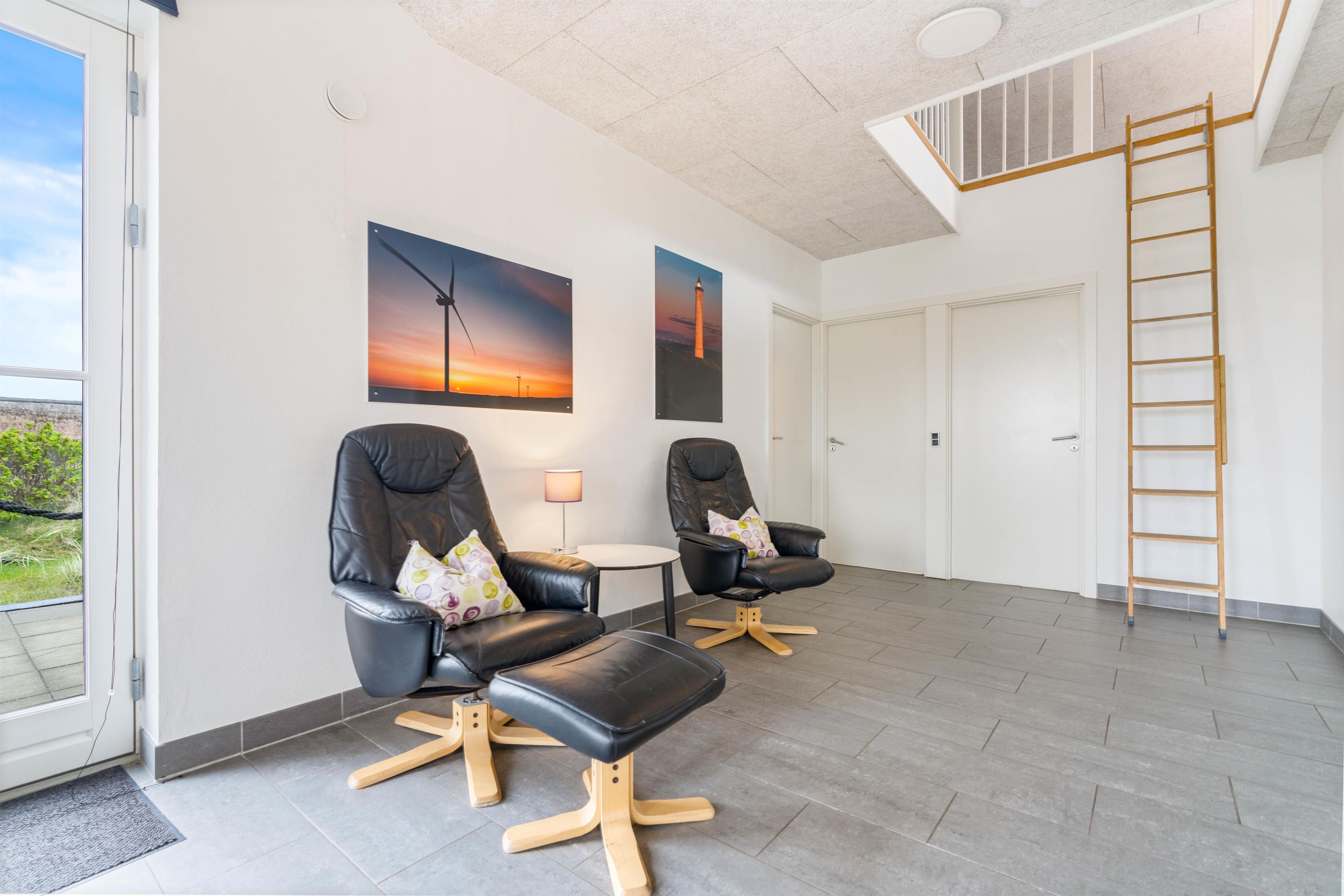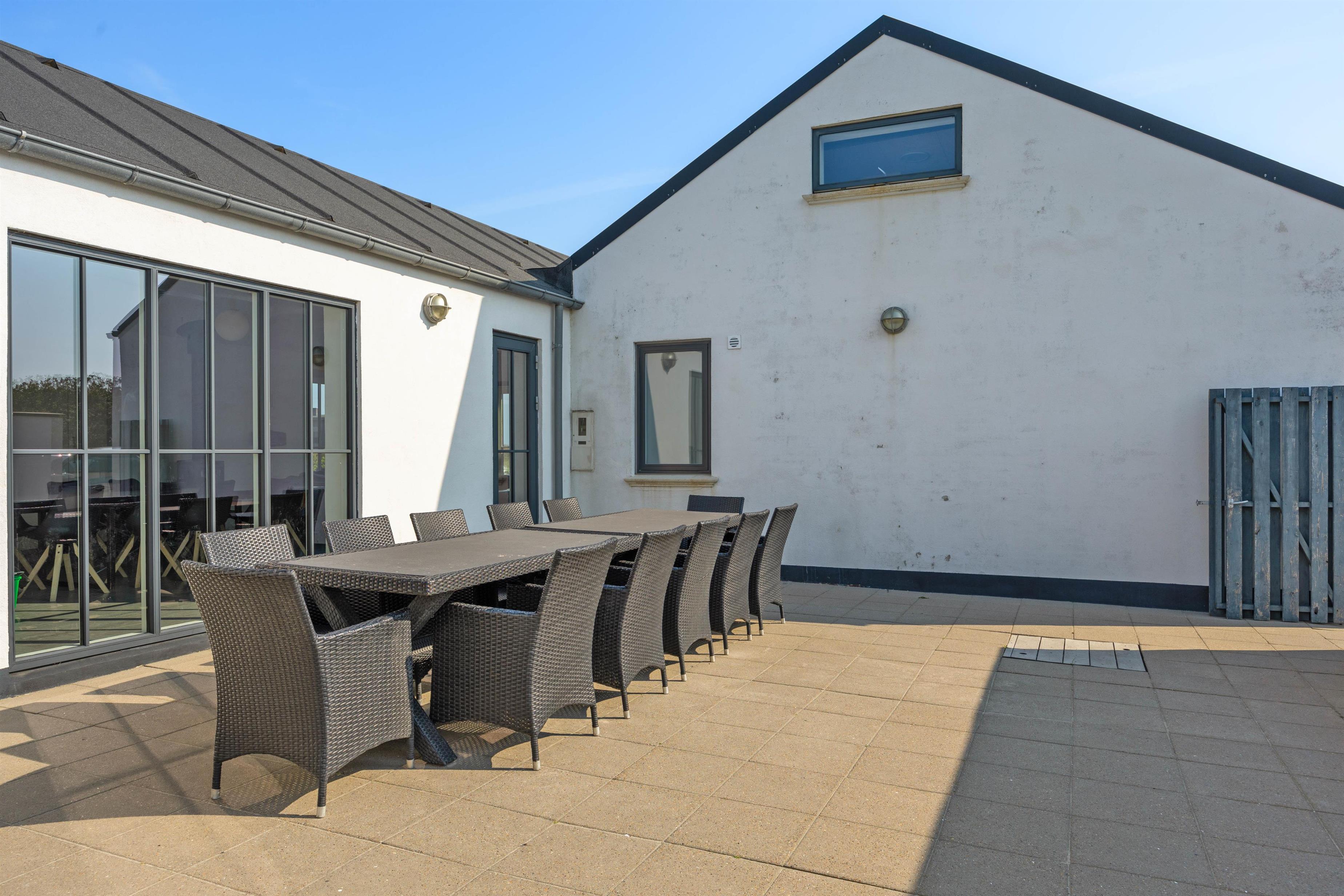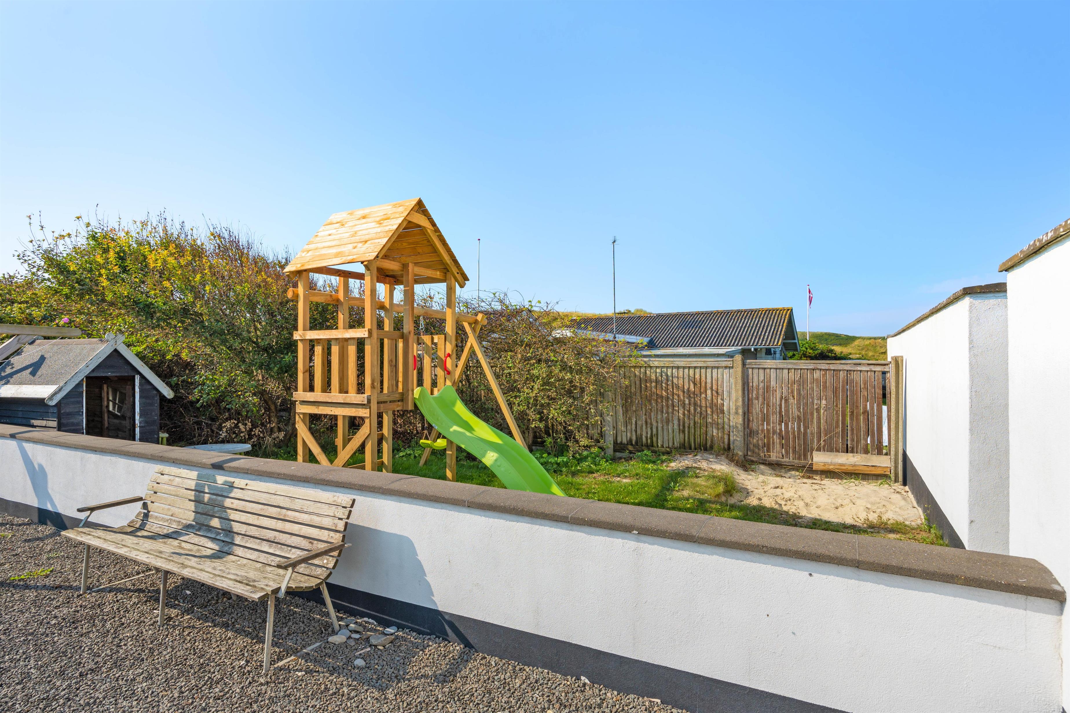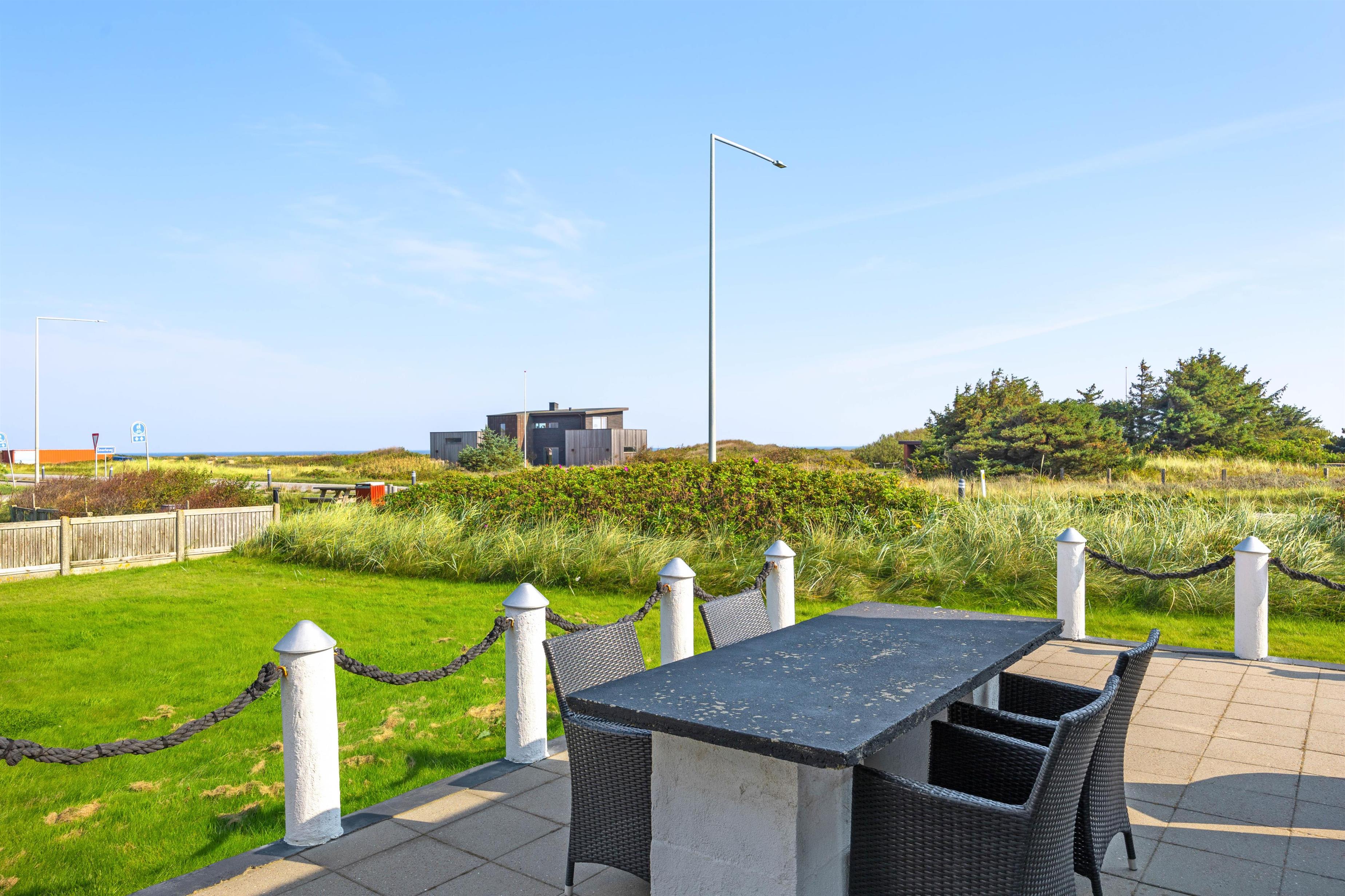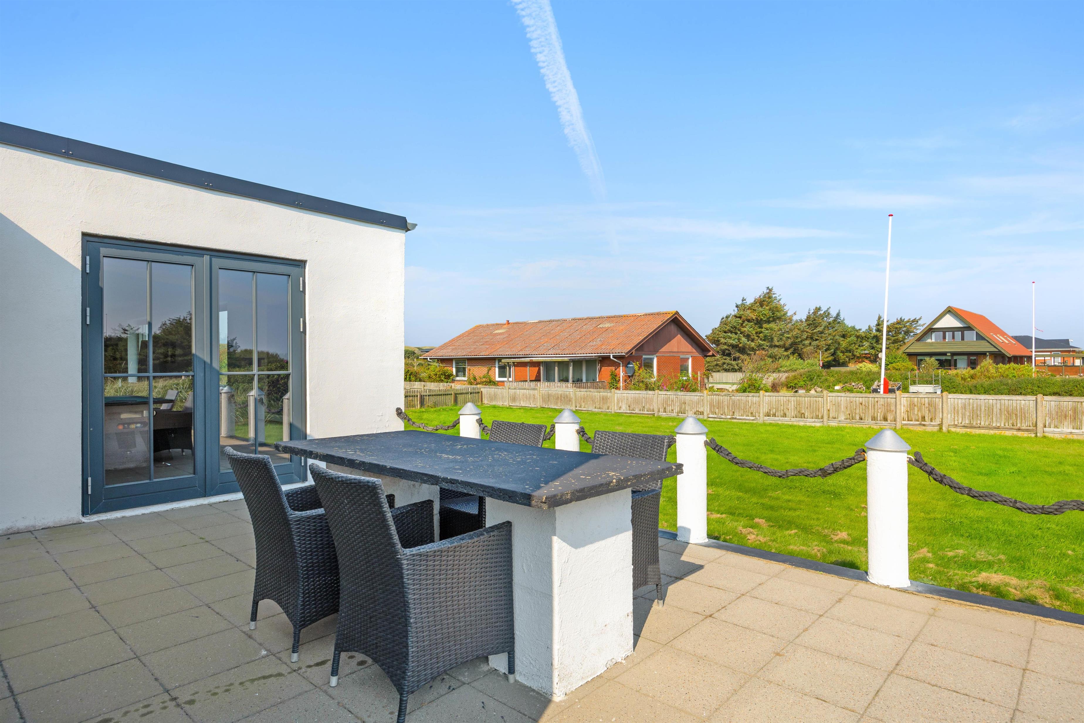 Der er to skønne terrasser ved feriehuset. Én i nordøst, som er helt ideel, når du gerne vil sidde ude og nyde morgenkaffen og udsigten til Ringkøbing Fjord. Og ved siden af denne terrasse har du en gæsplæne, hvor børnene kan lege og spille bold.